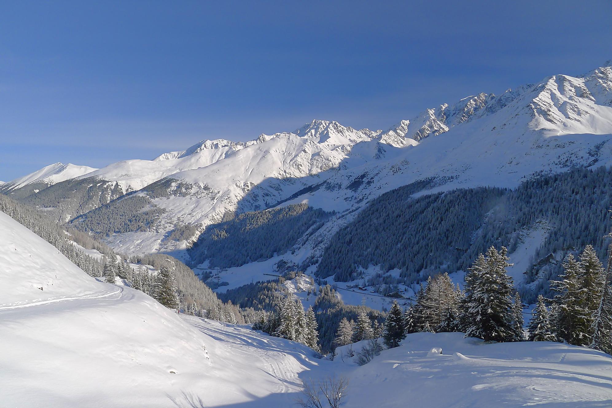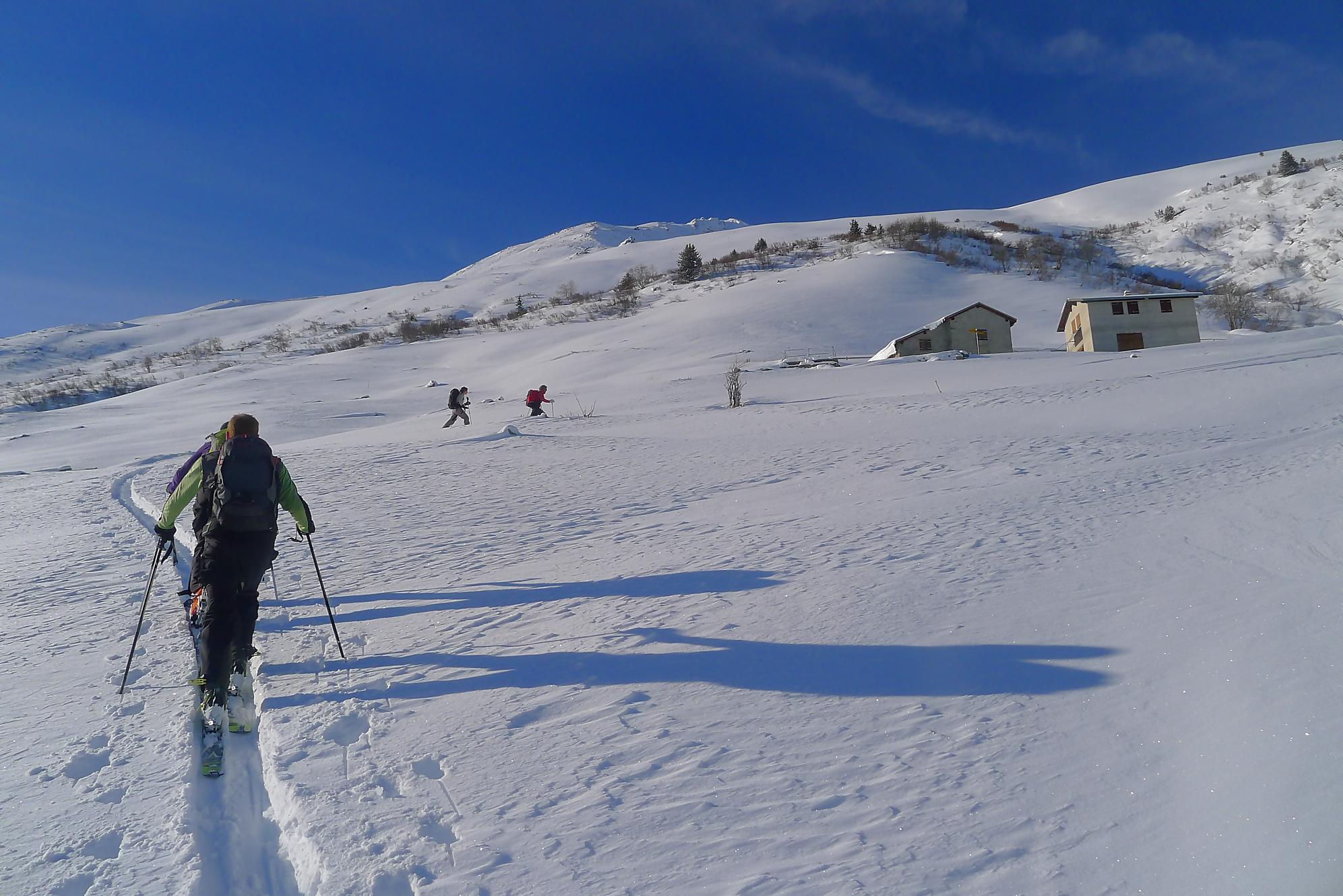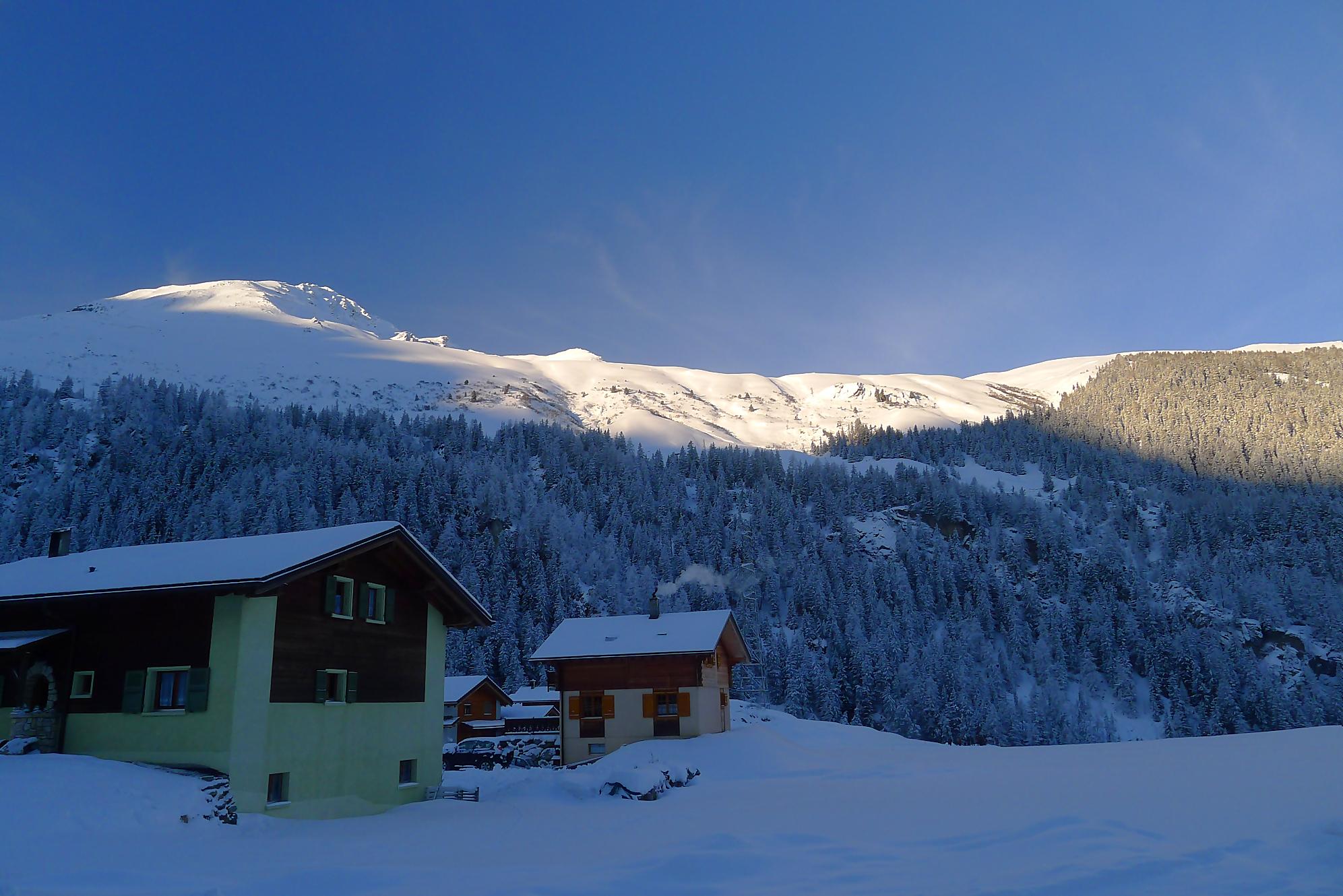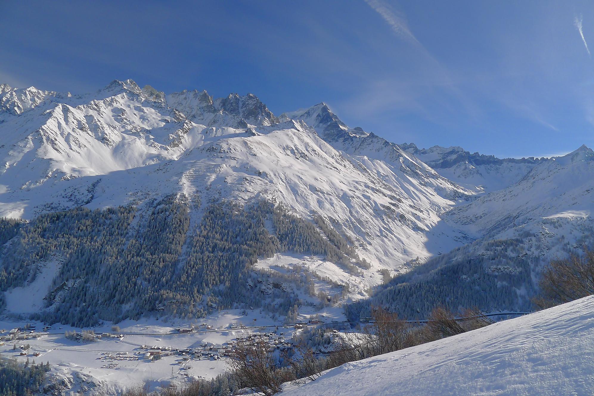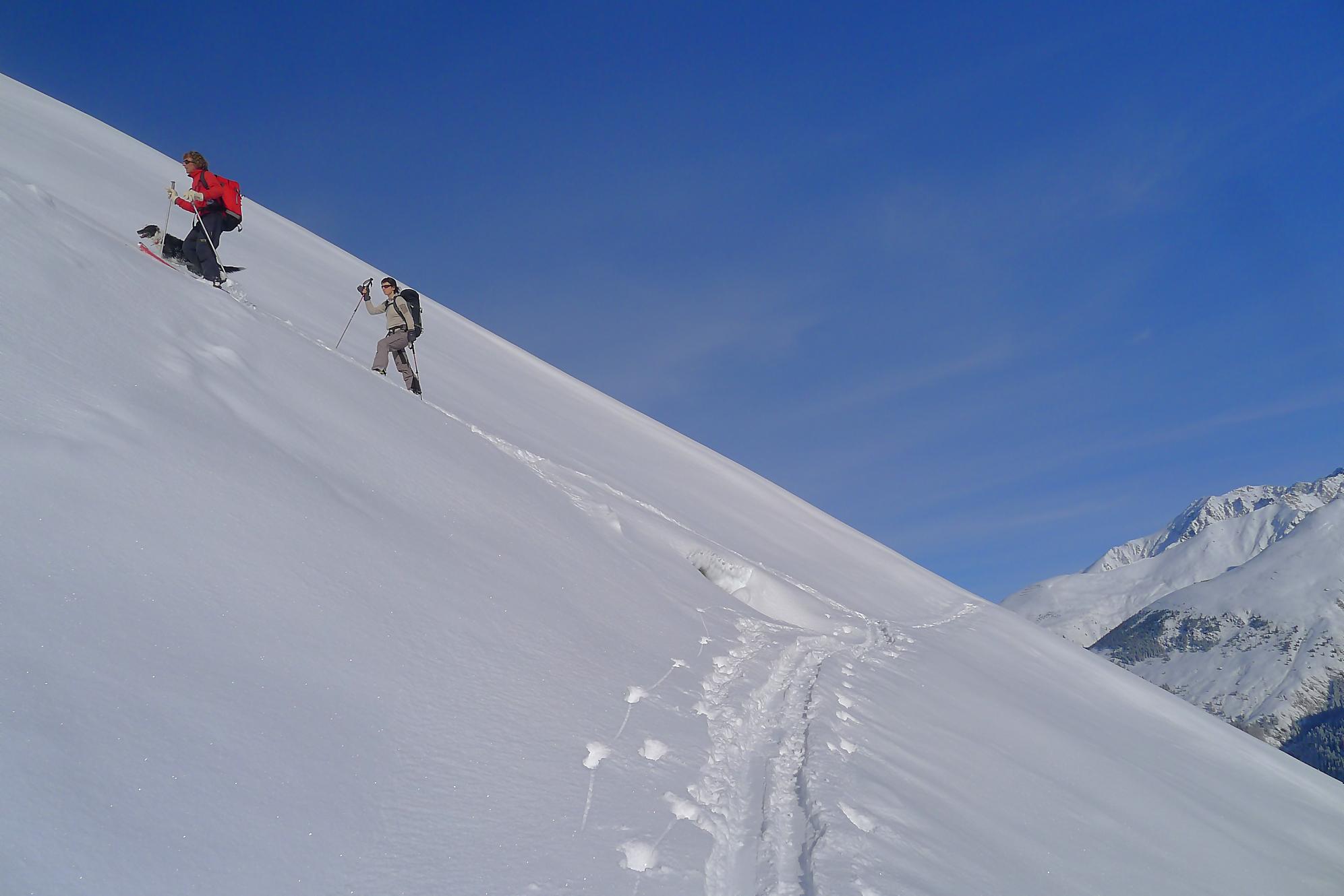 Une petite pause sur le plateau puis descente à l’ombre pour traverser un ruisseau et repartir en montée au soleil dans la Chaux de Champ Long. C’est assez tranquille car la pente est inférieure à 30°. On rejoins sans soucis le vaste plateau sommital de Crêta de Vella (2519m). Le panorama est très agréable, nous sommes entourés de quelques 4000m et le paysage ratisse un peu en Italie, la France et la part du lion est en Suisse. La température est de -10°c, mais sans vent et au soleil, ce fut très agréable.
