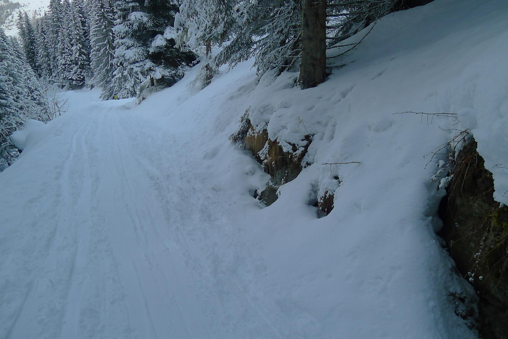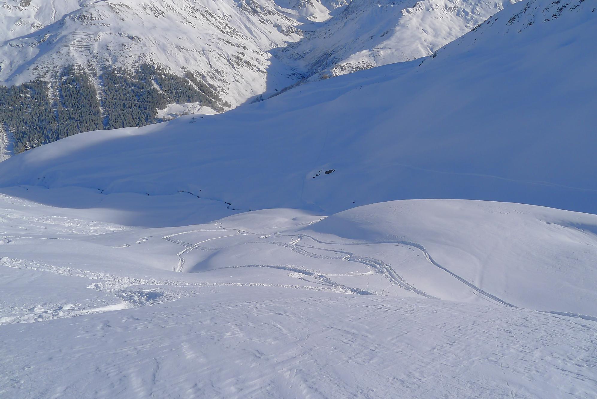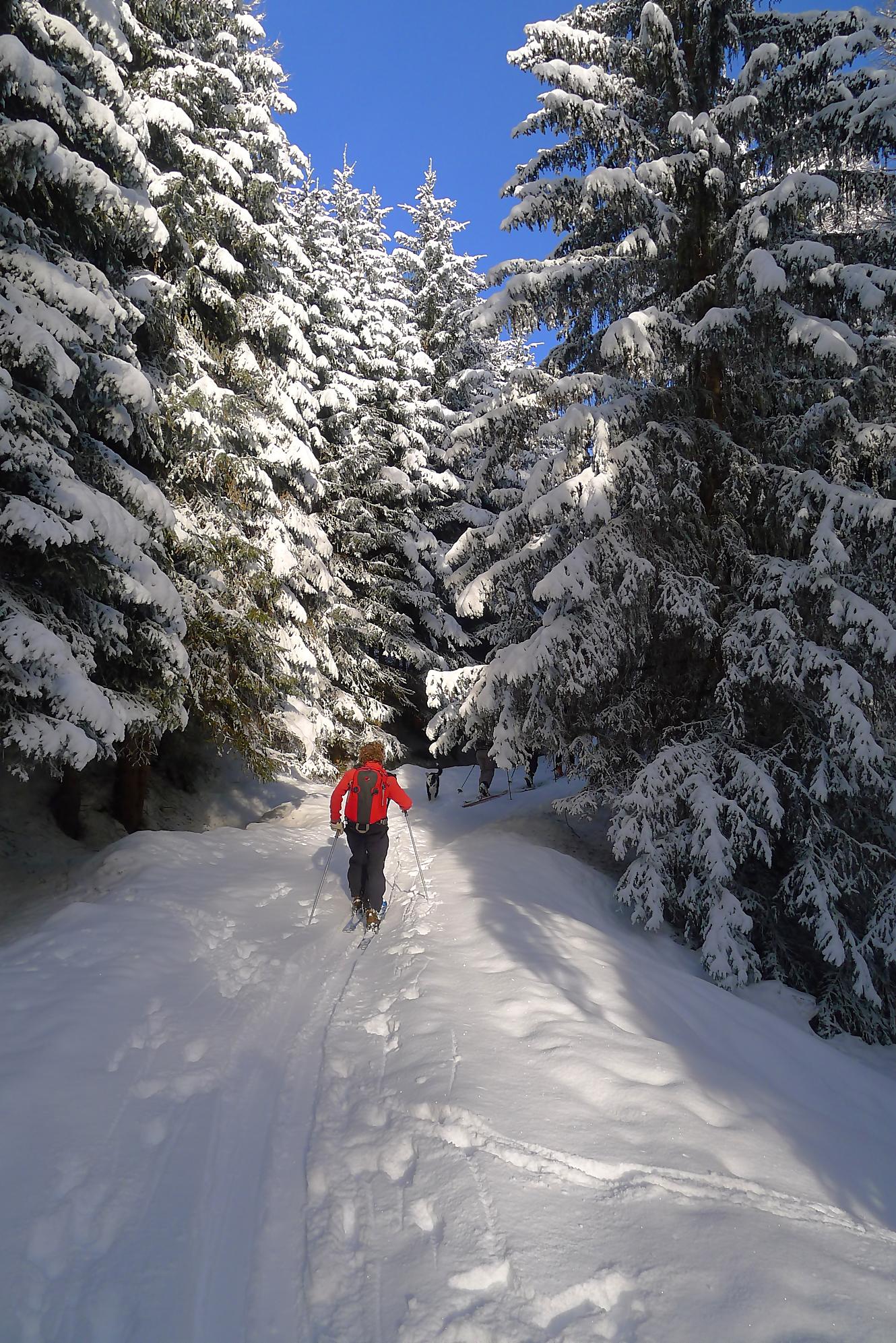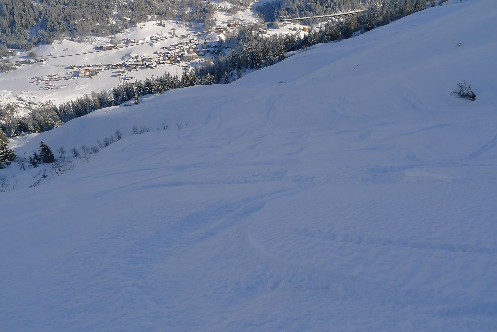 Après la pause, le groupe descend sur Liddes, comme je l’ai déjà réalisé la semaine dernière, je les laisse aller et descend sur les traces de montée. Une neige excellente, gavage de poudre et soleil, l’overdose n’existant pas. Après le ruisseau, retour à l’ombre pour une partie de pousse bâtons et passer sous la ferme de Champ Long. On retrouve la pente juste après, dans une neige poudreuse sur fond cartonnée moins agréable. Il faut se jouer des aulnes prêts à vous foncer dessus. Puis on retrouve la route de la montée qui se descend telle une piste de luge.