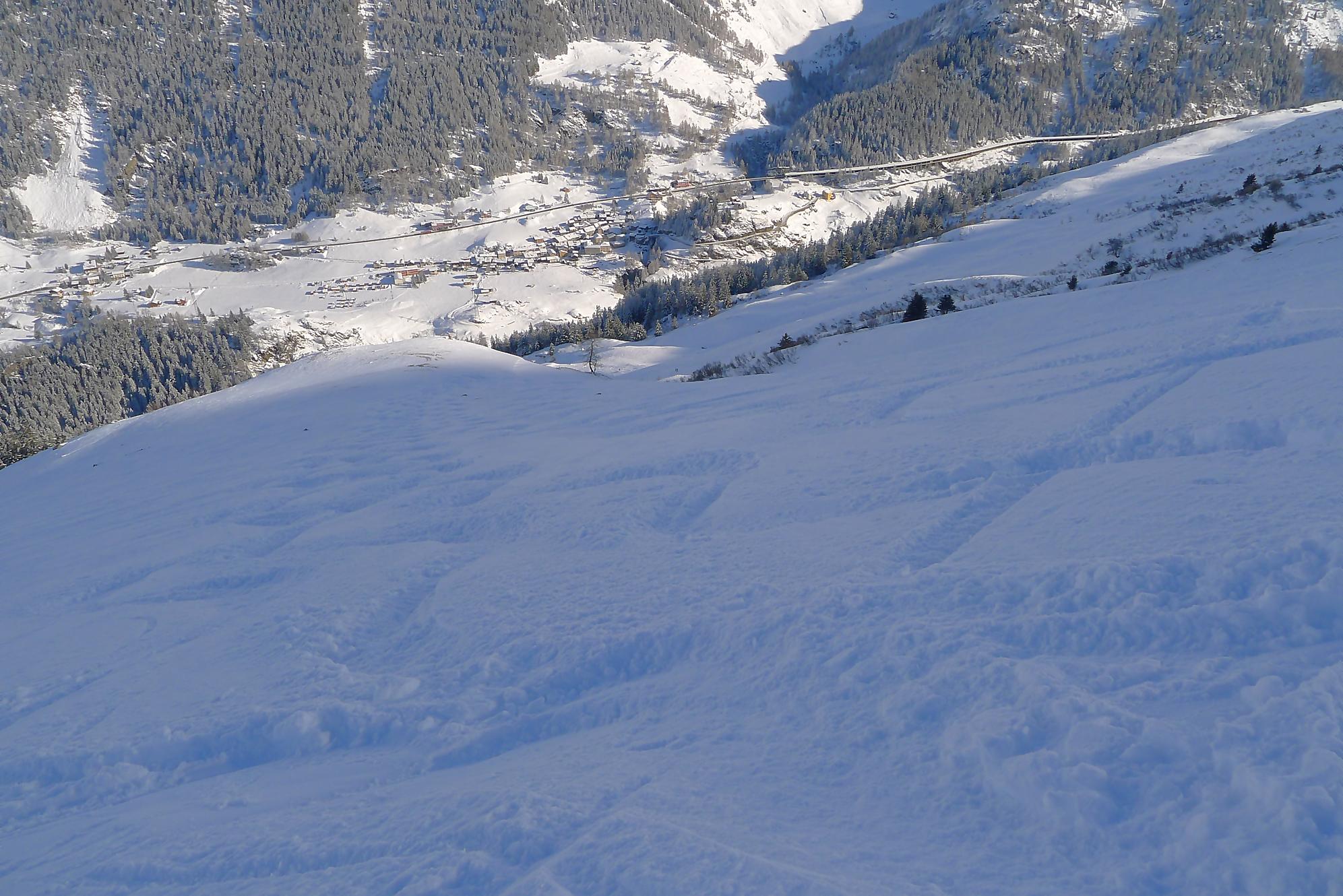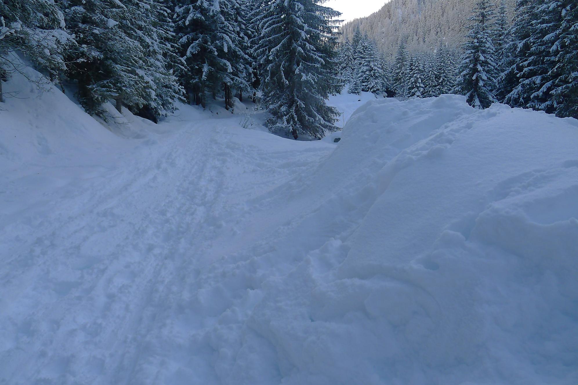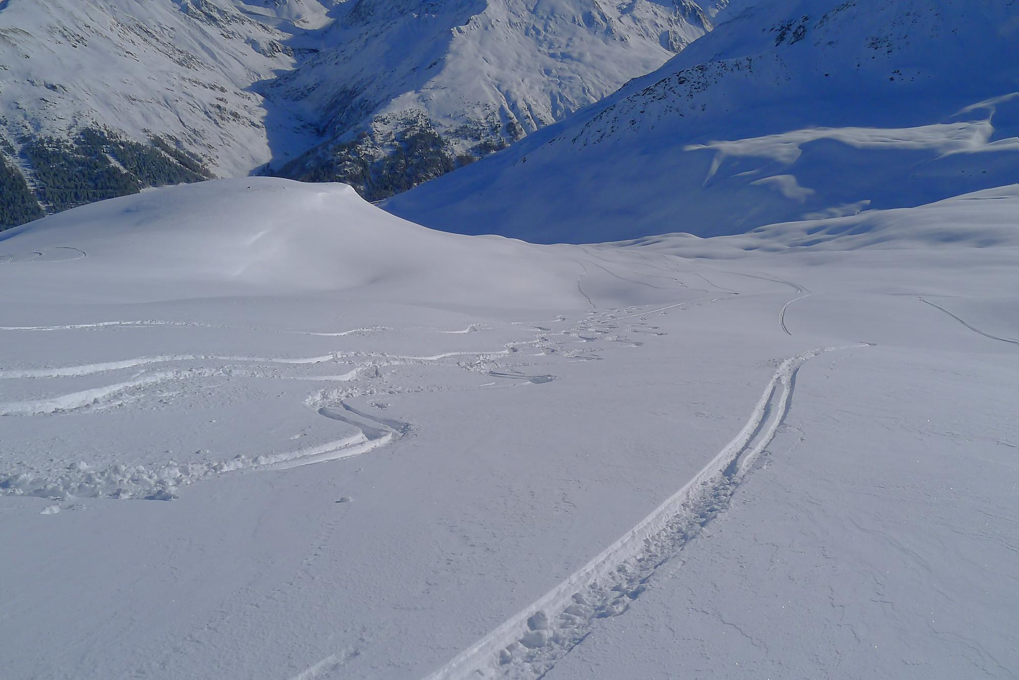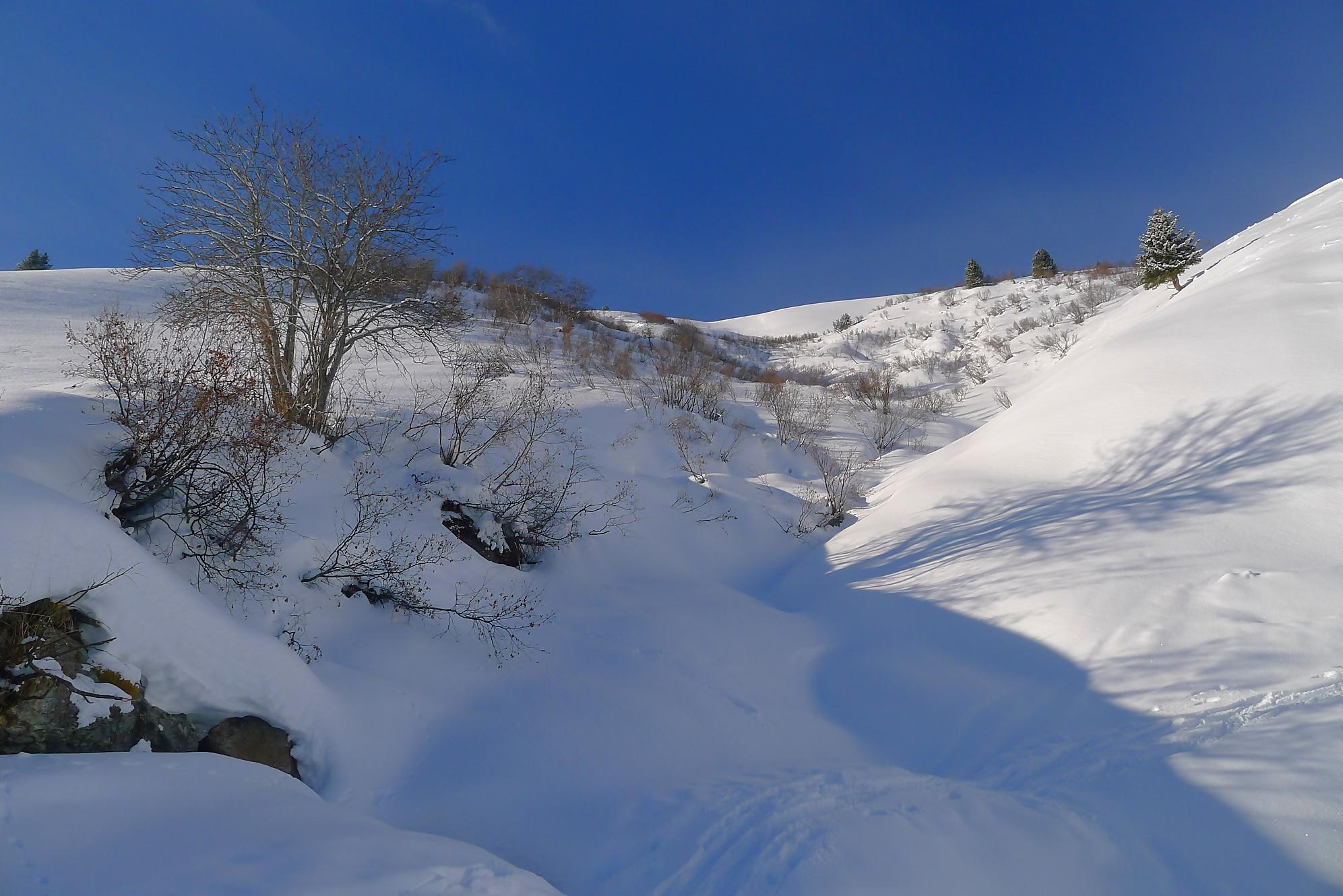 Après la pause, le groupe descend sur Liddes, comme je l’ai déjà réalisé la semaine dernière, je les laisse aller et descend sur les traces de montée. Une neige excellente, gavage de poudre et soleil, l’overdose n’existant pas. Après le ruisseau, retour à l’ombre pour une partie de pousse bâtons et passer sous la ferme de Champ Long. On retrouve la pente juste après, dans une neige poudreuse sur fond cartonnée moins agréable. Il faut se jouer des aulnes prêts à vous foncer dessus. Puis on retrouve la route de la montée qui se descend telle une piste de luge.