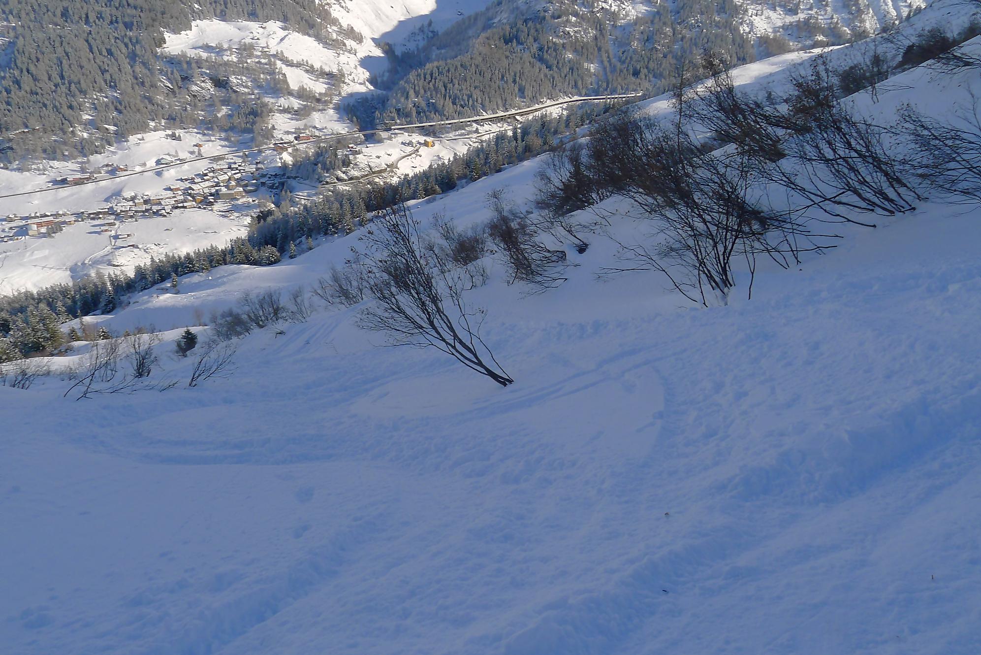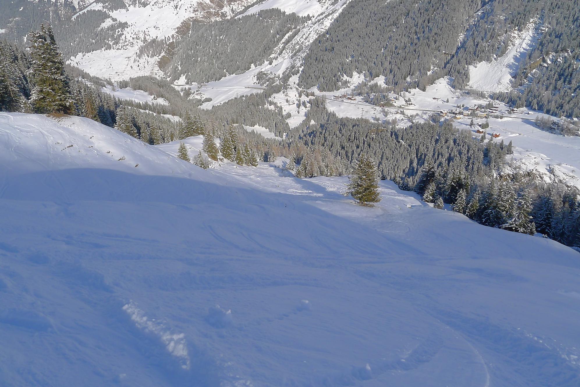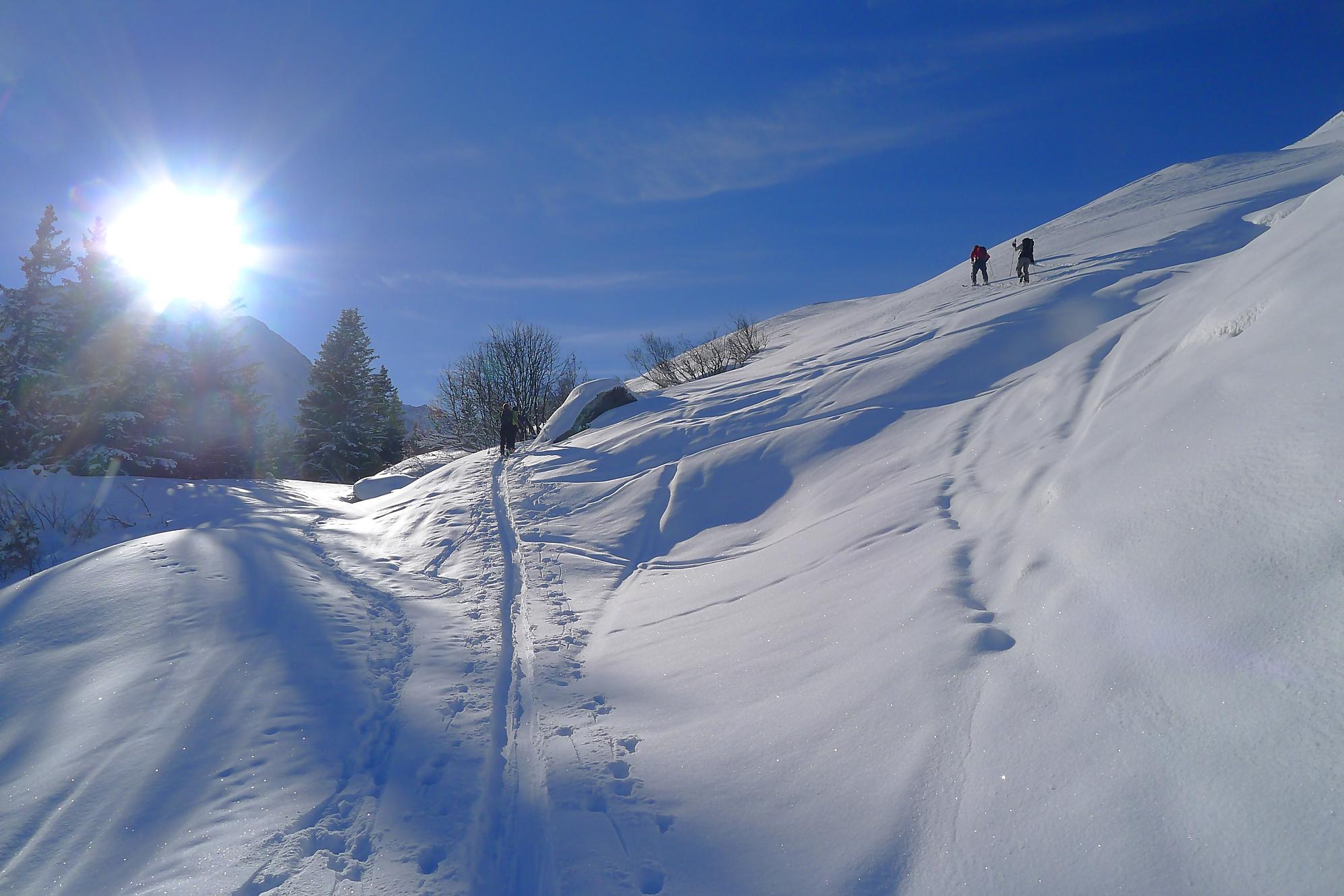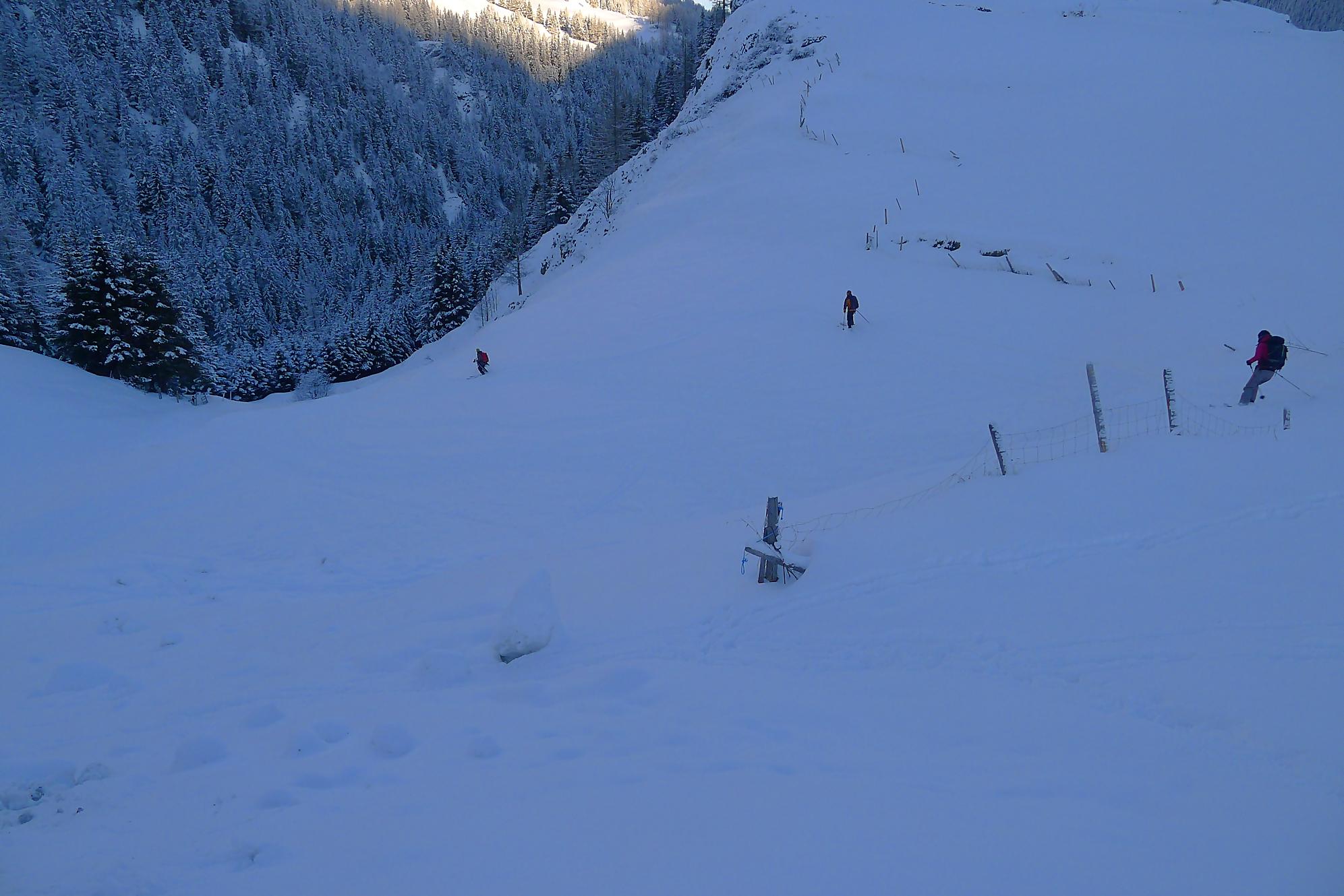 Après la pause, le groupe descend sur Liddes, comme je l’ai déjà réalisé la semaine dernière, je les laisse aller et descend sur les traces de montée. Une neige excellente, gavage de poudre et soleil, l’overdose n’existant pas. Après le ruisseau, retour à l’ombre pour une partie de pousse bâtons et passer sous la ferme de Champ Long. On retrouve la pente juste après, dans une neige poudreuse sur fond cartonnée moins agréable. Il faut se jouer des aulnes prêts à vous foncer dessus. Puis on retrouve la route de la montée qui se descend telle une piste de luge.