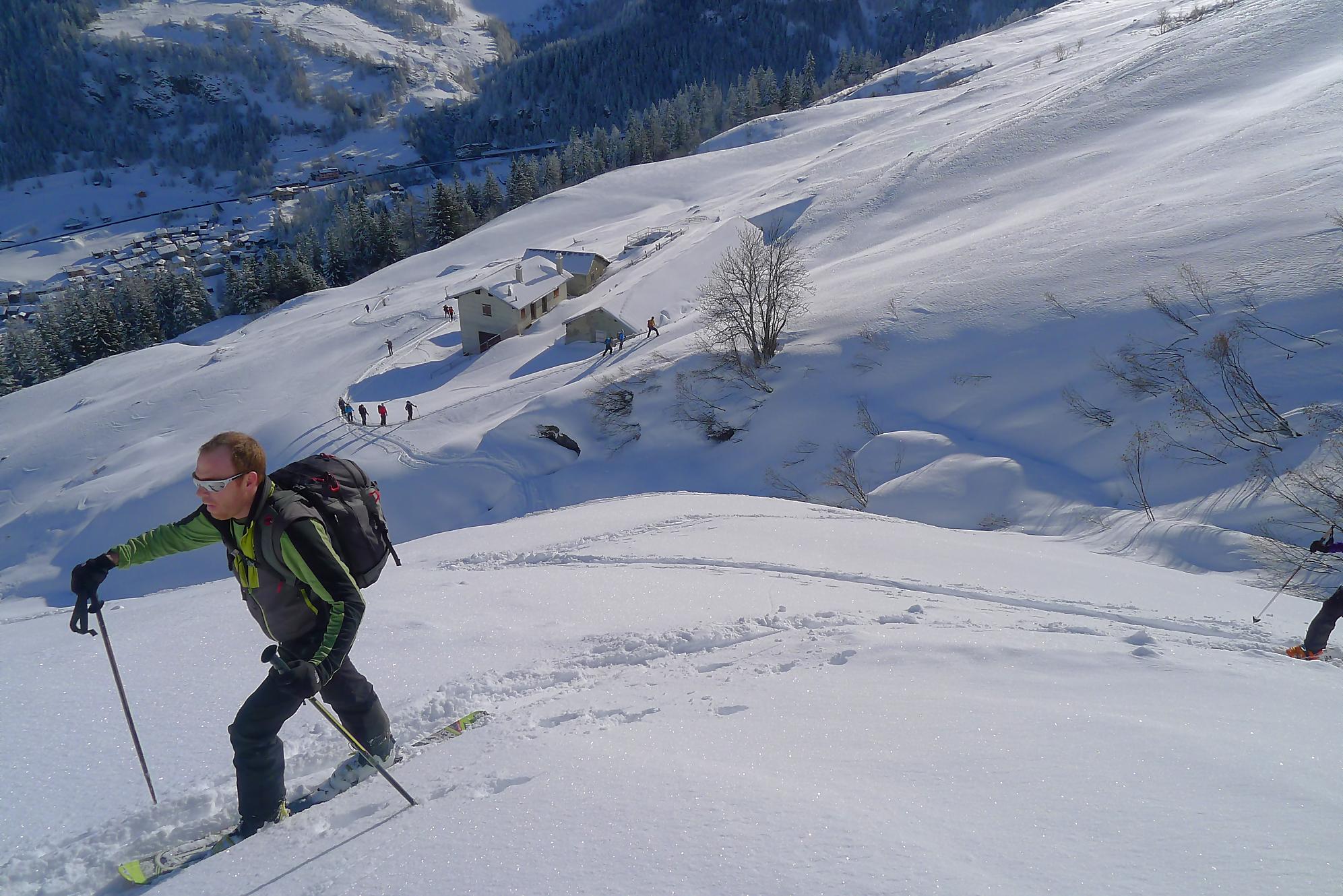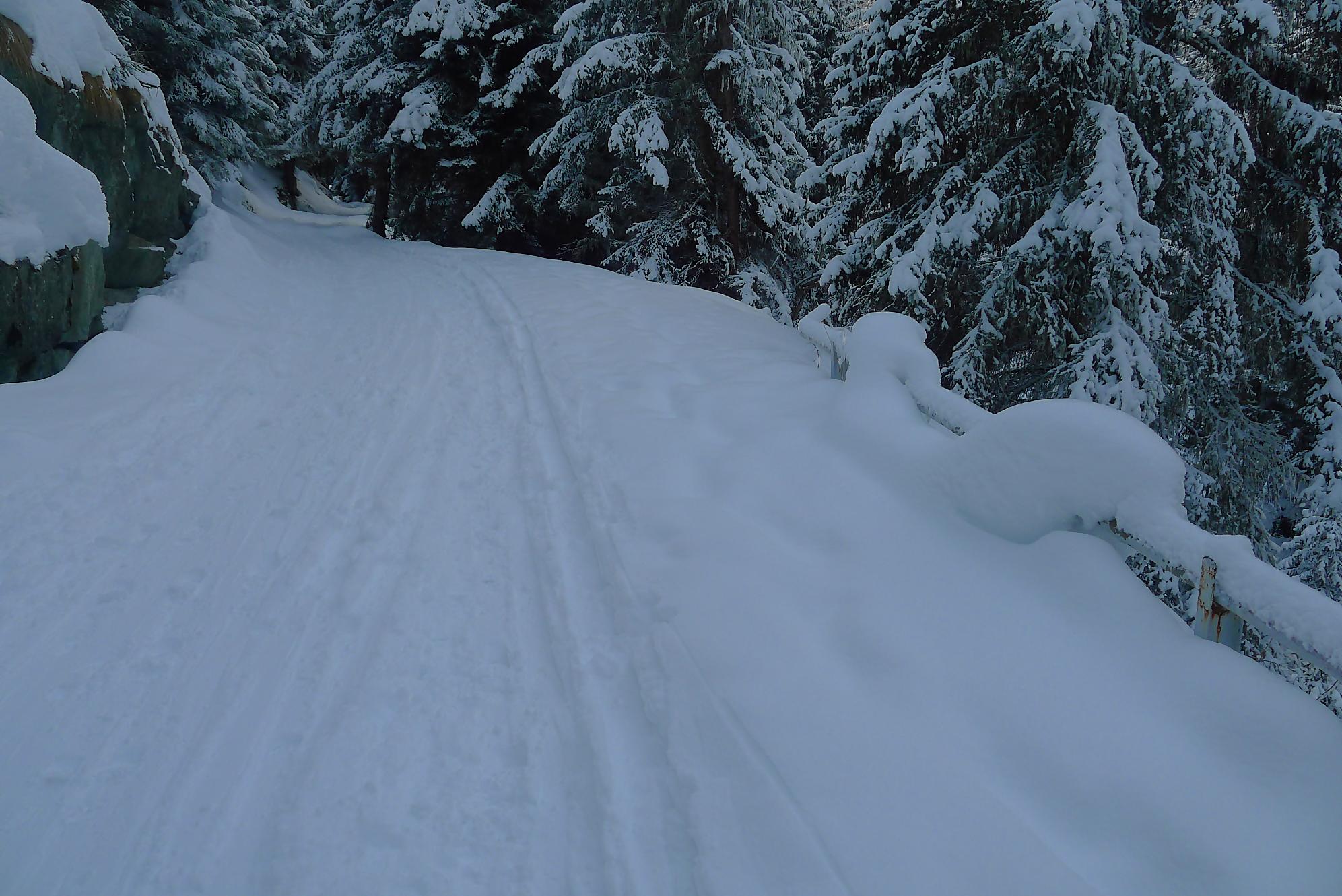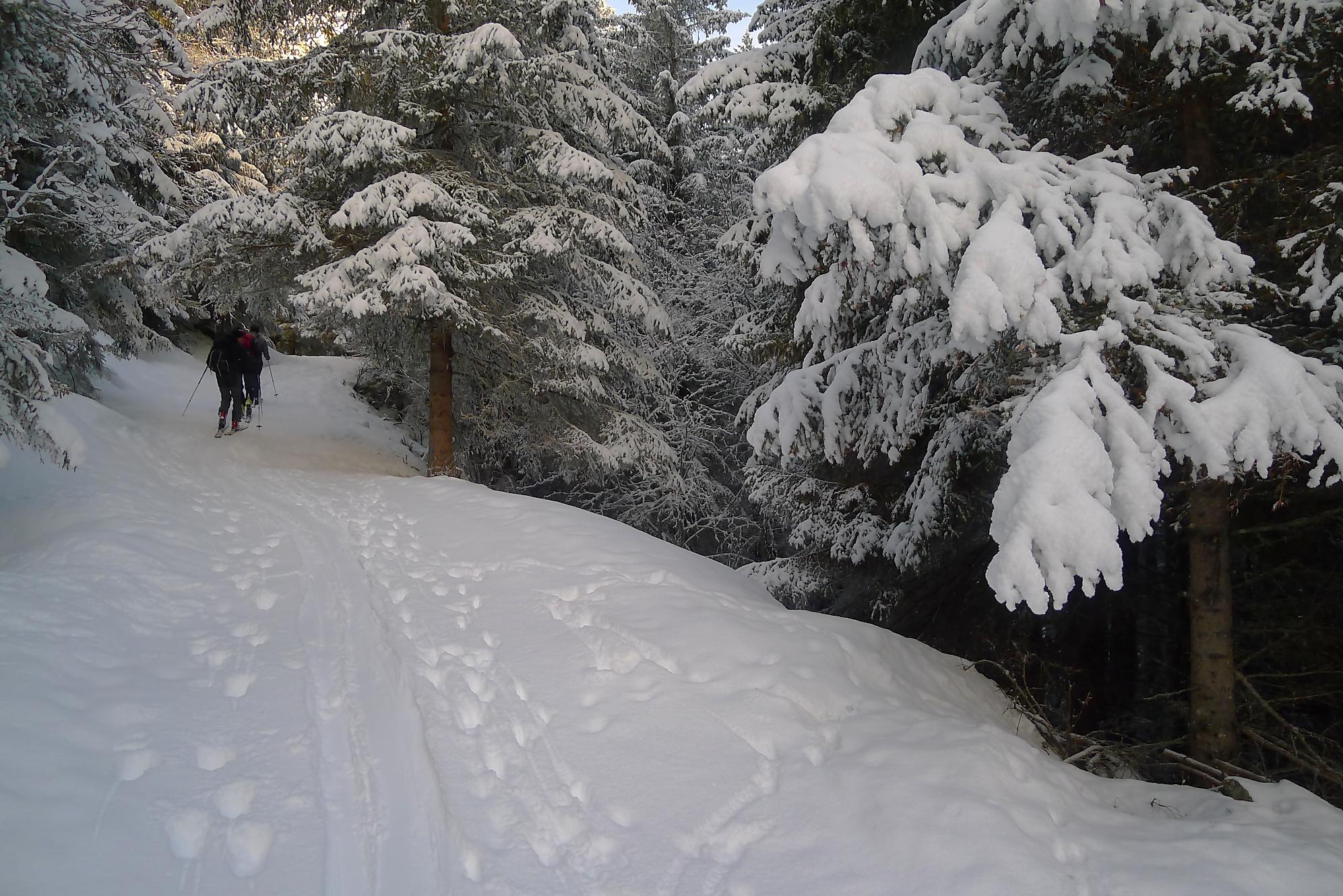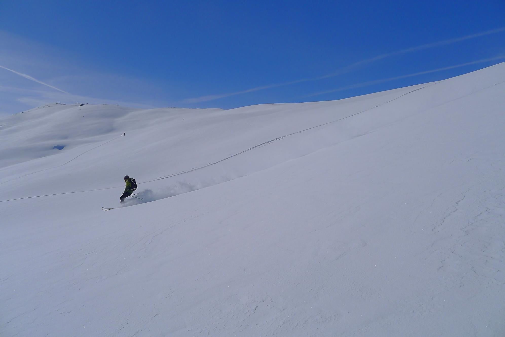 Après la pause, le groupe descend sur Liddes, comme je l’ai déjà réalisé la semaine dernière, je les laisse aller et descend sur les traces de montée. Une neige excellente, gavage de poudre et soleil, l’overdose n’existant pas. Après le ruisseau, retour à l’ombre pour une partie de pousse bâtons et passer sous la ferme de Champ Long. On retrouve la pente juste après, dans une neige poudreuse sur fond cartonnée moins agréable. Il faut se jouer des aulnes prêts à vous foncer dessus. Puis on retrouve la route de la montée qui se descend telle une piste de luge.
