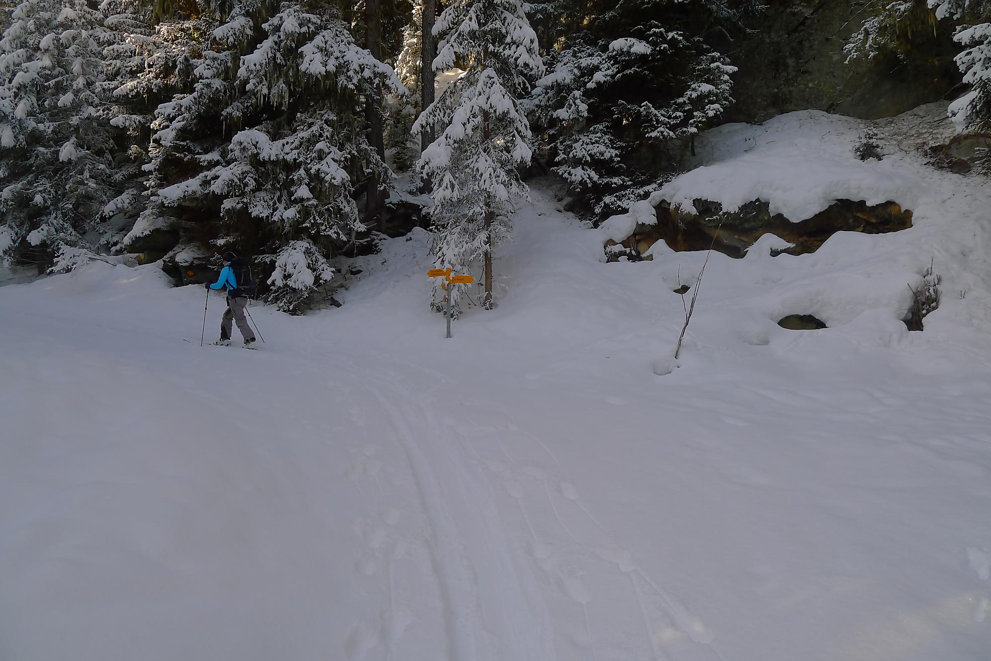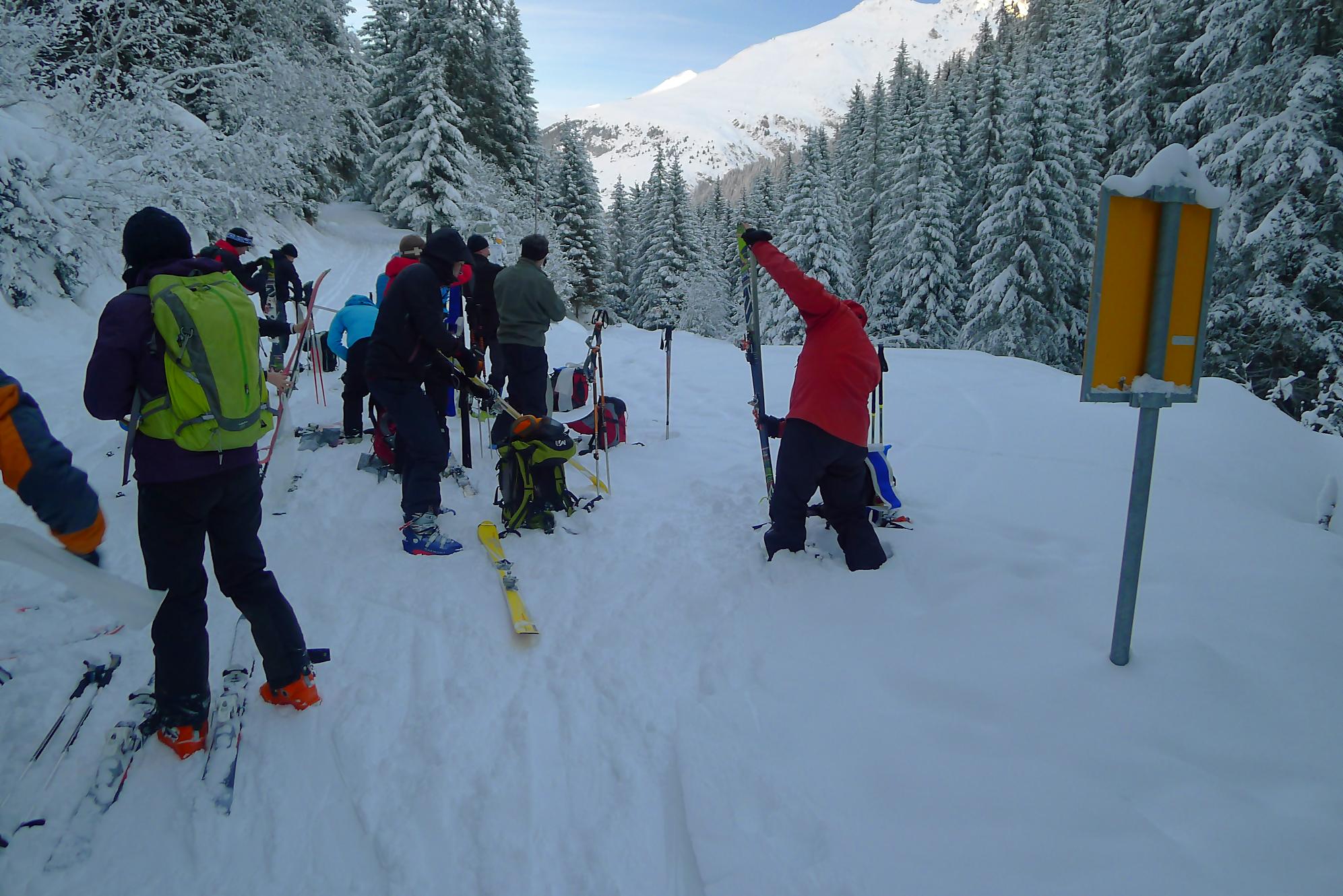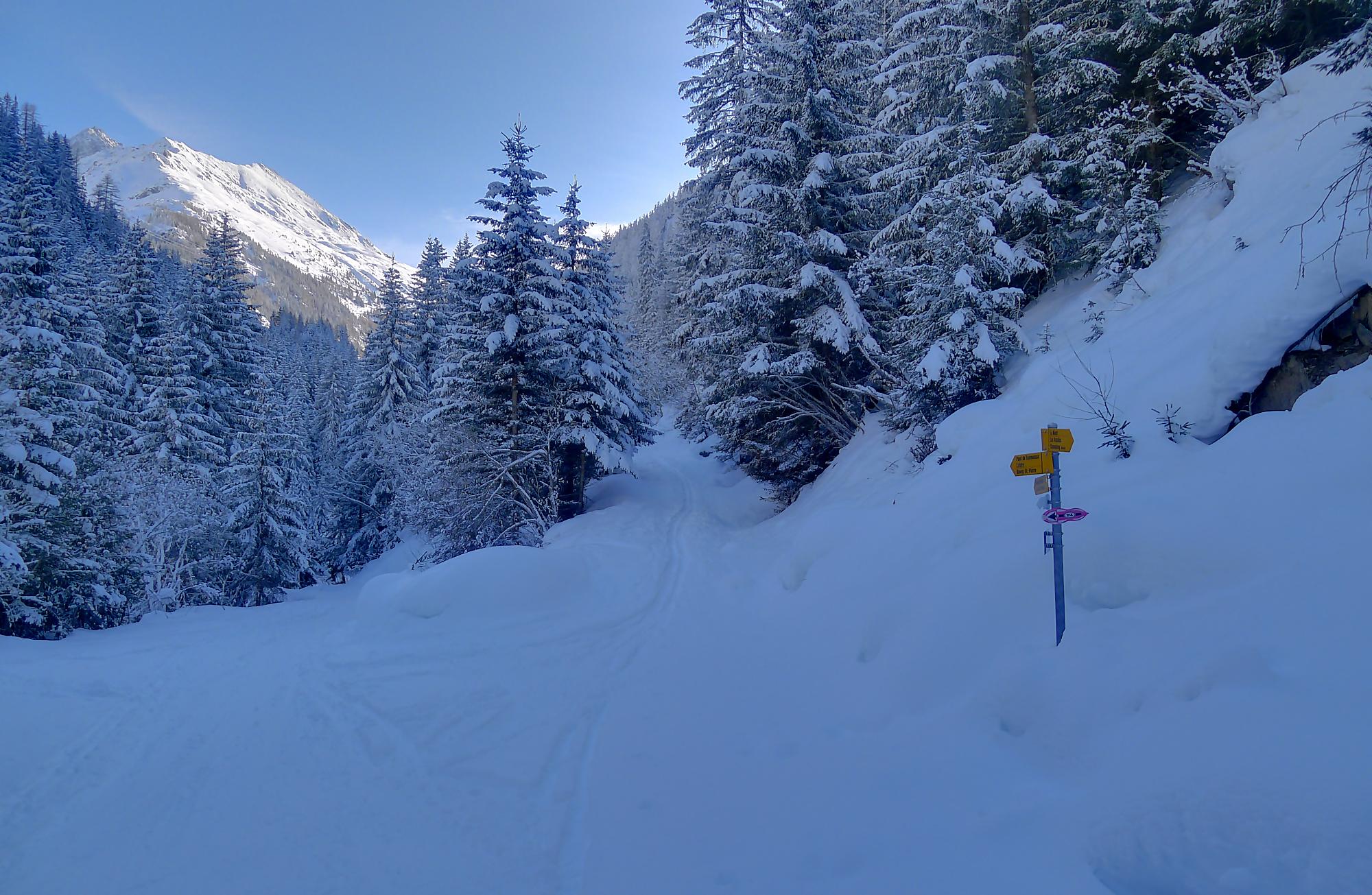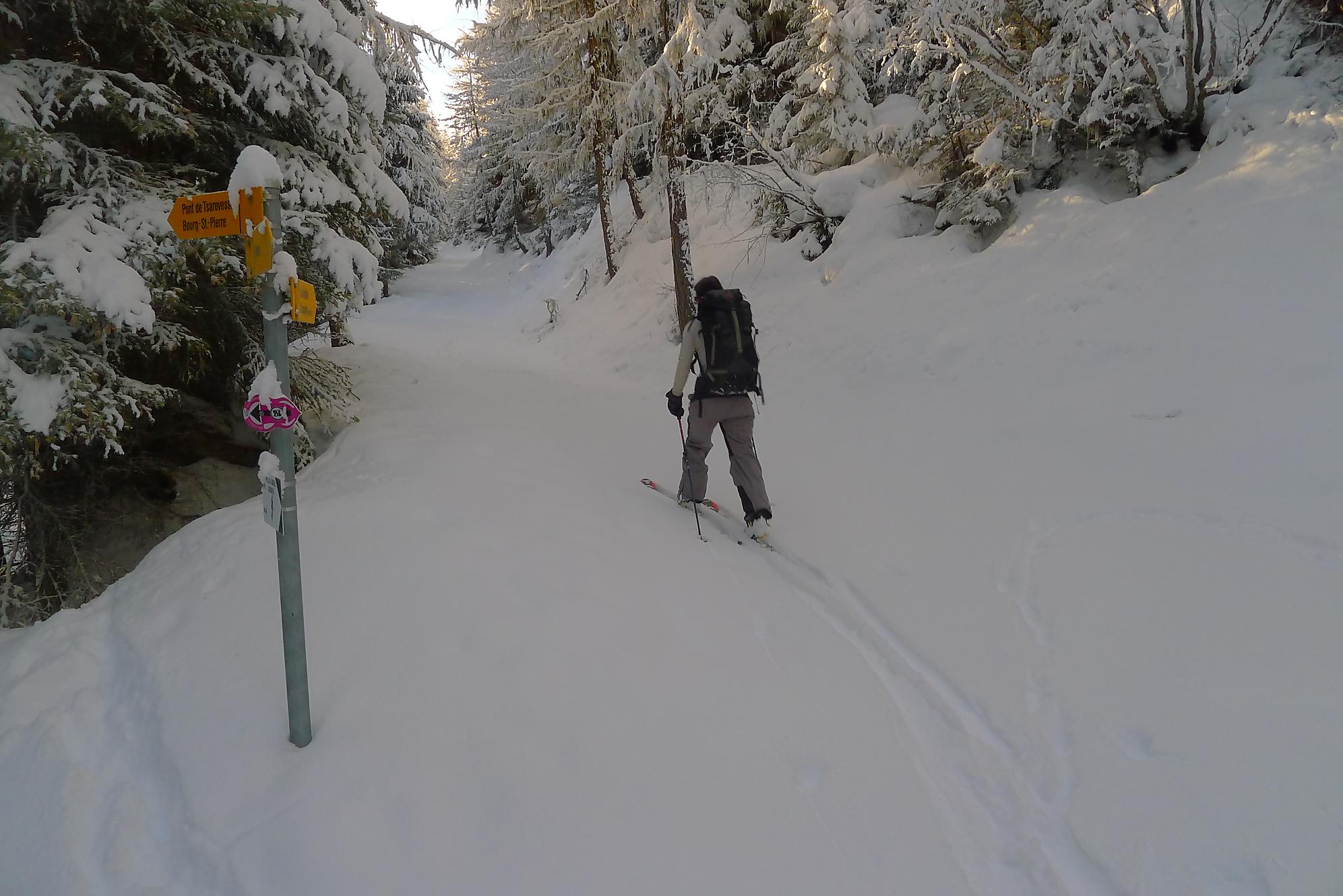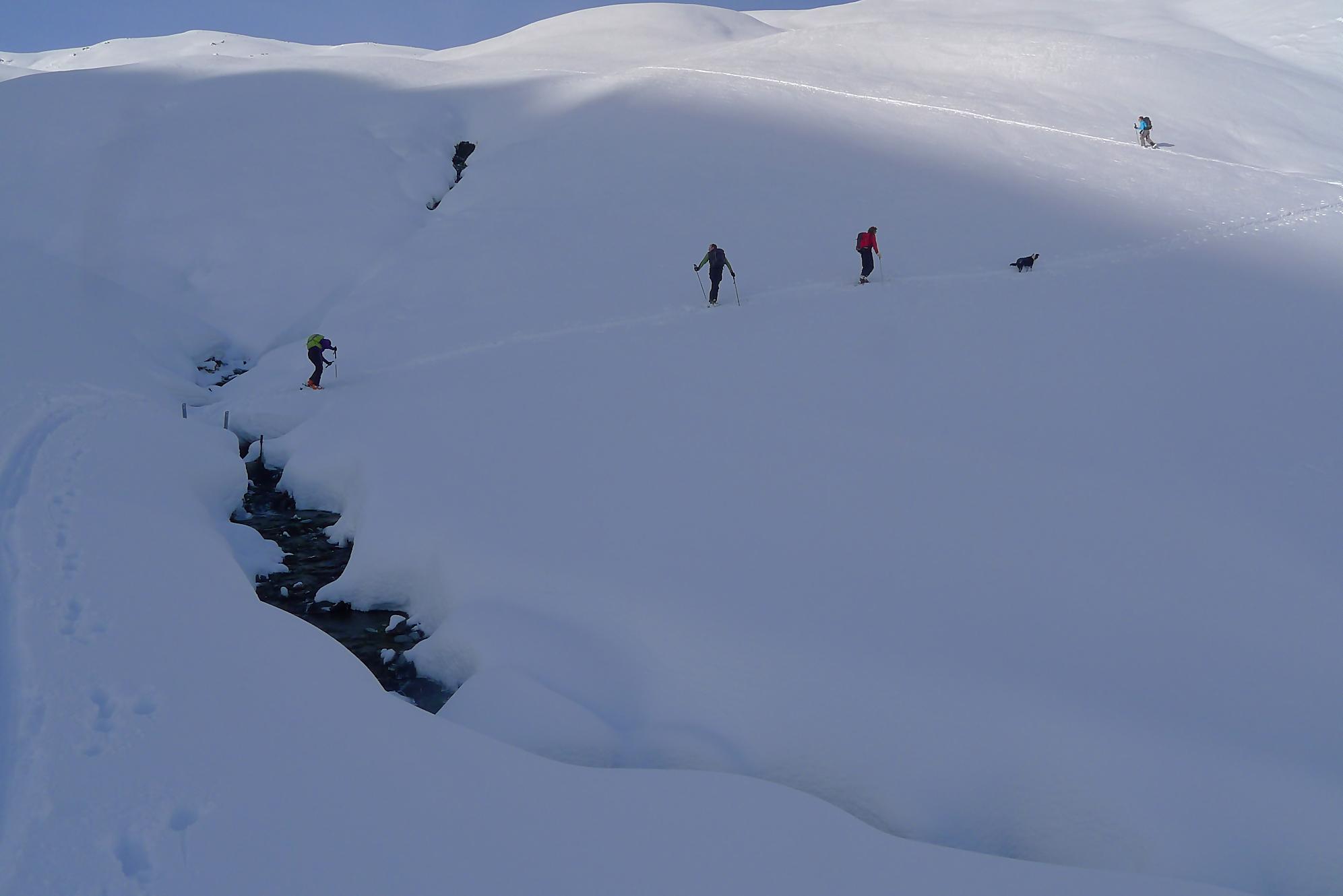 Donc avec le danger 3, Crêta de Vella visité la semaine passée s’impose à moi. Le bus du matin, toujours un peu trop matinal à mon gout (au printemps je le trouverai tardif), me dépose à Bourg Saint Pierre. La couche de neige est plus importante et le froid aussi (-7°c). Je ne reproduis pas mon erreur de mettre les peaux dès le départ et file vers le Pont de Tsarevesse. C’est la foule des grands jours, le CAS des Diablerets et d’autres groupes dont un avec une chienne qui reçoive une remarque qu’il faudrait la tenir en laisse car nous sommes dans une Zone de Tranquillité. Ma théorie, plus latine, me dit que si le chien ne coure par après les bêtes, pourquoi se compliquer la vie. Surtout qu’un border collie rêve de moutons par de chevreuils !