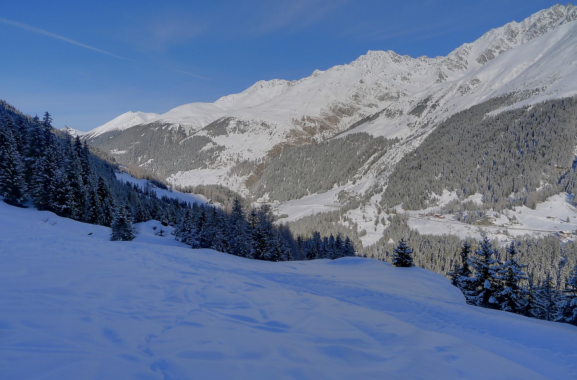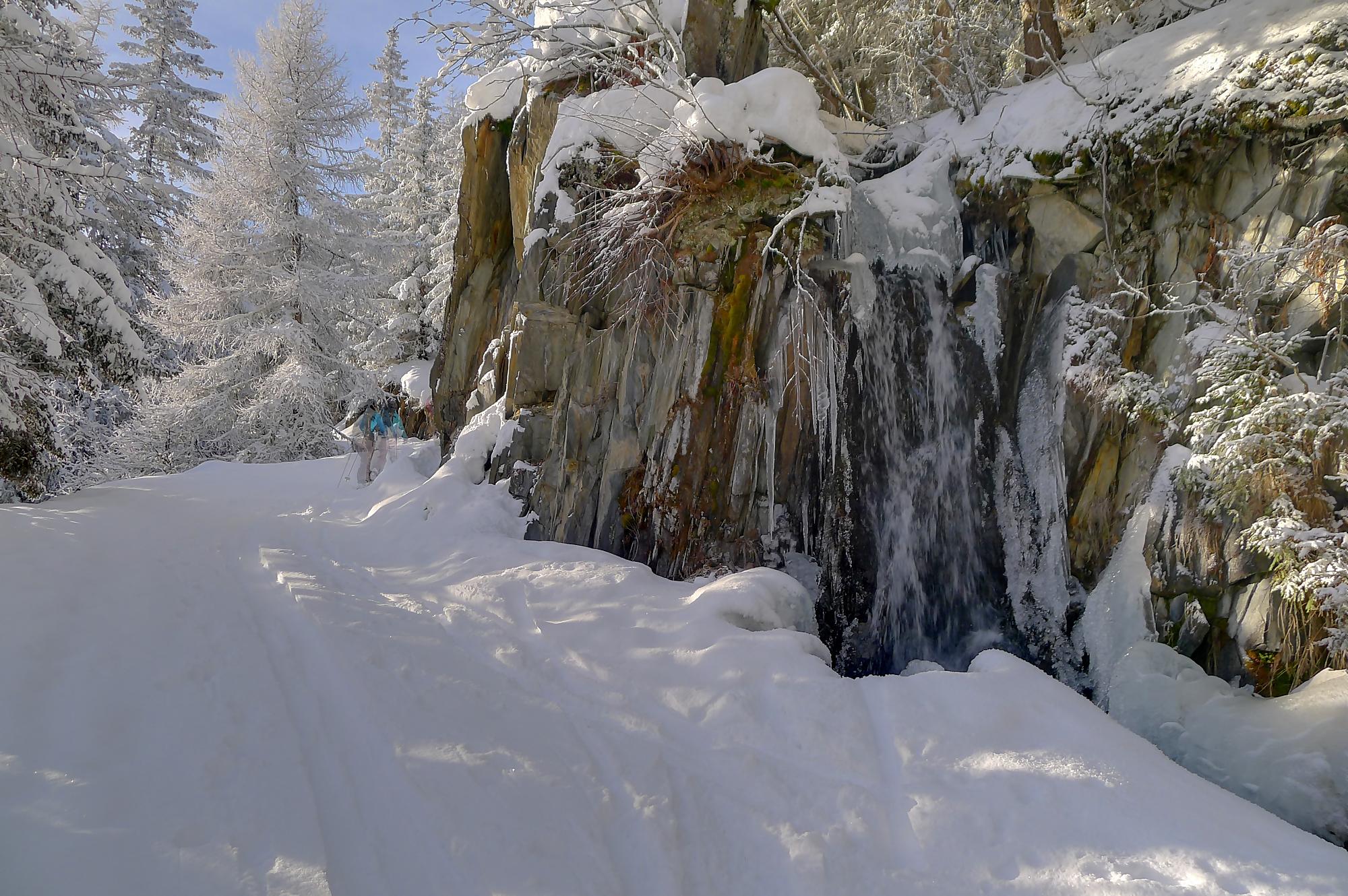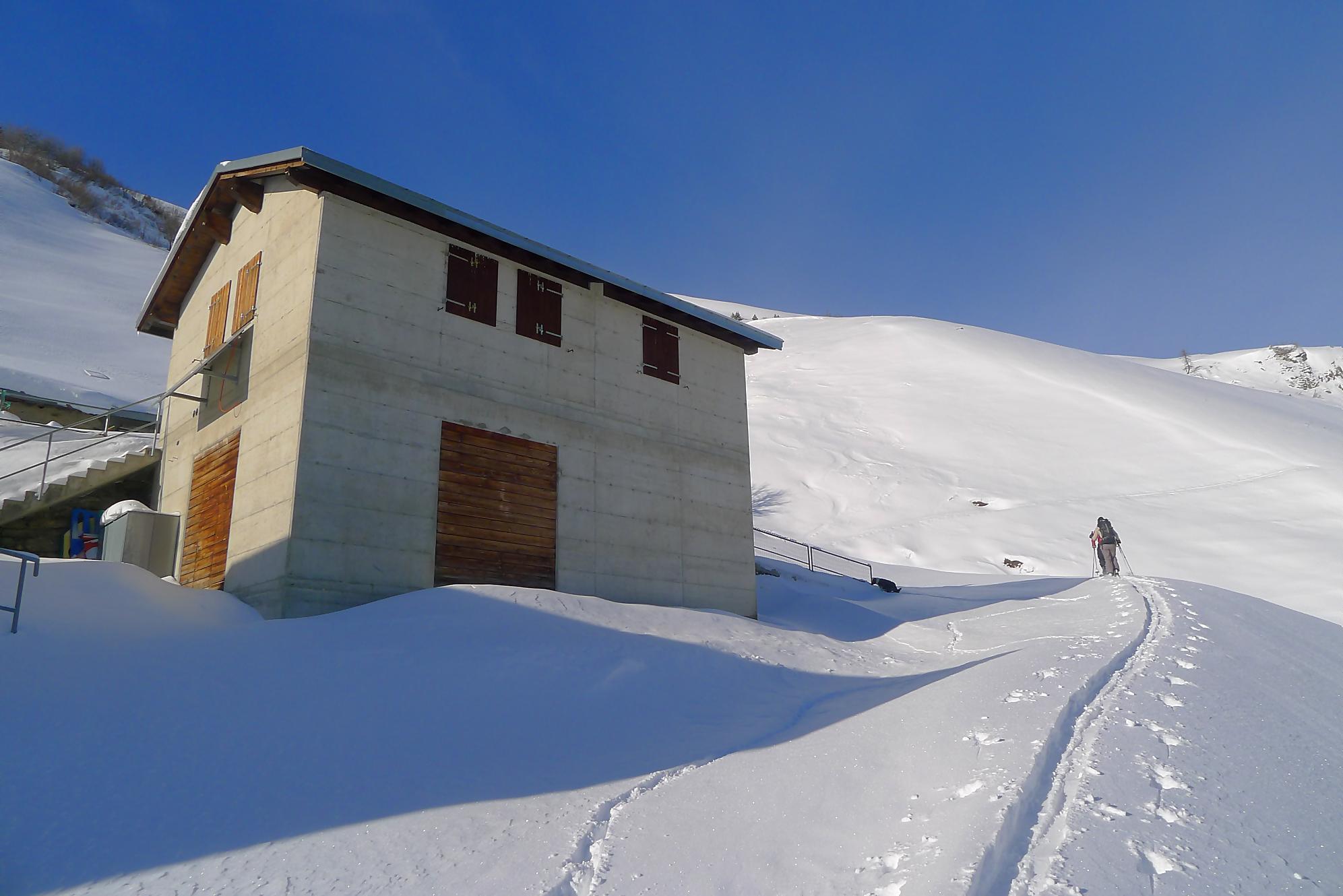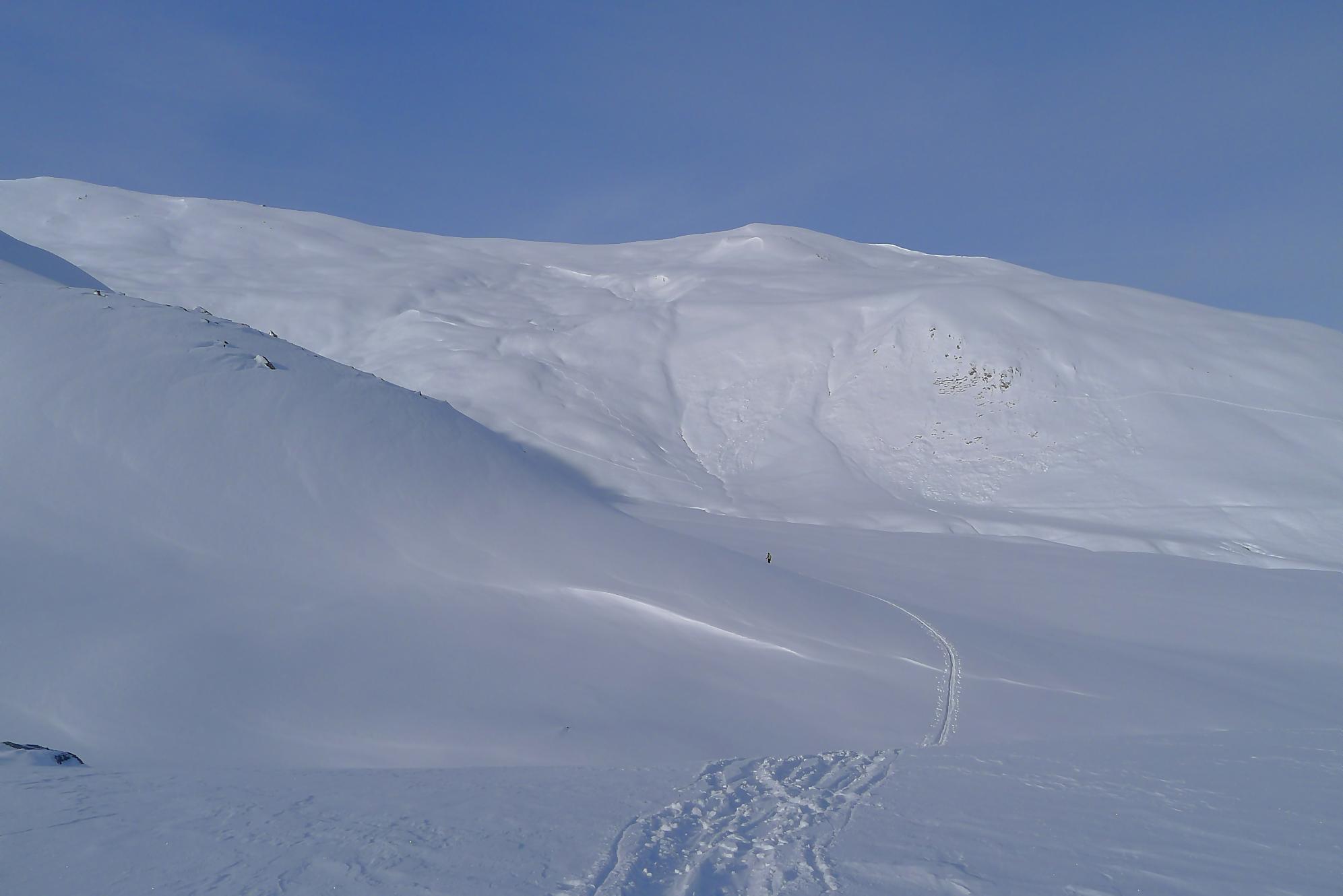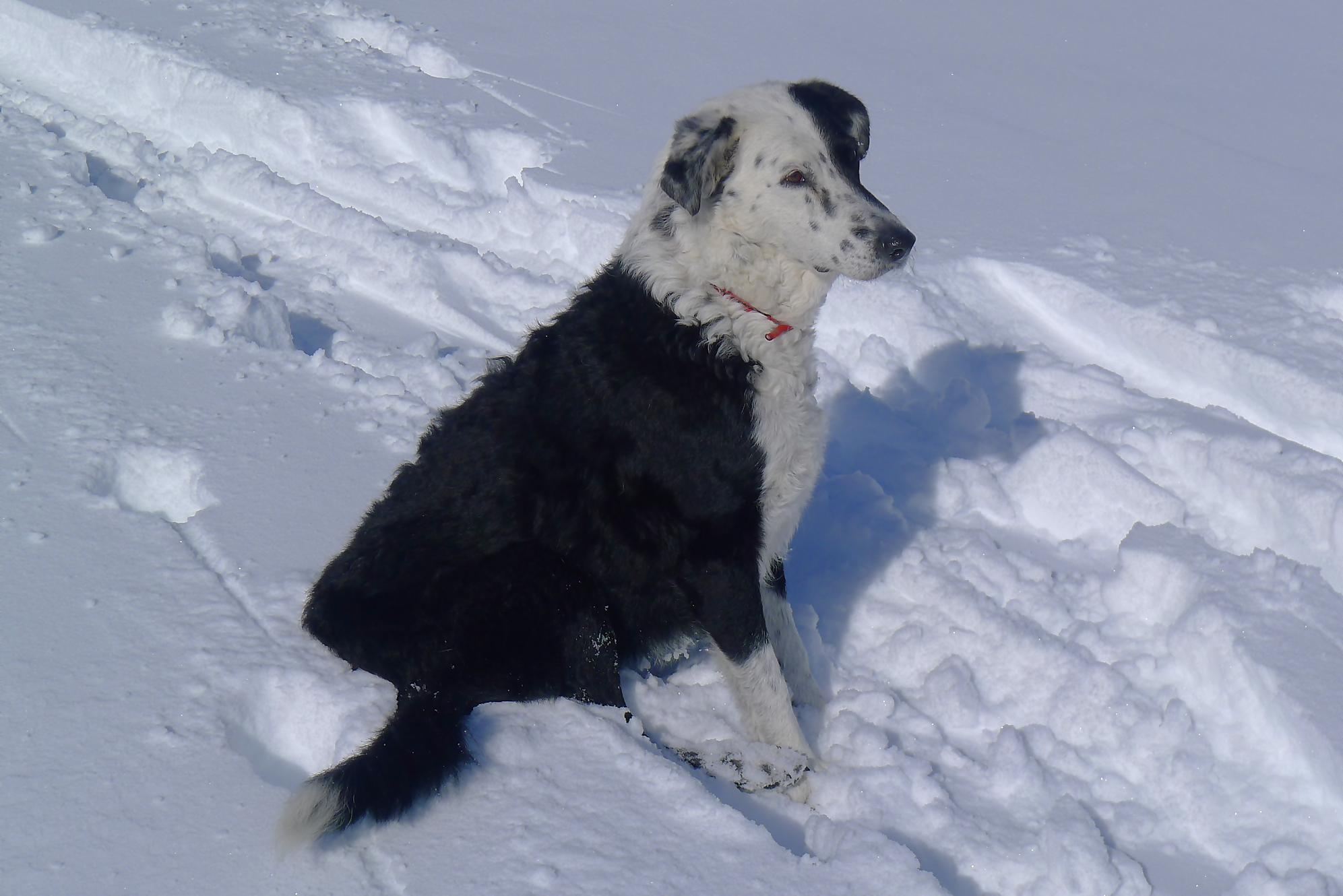 Donc avec le danger 3, Crêta de Vella visité la semaine passée s’impose à moi. Le bus du matin, toujours un peu trop matinal à mon gout (au printemps je le trouverai tardif), me dépose à Bourg Saint Pierre. La couche de neige est plus importante et le froid aussi (-7°c). Je ne reproduis pas mon erreur de mettre les peaux dès le départ et file vers le Pont de Tsarevesse. C’est la foule des grands jours, le CAS des Diablerets et d’autres groupes dont un avec une chienne qui reçoive une remarque qu’il faudrait la tenir en laisse car nous sommes dans une Zone de Tranquillité. Ma théorie, plus latine, me dit que si le chien ne coure par après les bêtes, pourquoi se compliquer la vie. Surtout qu’un border collie rêve de moutons par de chevreuils !