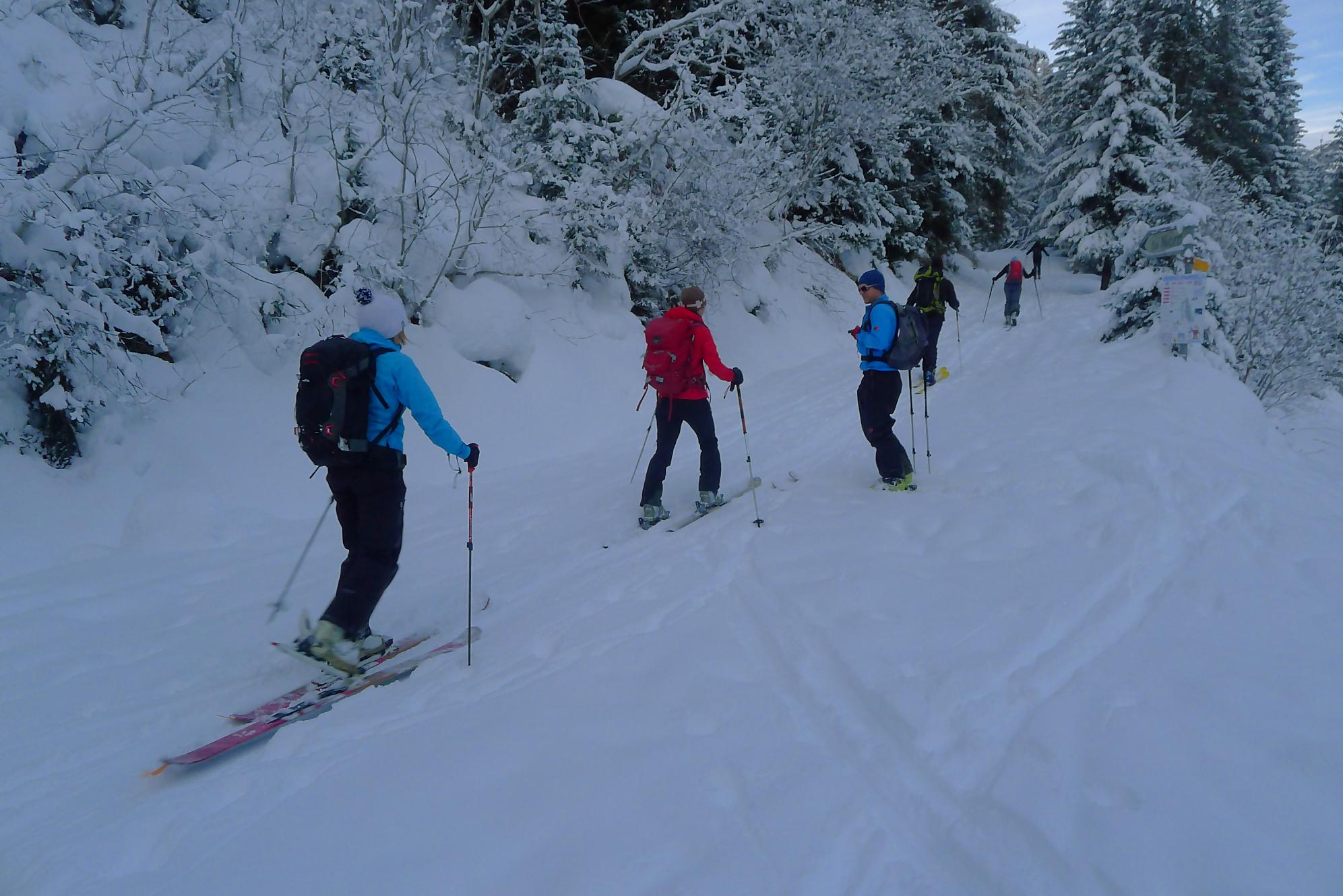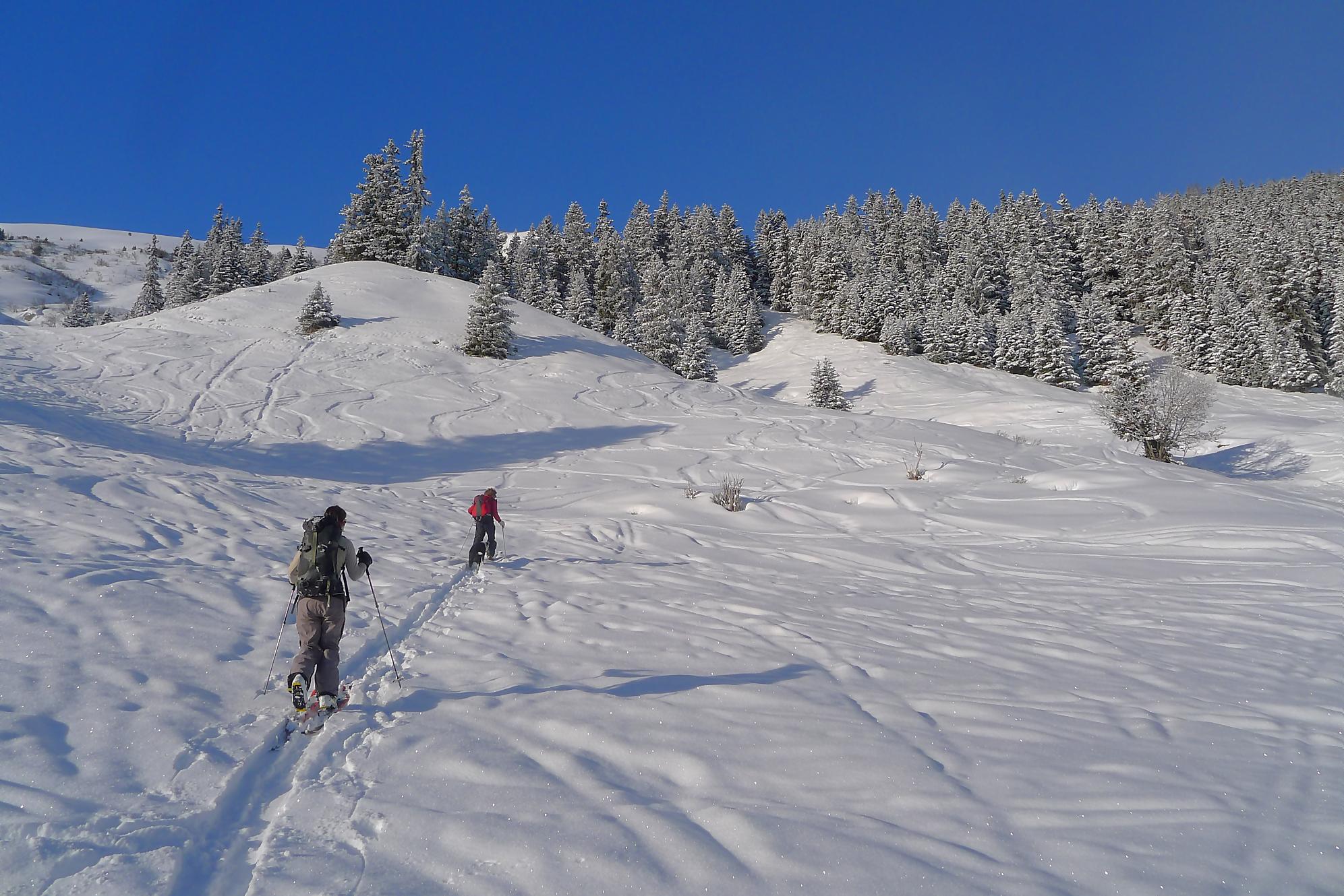 On rejoint la ferme Les Arpalles dans la grande tradition soviétique de la mise en valeur du béton. A partir de là, c’est le passage pentu de la course pour rejoindre le plateau entre Les Creux de Mourin et la Chaux de Champ Long. On se rapprochait de la limite 3 du danger d’avalanche, situé à 2200m ce jour et il a fallu jouer avec le relief pour minimiser la pente. Nous sommes partis assez à droite, en solo je n’aurai pas pris cette option, mais en groupe c’est différent. Pas mal de conversions, petites attentes pour respecter les distances de délestage, mais in fine, la neige étant soufflée et le fond dure, ça passait bien. Par rapport à ma montée de la semaine dernière, par La Niord, cette section est plus pentue. Par La Niord, on suit le chemin d’été qui est plus doux et la forêt est sécurisante.