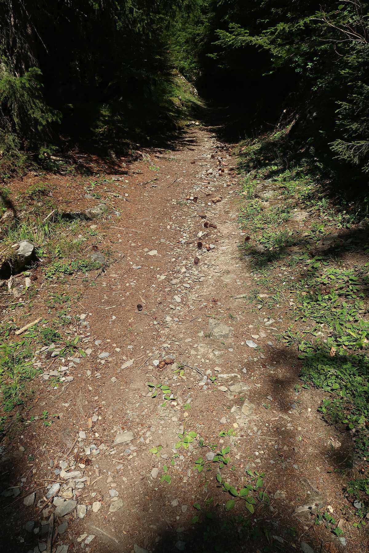 Nous arrivons sous les premiers chalets de Saille et commençons à croiser du monde. La descente via le télésiège à du succès. Nous rencontrons les propriétaires d’un de ces chalets. Ici il faut tout porter soi-même. Puis nous poursuivons dans ce plateau de Saille, le chemin est une tranchée dans une végétation haute (beaucoup de cerfeuil musqué).