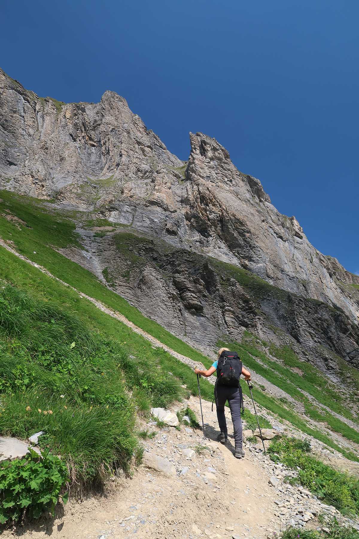 De là, le sentier fait un grand arc de cercle pour monter à un col. De là, on peut voir les ruines de la première cabane Rambert sous la Frête de Saille (avec une jumelle encore mieux). Un dernier effort par un sentier sécurisé par des chaînes permet de rejoindre la cabane Rambert.