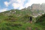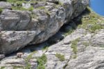 Je poursuis, la montée devient plus minérale, sauf sur le plateau où les orties forment un tapis vert. Il faut désormais monter dans la combe des Greppes. Une sente est facile à suivre, sur la droite (rive gauche) du pierrier, sauf dans la partie haute où les moutons sèment le doute. C’est raide. Je visite donc le pierrier, pour comprendre qu’il faut rester à droite. On ne contourne le pierrier que tout en haut sous la falaise. C’est l’occasion de découvrir, sur des pentes escarpés un groupe de femelles bouquetins avec leur petit de cette année. Trop mignons et agiles ces petits. Je reste à les observer un bon moment. Puis le sentier devient pentu dans une zone rocheuse. Un peu aérien parfois, mais cela reste confortable. Il y a parfois des pas à franchir.