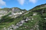 Je reviens sur mes pas et descends dans la pente herbeuse N de Chambairy. Le sentier se perd vite et je progresse au mieux. Herbes hautes et humides, il y a mieux comme terrain. Je croise les moutons. Il faut savoir s’orienter car le secteur est constitué de barres rocheuses. Vers 2060m, je retrouve la sente et la suit. On longe la falaise. J’ai le droit à un passage raide gravilloneux et gras en ce jour. Très peu d’appuis et je regrette de n’avoir pris qu’un bâton. Avec précautions, je débouche dans le haut d’un pierrier. Agréable dans le haut avec ses petits cailloux, puis casse-pattes vers le milieu avec ses pierres plus grosses.