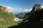 En arrivant au Col de Chaudin, il y a un côté impressionnant car c’est raide. Les moutons ont en partie labouré le terrain et avec attention je descends (ne pas rester le long de la falaise). Je retrouve une sente standard et descend la petite combe de Sur Combrettes. C’est joli avec un pic et une gouille en bas.