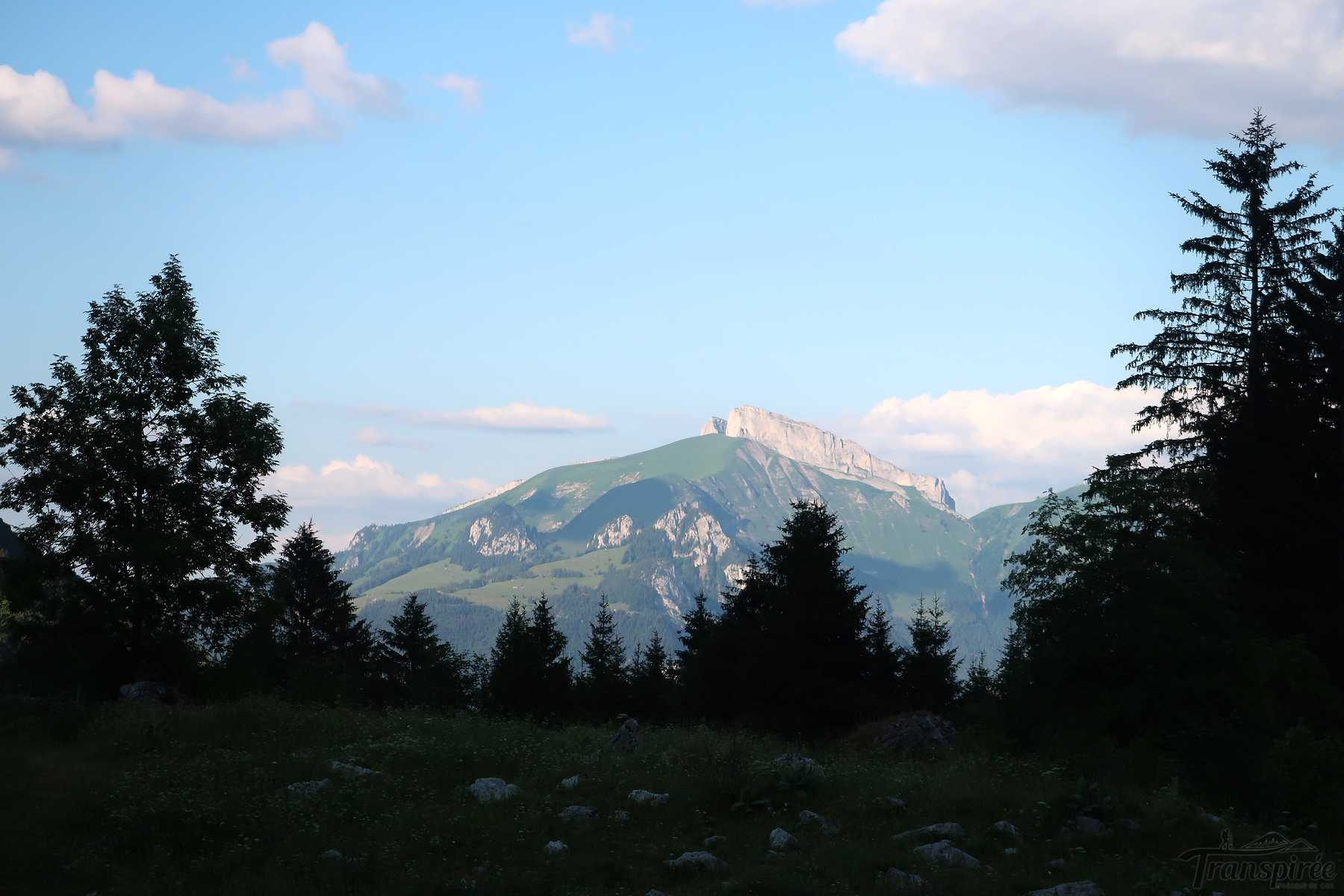Je poursuis en forêt, sur un sentier carrossable. J’en sors dans le bas du vallon de Verne avec le col de Verne bien en vue. Je quitte cette route pour filer à droite et passer devant la ferme de La Grand-Jeur. De là, c’est un large sentier (route de 4×4) qui me fait traverser pendant un bon moment une forêt d’épicéas et feuillus.