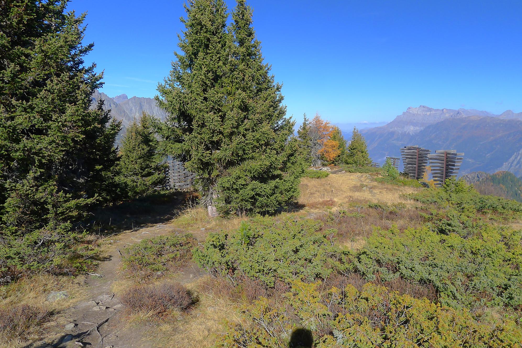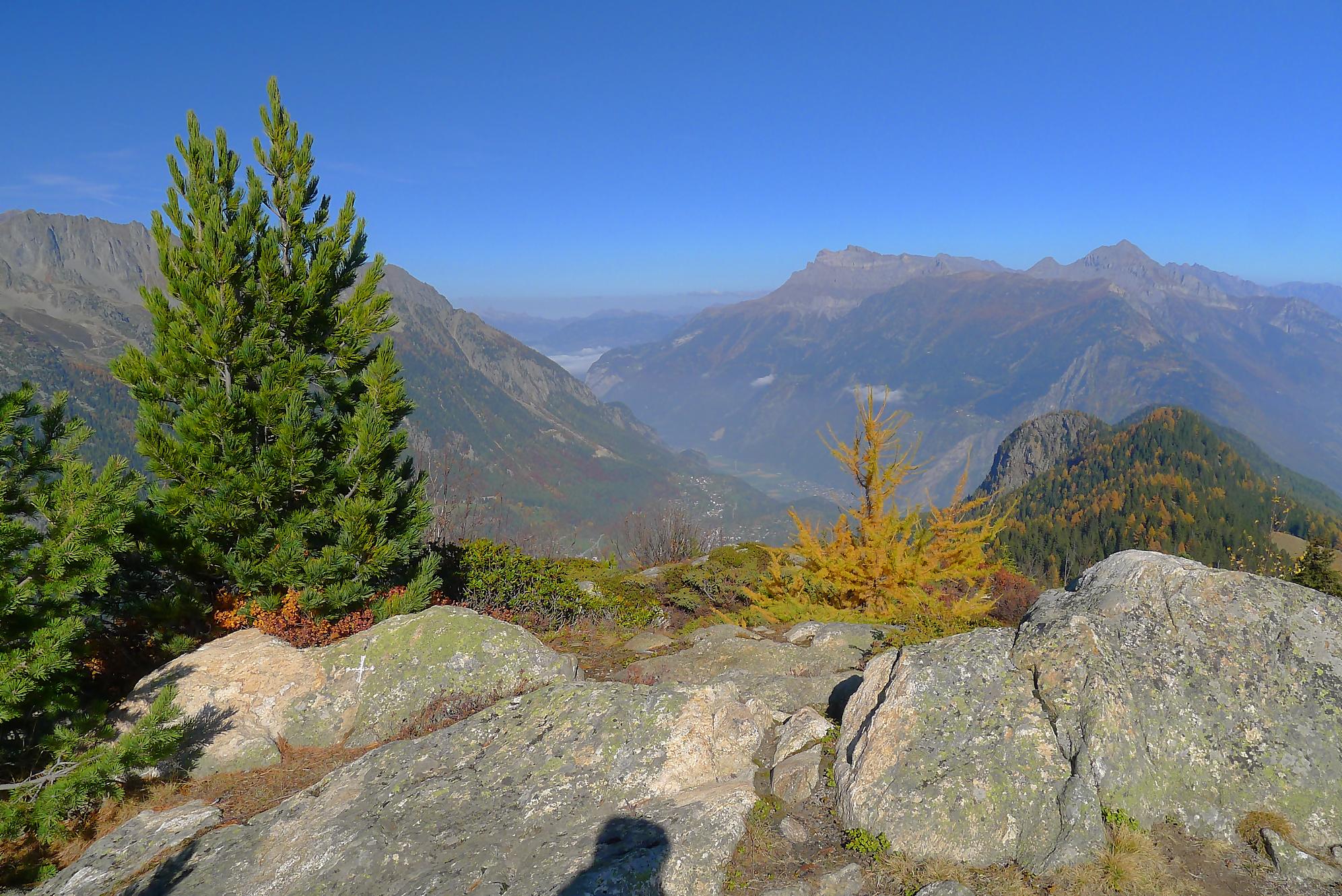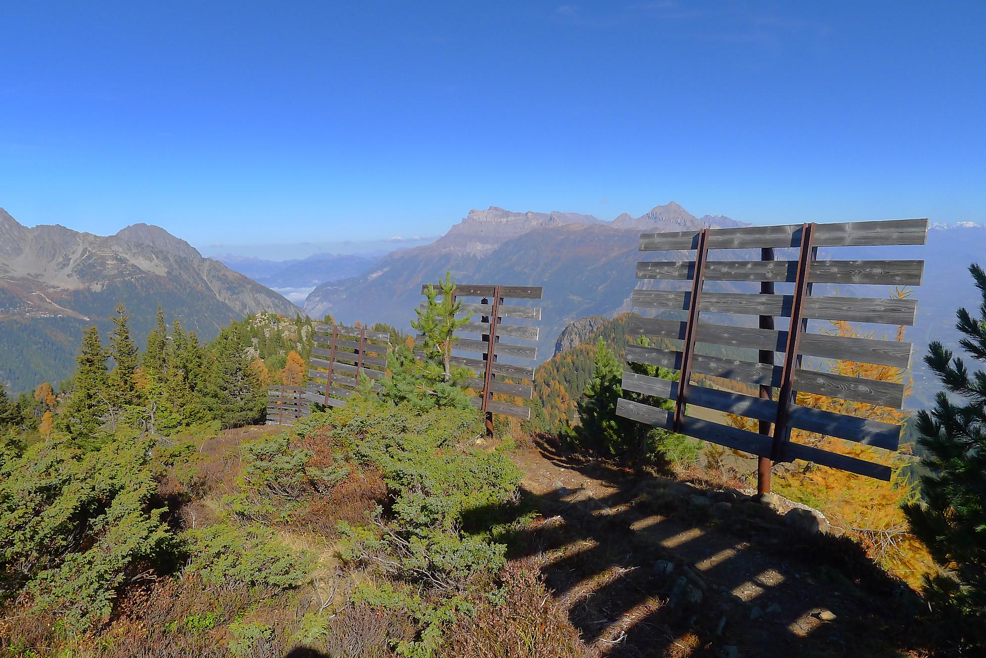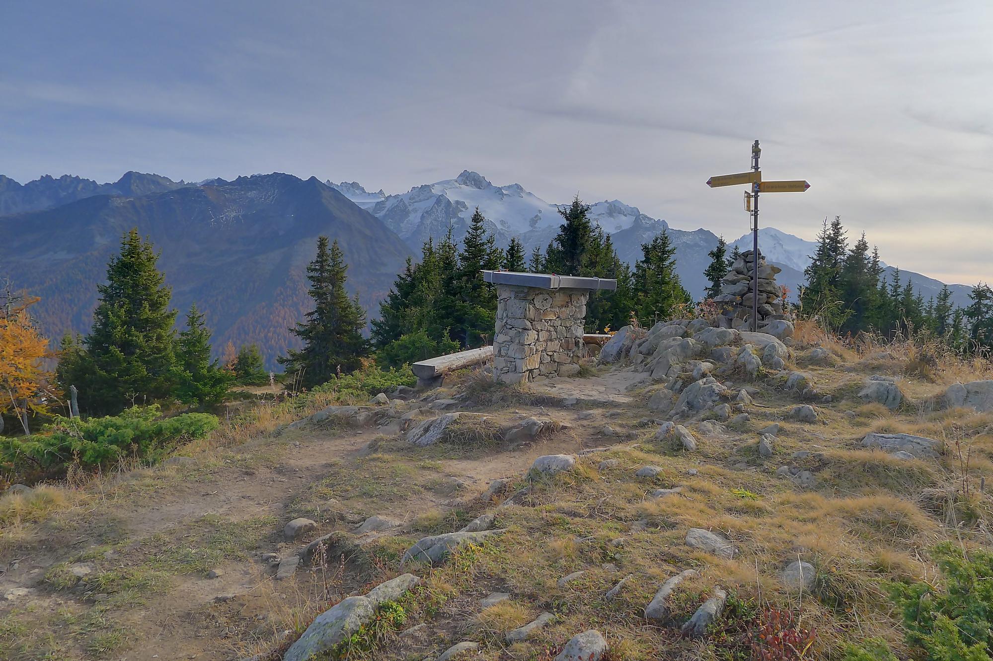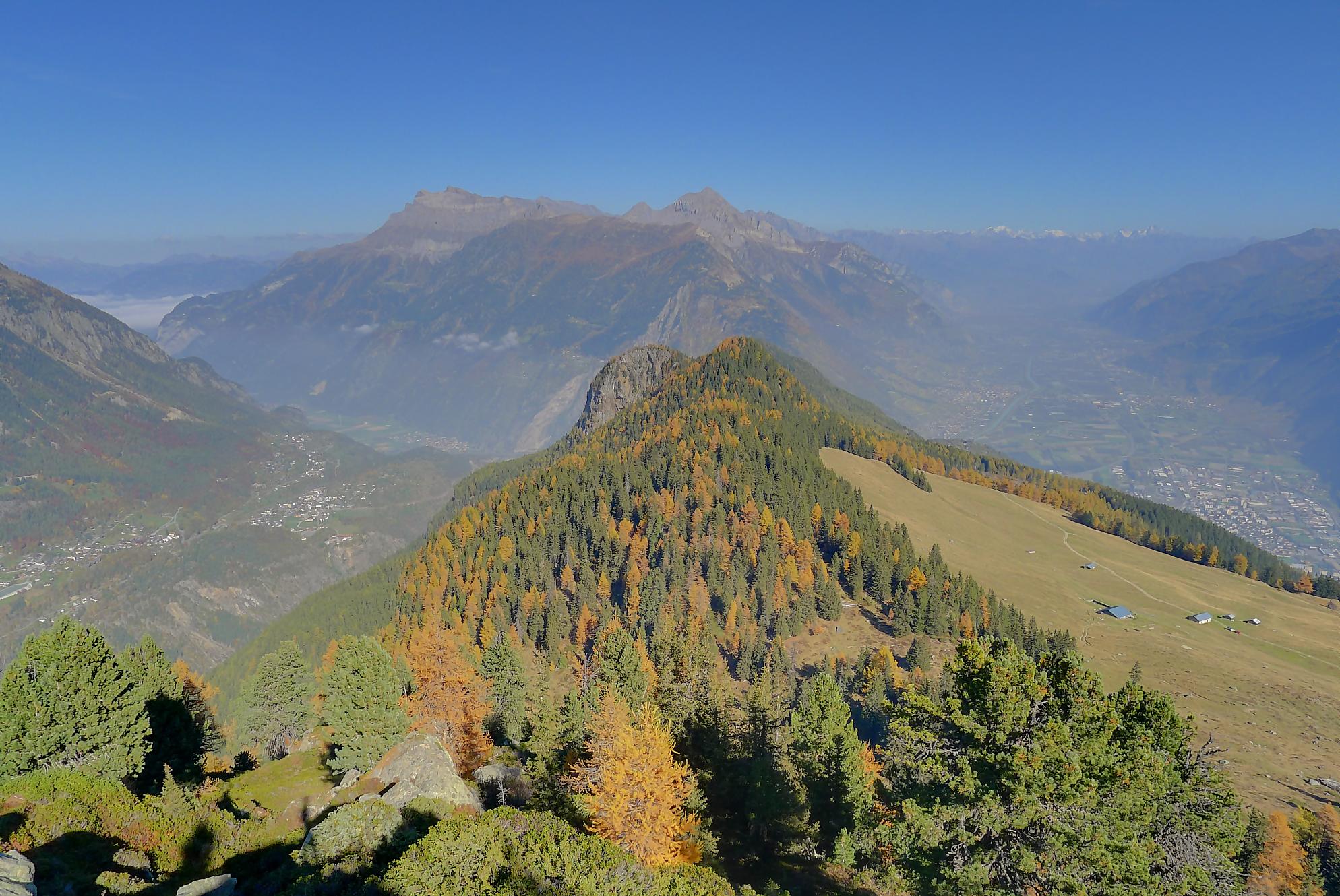 J’ai attendu sur le parking du restaurant de La Forclaz, que le soleil de l’automne arrive enfin. Puis je suis parti, montant dans la face SE par le chemin au-dessus de Sé de Meylan. J’aurai préféré le prendre à la descente, car plus doux, mais étant orienté E, j’ai préféré l’option soleil du matin. Le premier tiers est pentu, jusqu’à la fin de Sé de Meylan, mais les mélèzes en feu rendent les lieux extraordinaires, puis en sortant de la forêt (Le Larzey), l’épicéa et mélèze cèdent leur place aux génévriers et rhododendrons, ainsi qu’à quelques aroles. On passe près des paravalanches, une montée pentue, puis trouvons la crête où on arrive peu après au sommet. La commune de Martigny-Combe et le Tour du Mont-Blanc ont installé une bien jolie table d’orientation émaillée, peinte par une artiste. Le panorama s’ouvre sur la vallée du Rhône, Dent Blanche, Grand Combin et Mont-Blanc entre les arbres. Du côté de Trient la vue est bouchée par ces arbres, dommage.