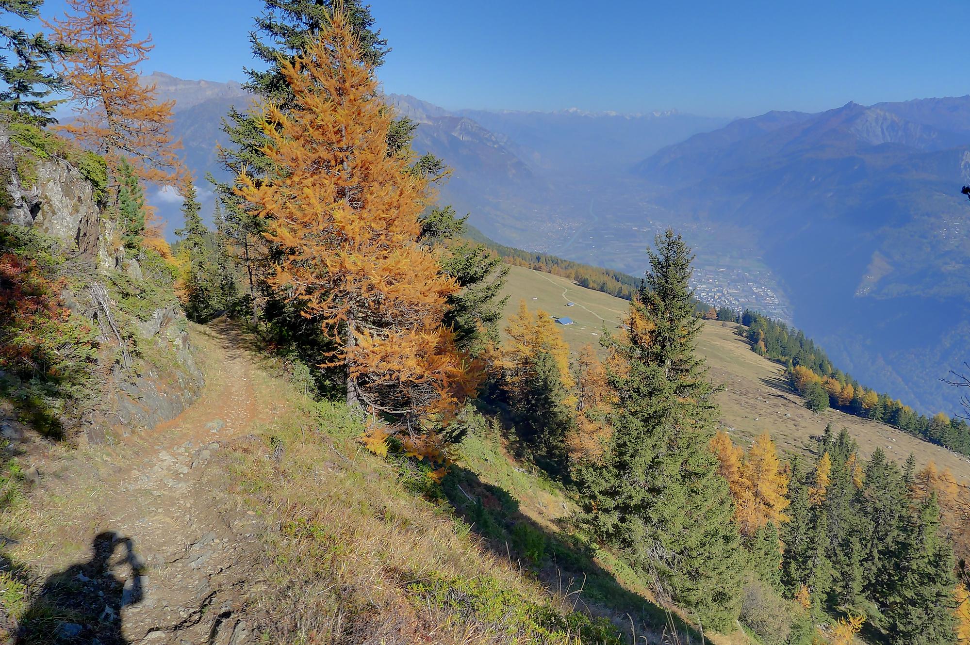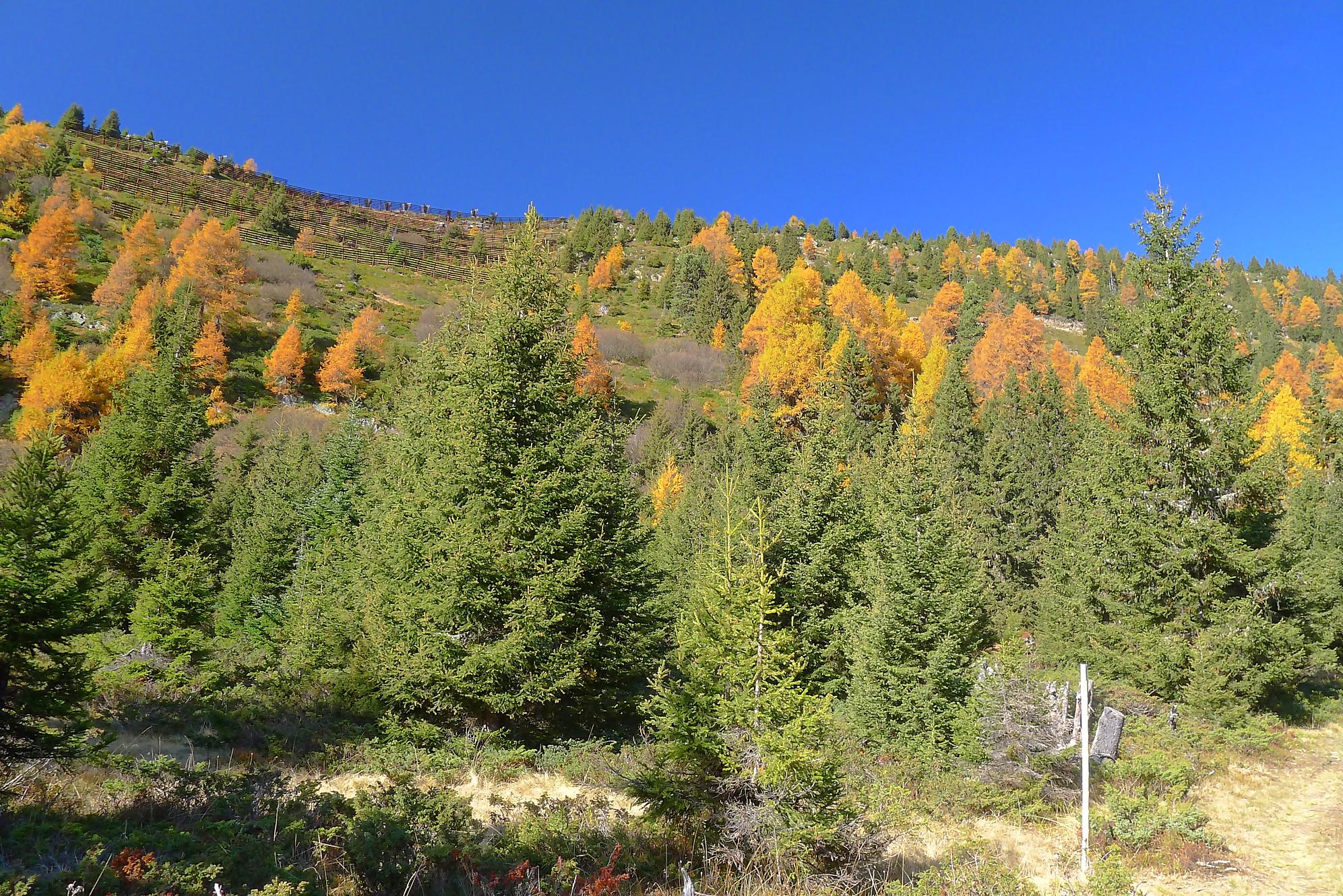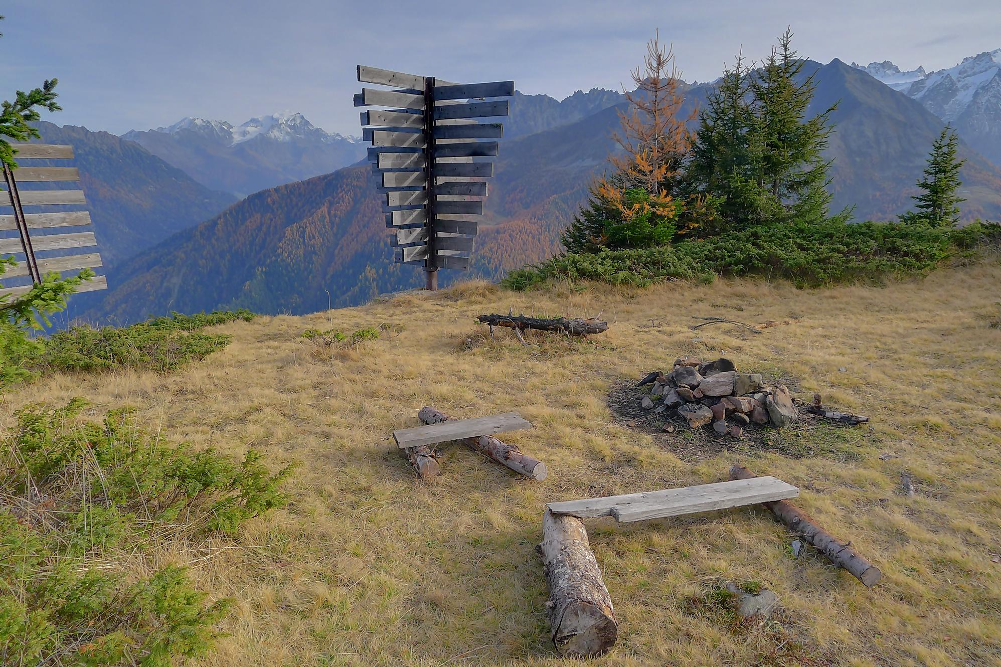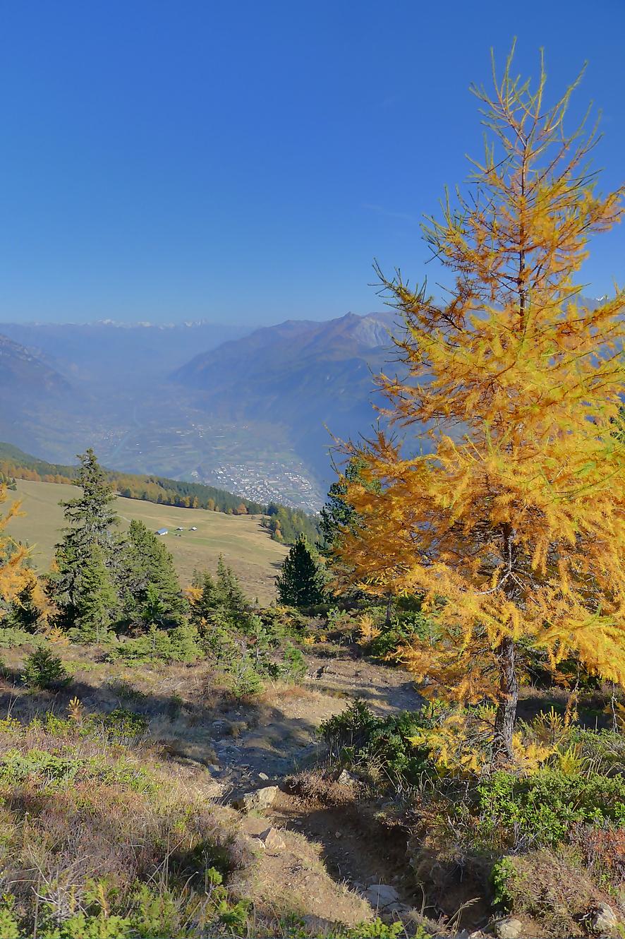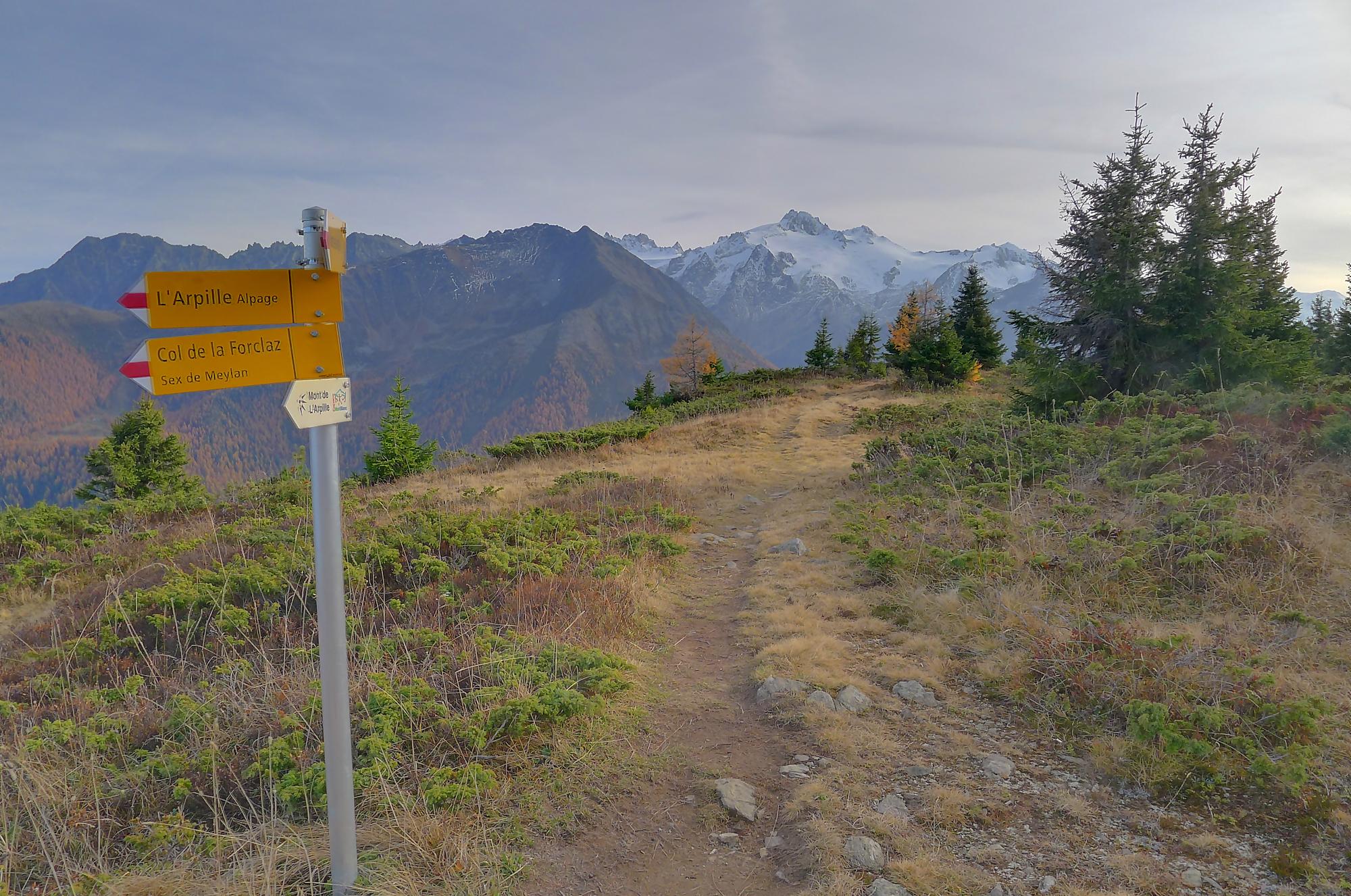 J’ai attendu sur le parking du restaurant de La Forclaz, que le soleil de l’automne arrive enfin. Puis je suis parti, montant dans la face SE par le chemin au-dessus de Sé de Meylan. J’aurai préféré le prendre à la descente, car plus doux, mais étant orienté E, j’ai préféré l’option soleil du matin. Le premier tiers est pentu, jusqu’à la fin de Sé de Meylan, mais les mélèzes en feu rendent les lieux extraordinaires, puis en sortant de la forêt (Le Larzey), l’épicéa et mélèze cèdent leur place aux génévriers et rhododendrons, ainsi qu’à quelques aroles. On passe près des paravalanches, une montée pentue, puis trouvons la crête où on arrive peu après au sommet. La commune de Martigny-Combe et le Tour du Mont-Blanc ont installé une bien jolie table d’orientation émaillée, peinte par une artiste. Le panorama s’ouvre sur la vallée du Rhône, Dent Blanche, Grand Combin et Mont-Blanc entre les arbres. Du côté de Trient la vue est bouchée par ces arbres, dommage.