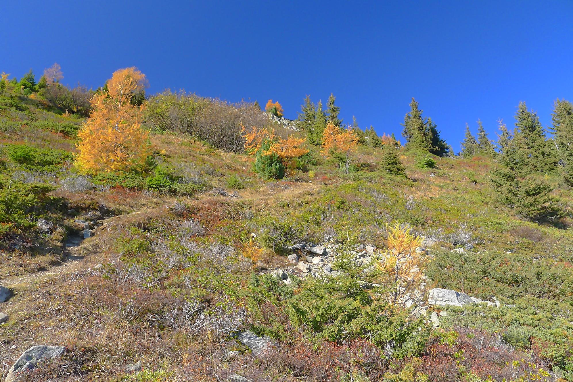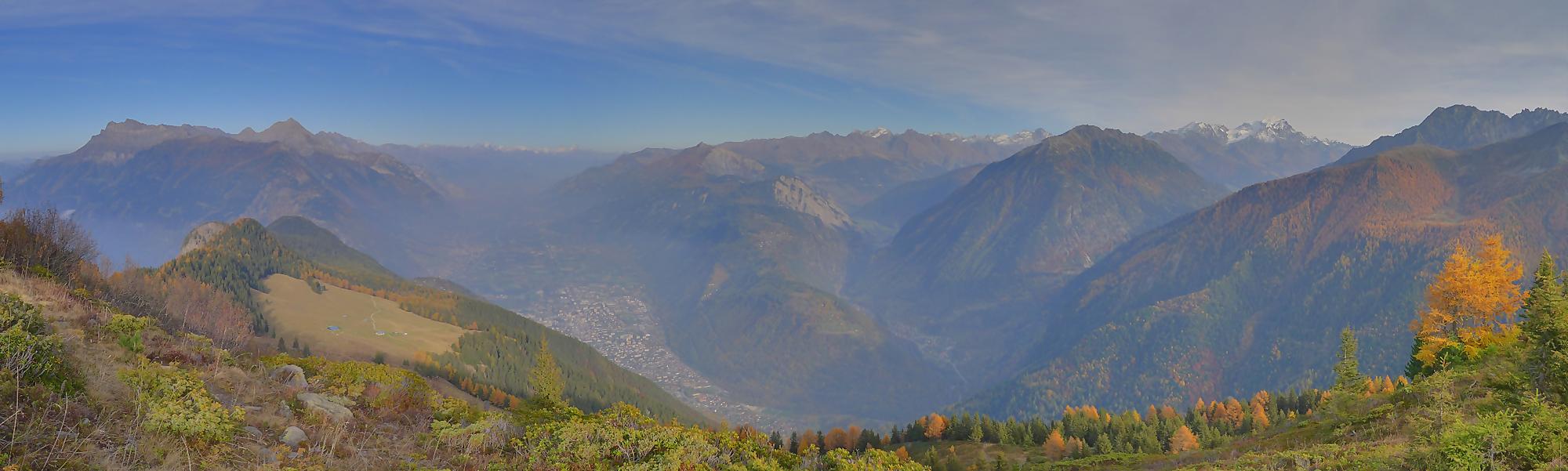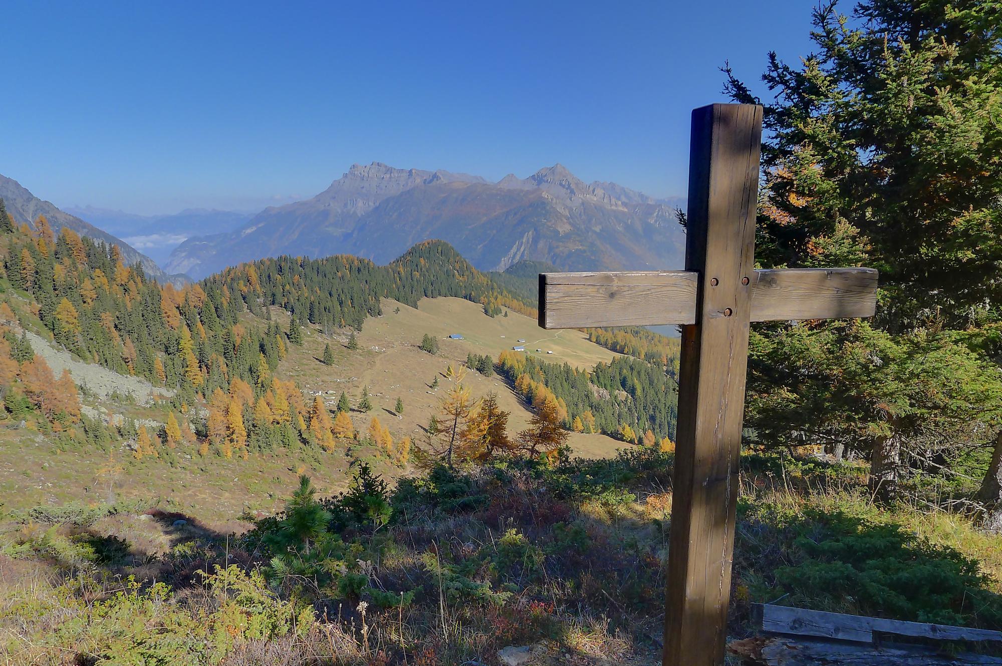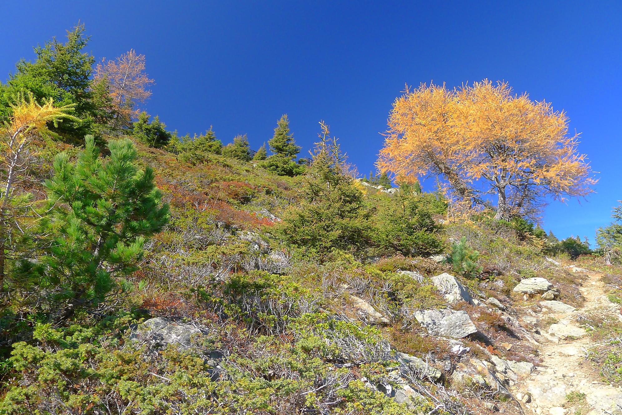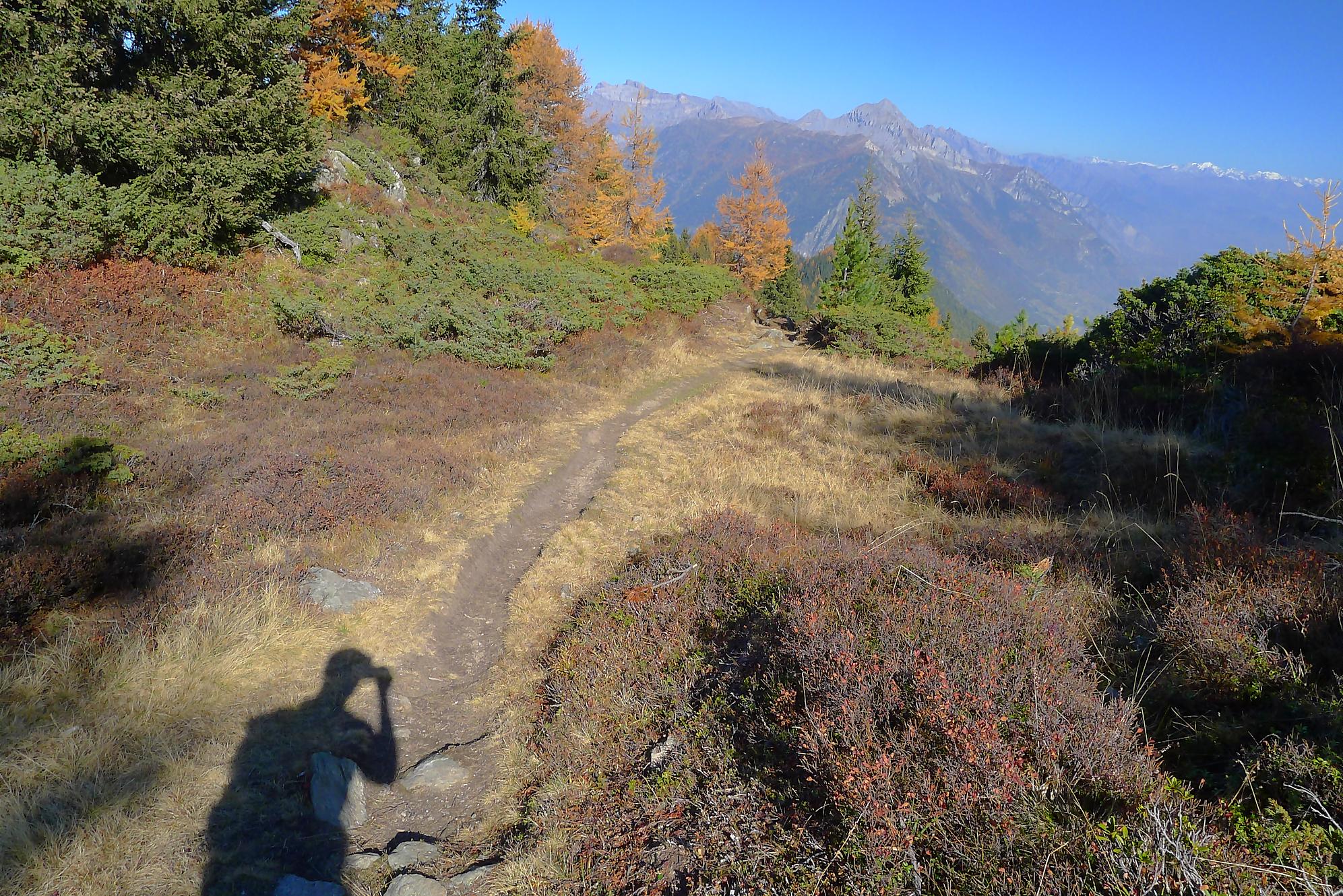 J’ai attendu sur le parking du restaurant de La Forclaz, que le soleil de l’automne arrive enfin. Puis je suis parti, montant dans la face SE par le chemin au-dessus de Sé de Meylan. J’aurai préféré le prendre à la descente, car plus doux, mais étant orienté E, j’ai préféré l’option soleil du matin. Le premier tiers est pentu, jusqu’à la fin de Sé de Meylan, mais les mélèzes en feu rendent les lieux extraordinaires, puis en sortant de la forêt (Le Larzey), l’épicéa et mélèze cèdent leur place aux génévriers et rhododendrons, ainsi qu’à quelques aroles. On passe près des paravalanches, une montée pentue, puis trouvons la crête où on arrive peu après au sommet. La commune de Martigny-Combe et le Tour du Mont-Blanc ont installé une bien jolie table d’orientation émaillée, peinte par une artiste. Le panorama s’ouvre sur la vallée du Rhône, Dent Blanche, Grand Combin et Mont-Blanc entre les arbres. Du côté de Trient la vue est bouchée par ces arbres, dommage.