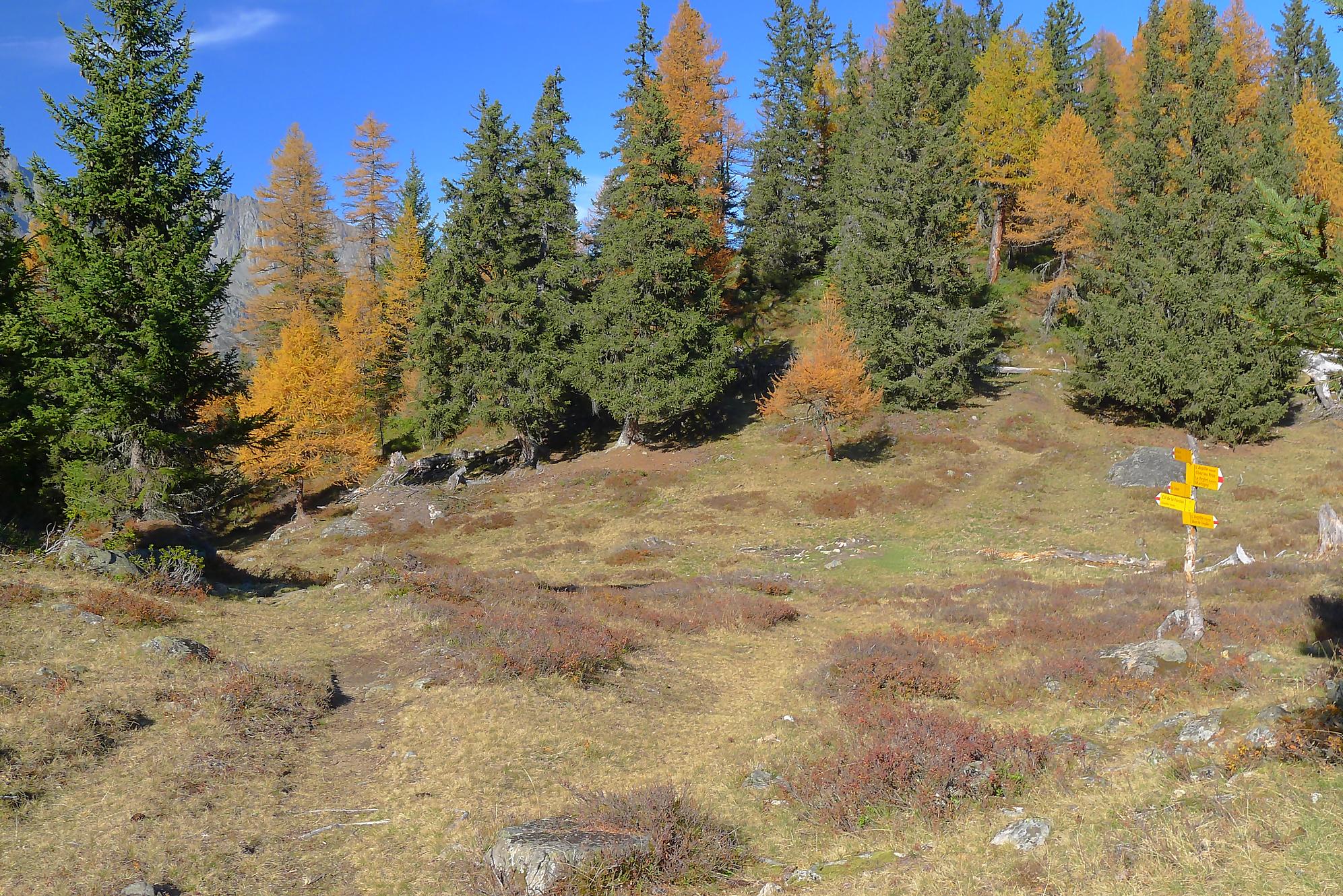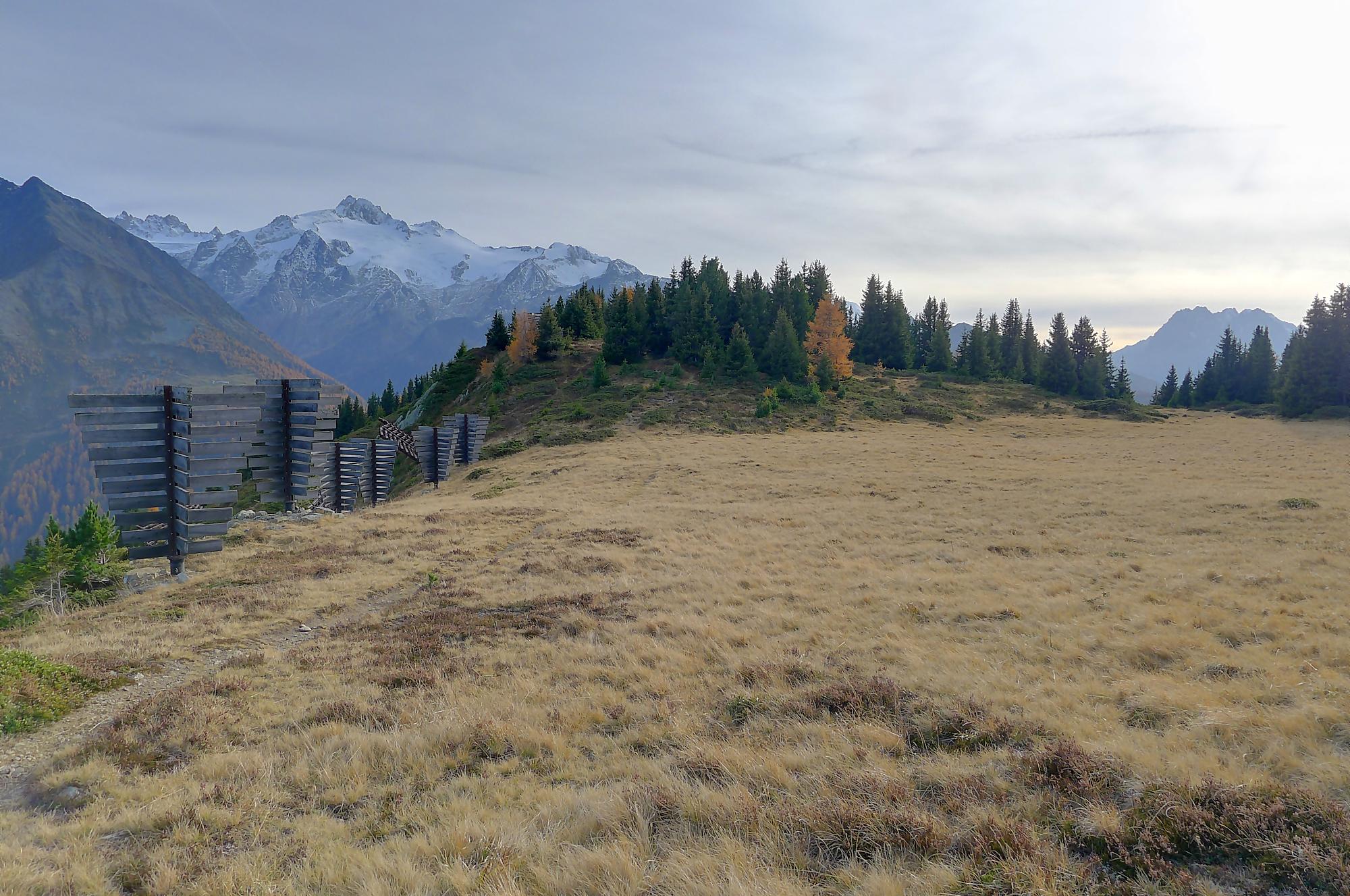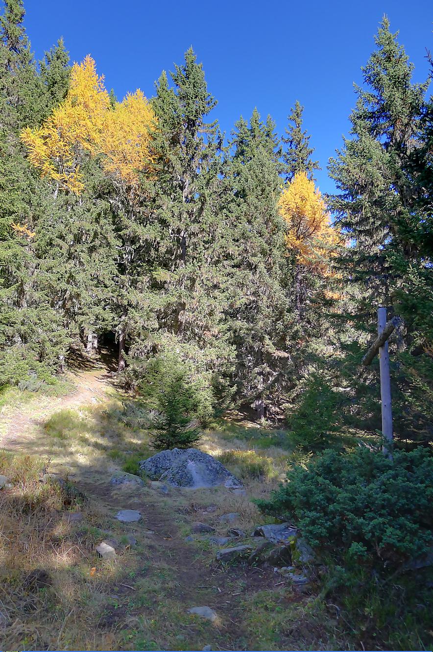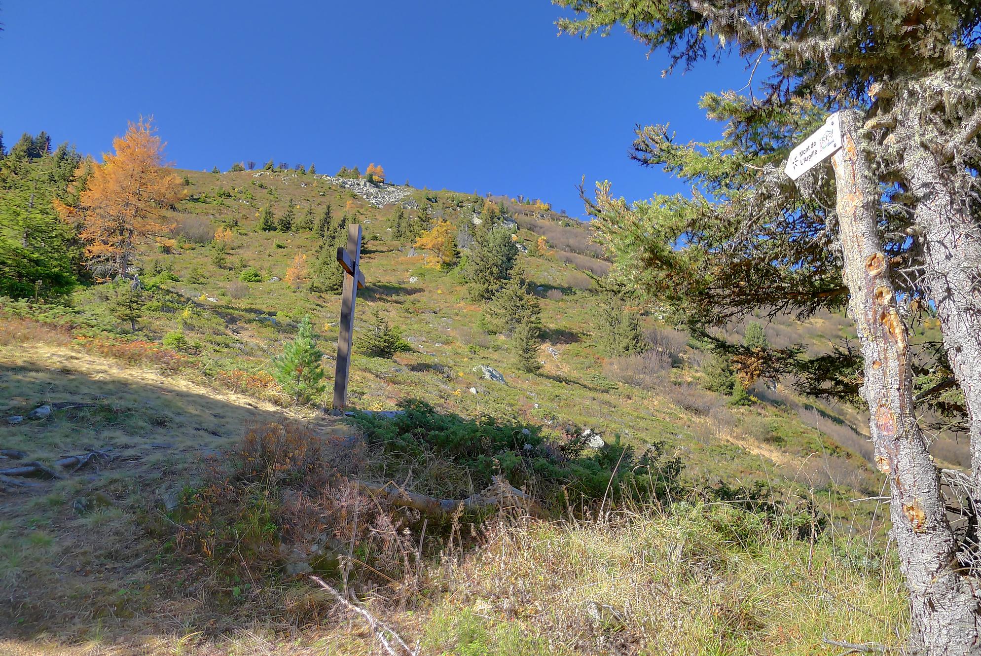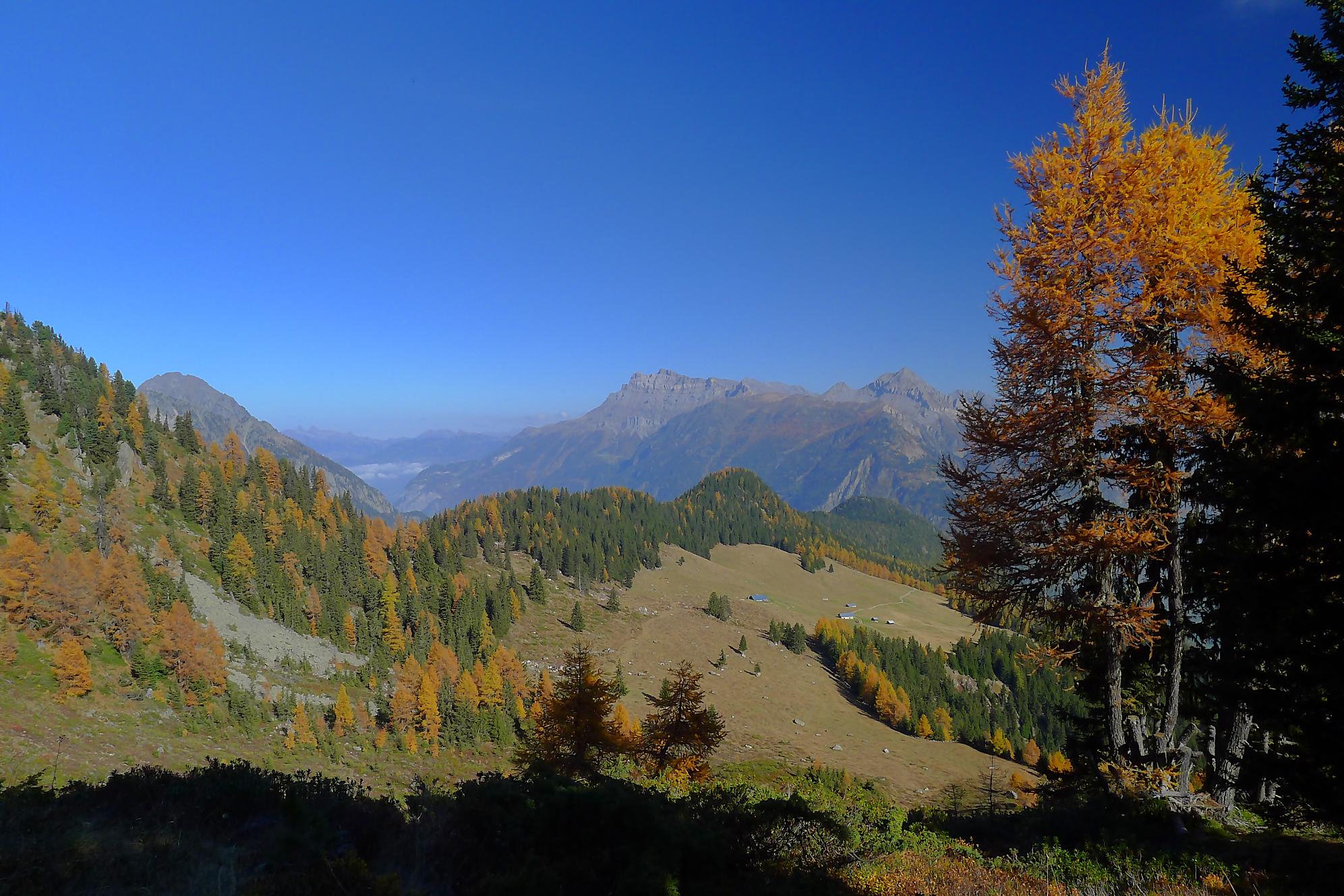 J’ai attendu sur le parking du restaurant de La Forclaz, que le soleil de l’automne arrive enfin. Puis je suis parti, montant dans la face SE par le chemin au-dessus de Sé de Meylan. J’aurai préféré le prendre à la descente, car plus doux, mais étant orienté E, j’ai préféré l’option soleil du matin. Le premier tiers est pentu, jusqu’à la fin de Sé de Meylan, mais les mélèzes en feu rendent les lieux extraordinaires, puis en sortant de la forêt (Le Larzey), l’épicéa et mélèze cèdent leur place aux génévriers et rhododendrons, ainsi qu’à quelques aroles. On passe près des paravalanches, une montée pentue, puis trouvons la crête où on arrive peu après au sommet. La commune de Martigny-Combe et le Tour du Mont-Blanc ont installé une bien jolie table d’orientation émaillée, peinte par une artiste. Le panorama s’ouvre sur la vallée du Rhône, Dent Blanche, Grand Combin et Mont-Blanc entre les arbres. Du côté de Trient la vue est bouchée par ces arbres, dommage.