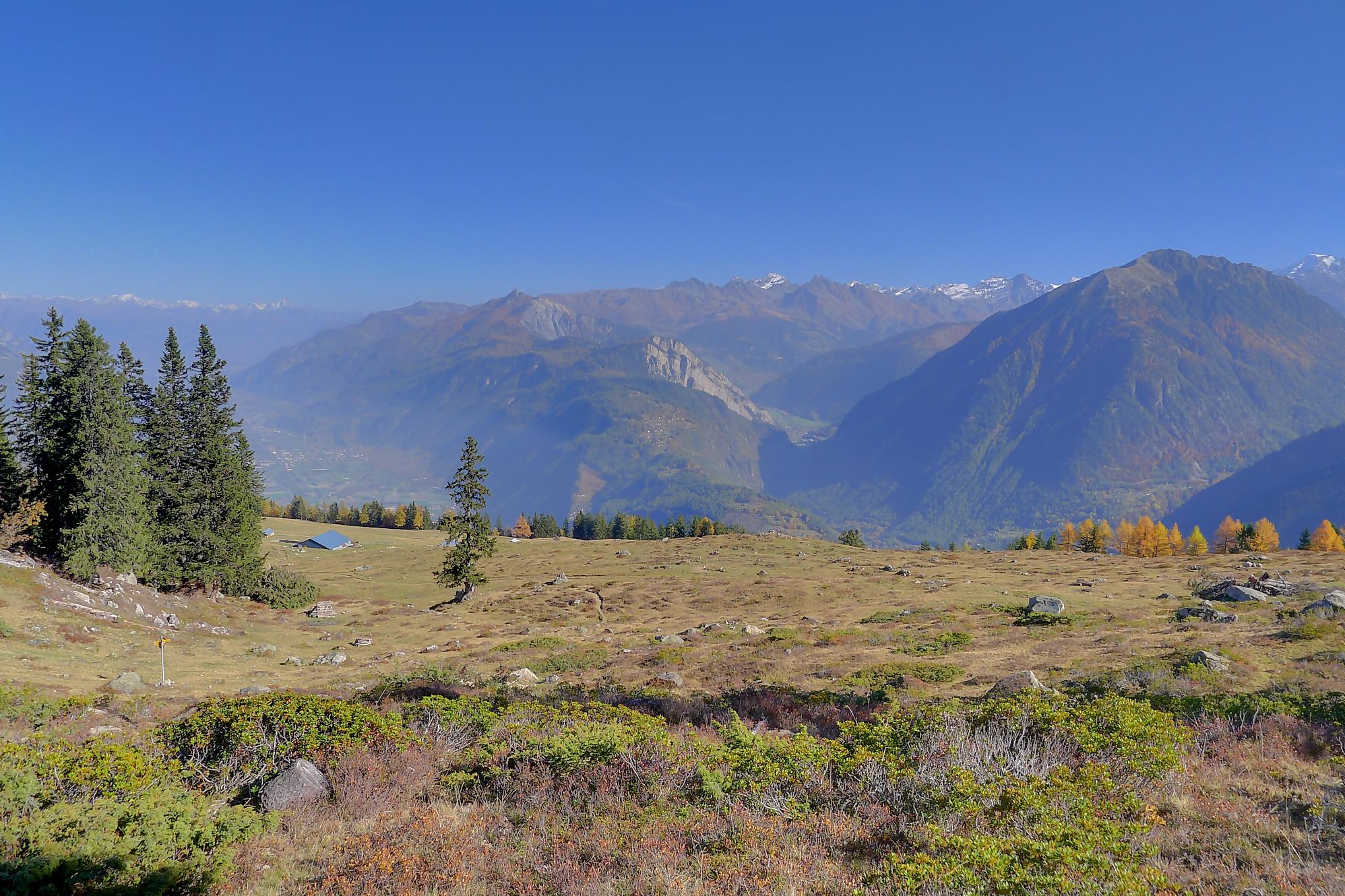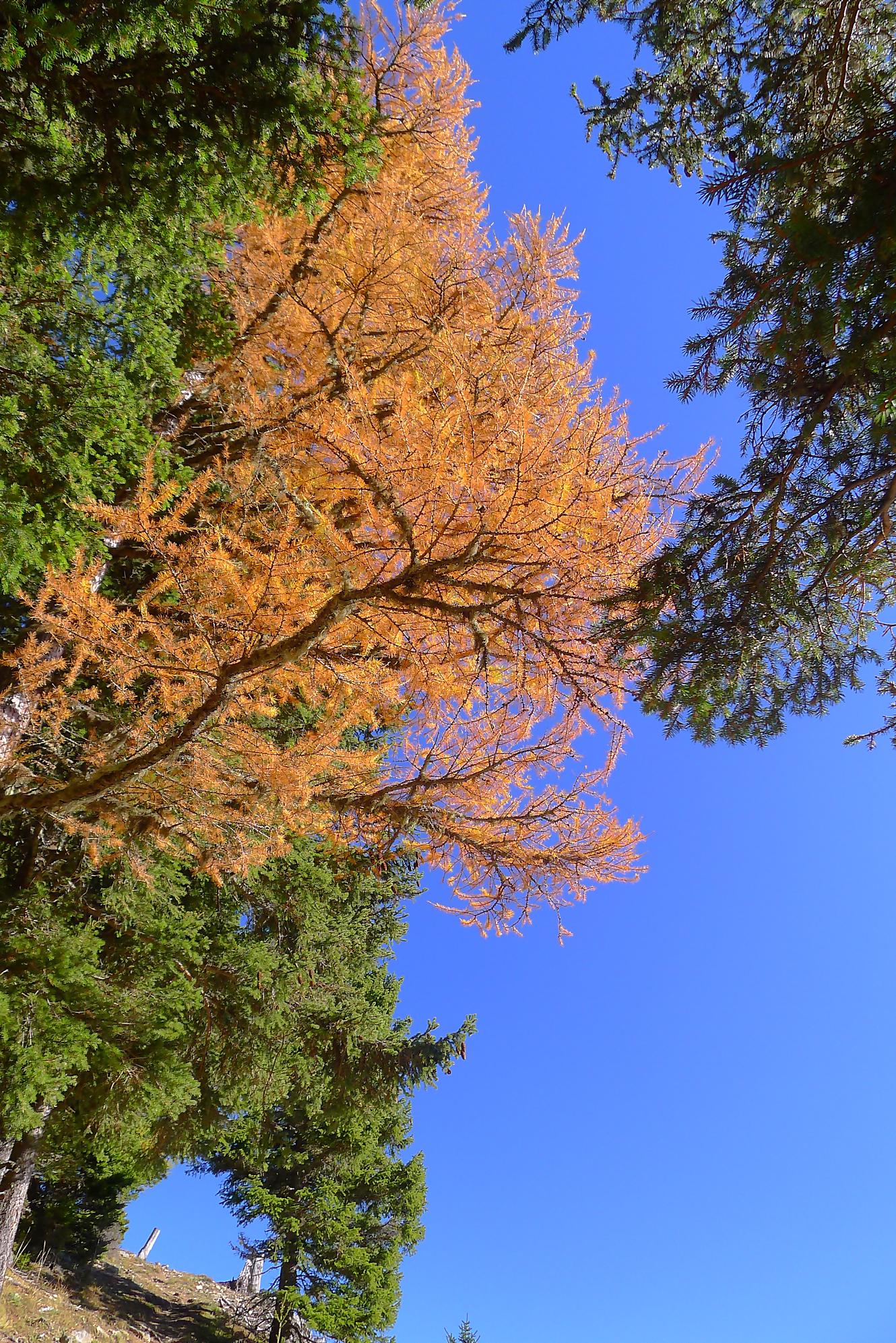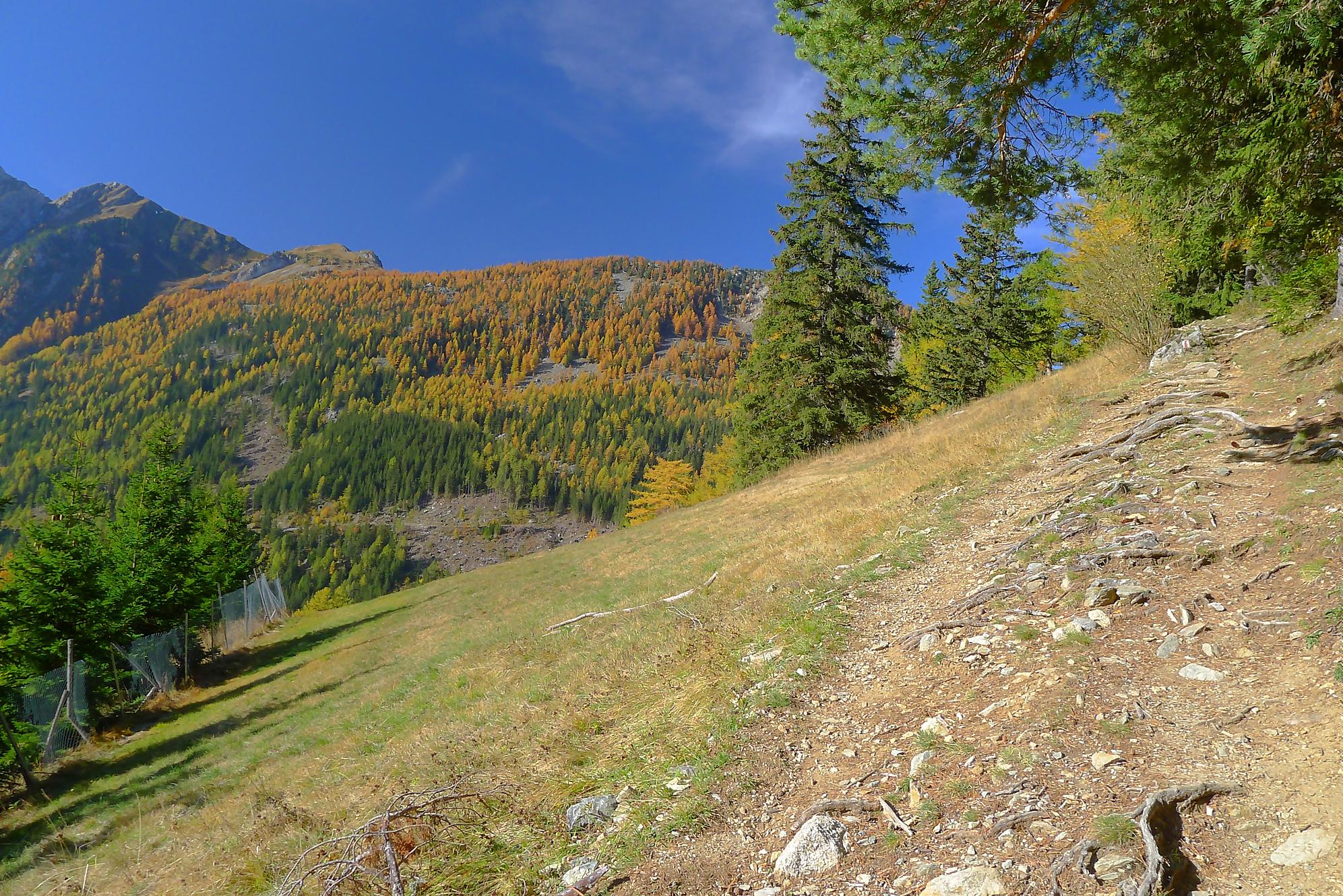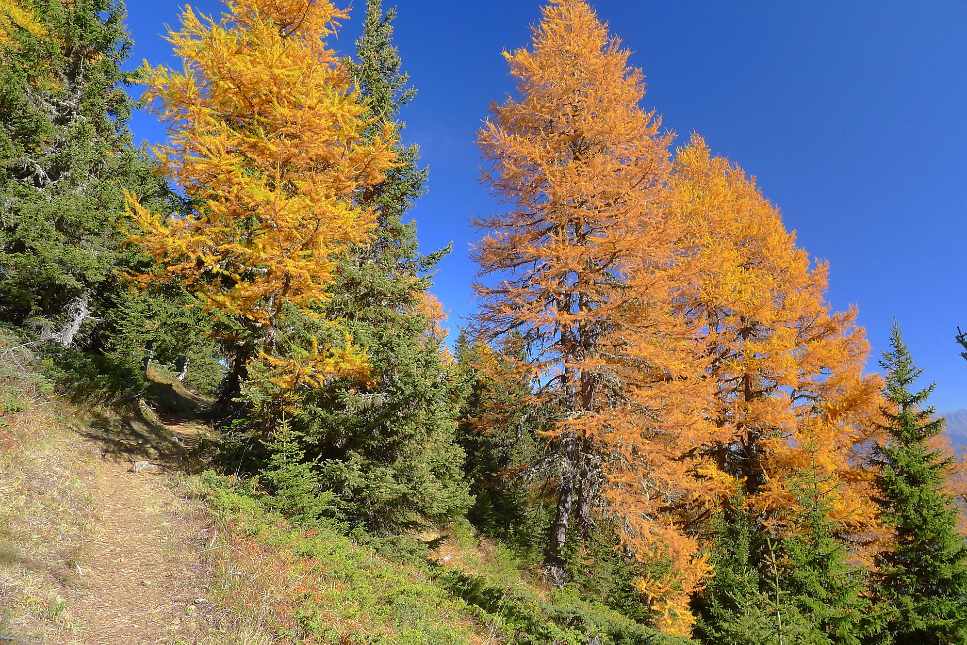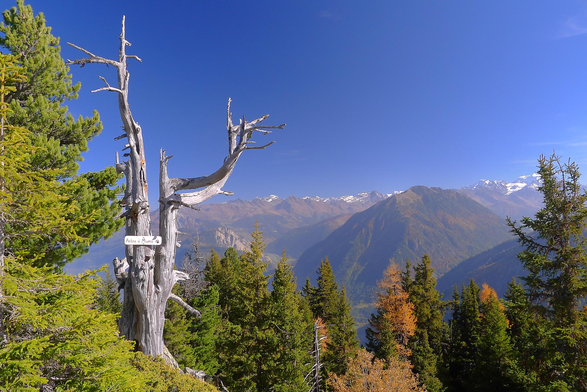 J’ai attendu sur le parking du restaurant de La Forclaz, que le soleil de l’automne arrive enfin. Puis je suis parti, montant dans la face SE par le chemin au-dessus de Sé de Meylan. J’aurai préféré le prendre à la descente, car plus doux, mais étant orienté E, j’ai préféré l’option soleil du matin. Le premier tiers est pentu, jusqu’à la fin de Sé de Meylan, mais les mélèzes en feu rendent les lieux extraordinaires, puis en sortant de la forêt (Le Larzey), l’épicéa et mélèze cèdent leur place aux génévriers et rhododendrons, ainsi qu’à quelques aroles. On passe près des paravalanches, une montée pentue, puis trouvons la crête où on arrive peu après au sommet. La commune de Martigny-Combe et le Tour du Mont-Blanc ont installé une bien jolie table d’orientation émaillée, peinte par une artiste. Le panorama s’ouvre sur la vallée du Rhône, Dent Blanche, Grand Combin et Mont-Blanc entre les arbres. Du côté de Trient la vue est bouchée par ces arbres, dommage.
