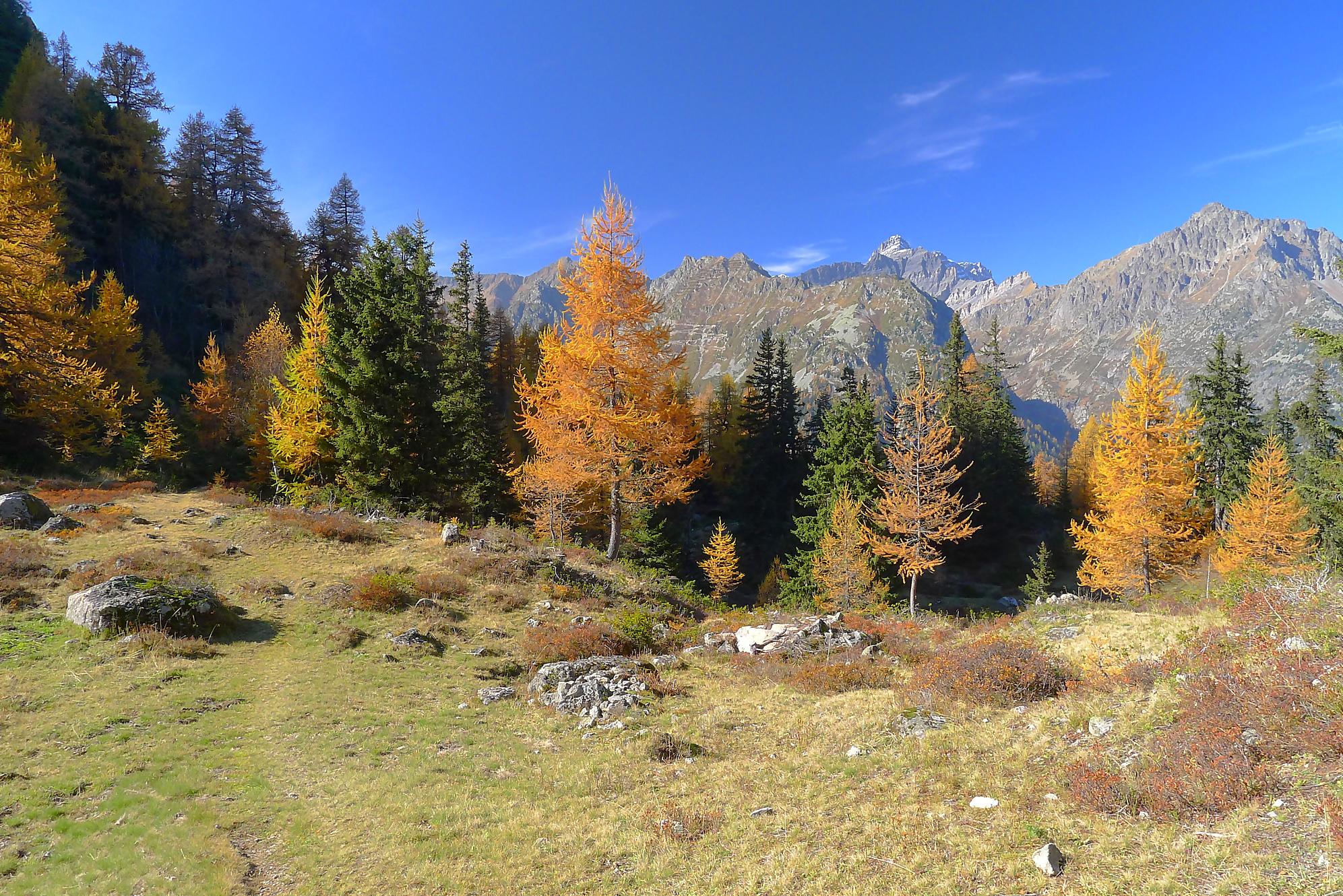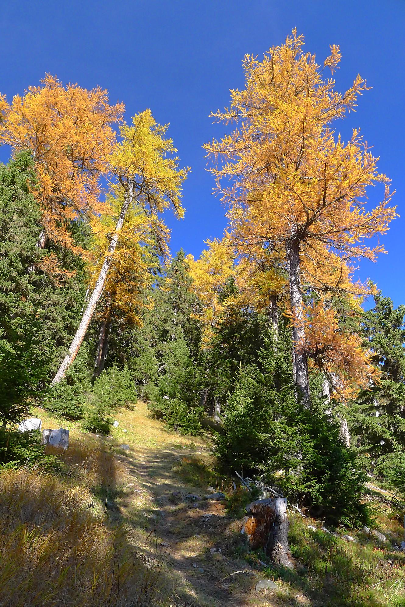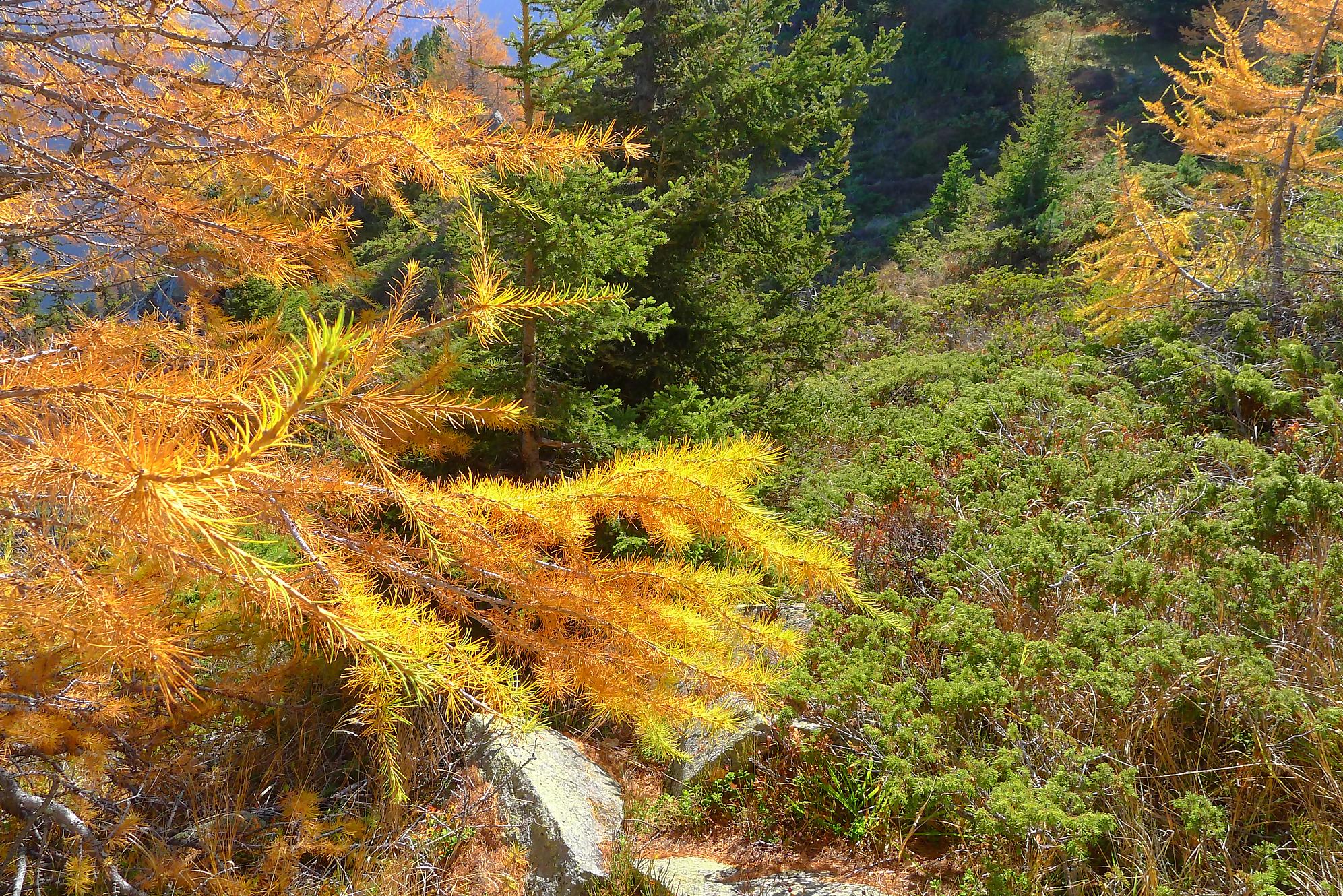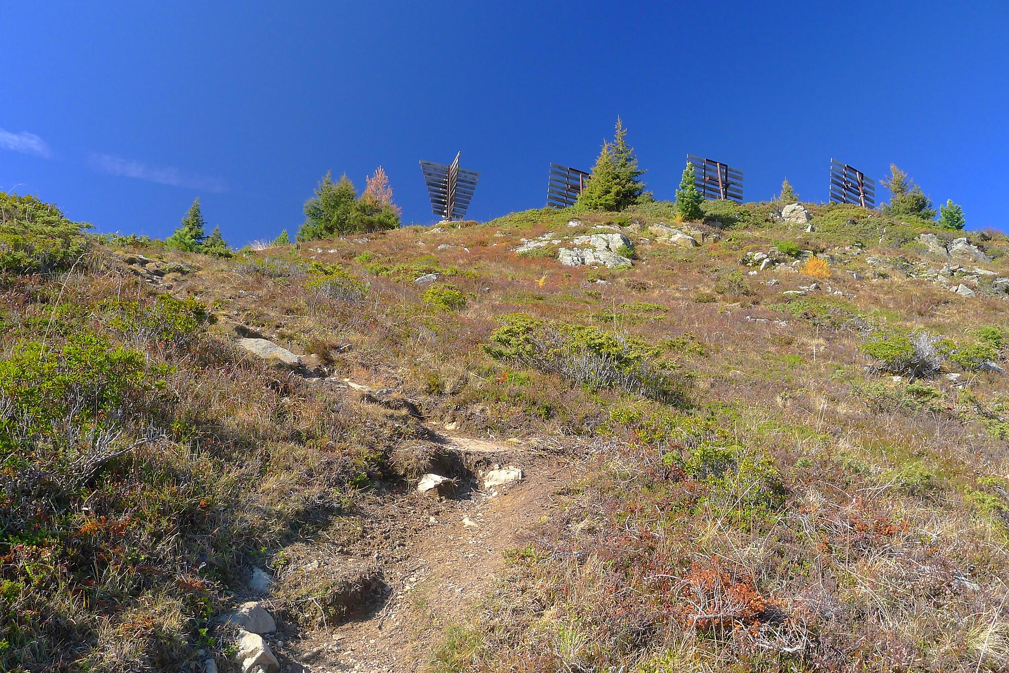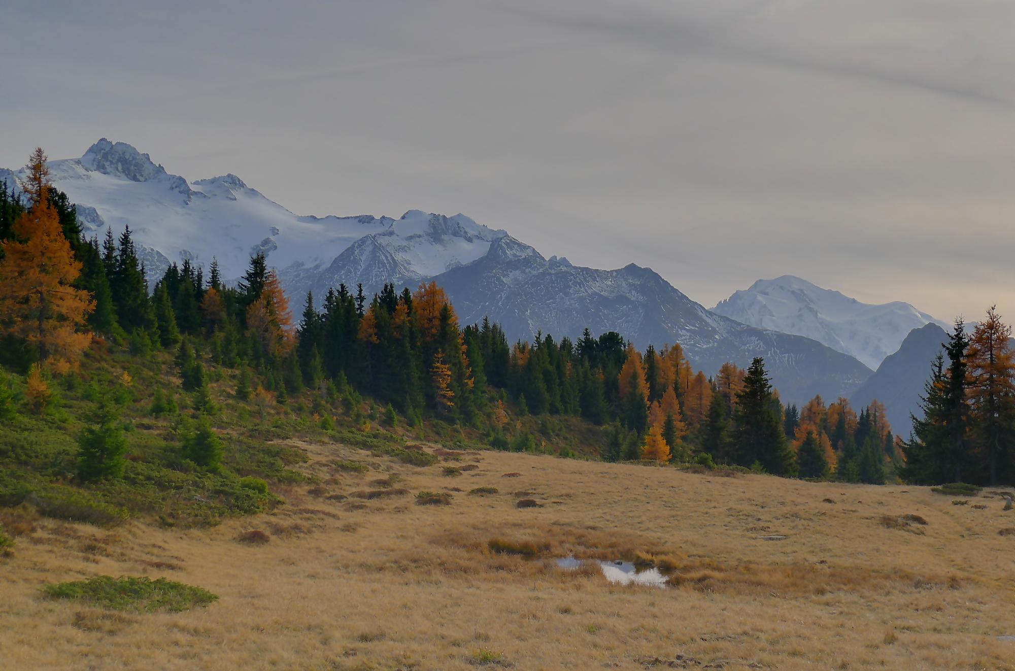 J’ai attendu sur le parking du restaurant de La Forclaz, que le soleil de l’automne arrive enfin. Puis je suis parti, montant dans la face SE par le chemin au-dessus de Sé de Meylan. J’aurai préféré le prendre à la descente, car plus doux, mais étant orienté E, j’ai préféré l’option soleil du matin. Le premier tiers est pentu, jusqu’à la fin de Sé de Meylan, mais les mélèzes en feu rendent les lieux extraordinaires, puis en sortant de la forêt (Le Larzey), l’épicéa et mélèze cèdent leur place aux génévriers et rhododendrons, ainsi qu’à quelques aroles. On passe près des paravalanches, une montée pentue, puis trouvons la crête où on arrive peu après au sommet. La commune de Martigny-Combe et le Tour du Mont-Blanc ont installé une bien jolie table d’orientation émaillée, peinte par une artiste. Le panorama s’ouvre sur la vallée du Rhône, Dent Blanche, Grand Combin et Mont-Blanc entre les arbres. Du côté de Trient la vue est bouchée par ces arbres, dommage.