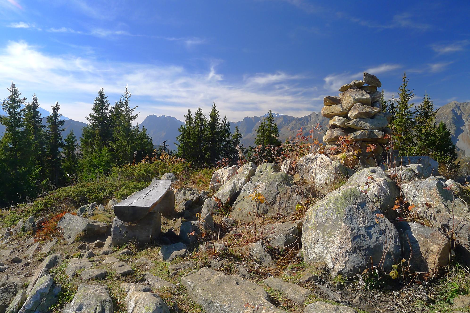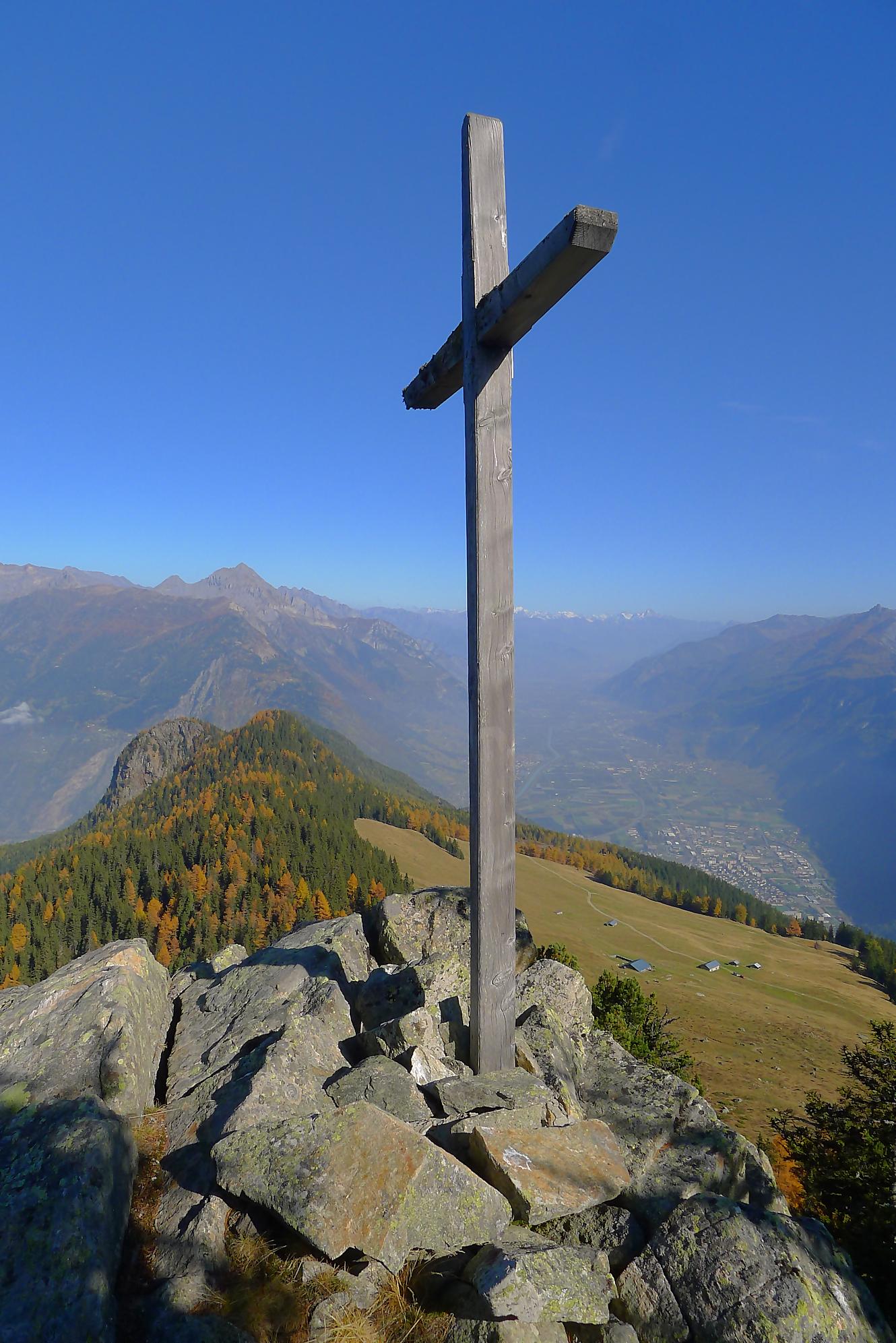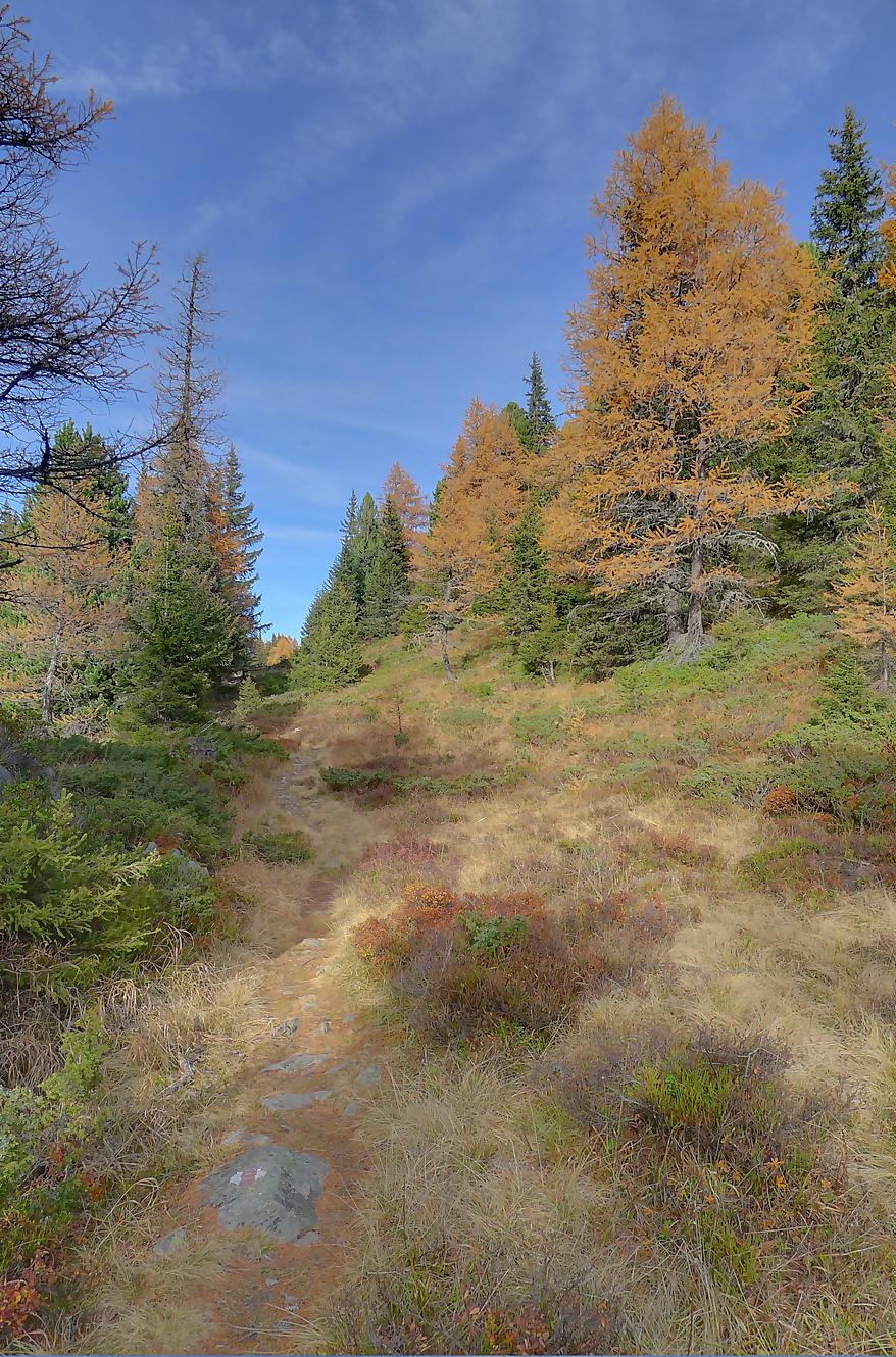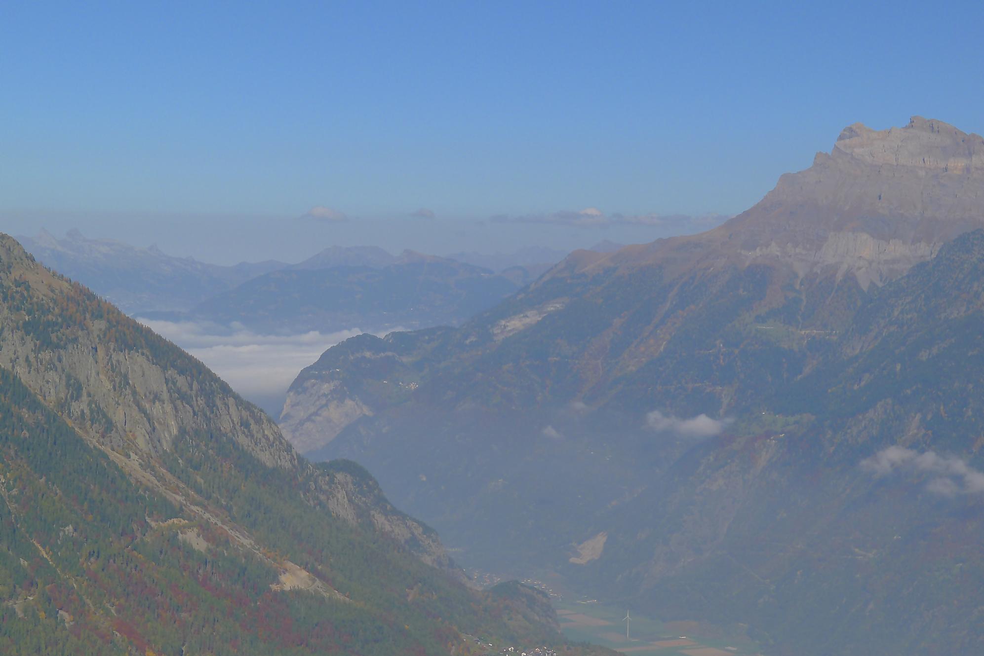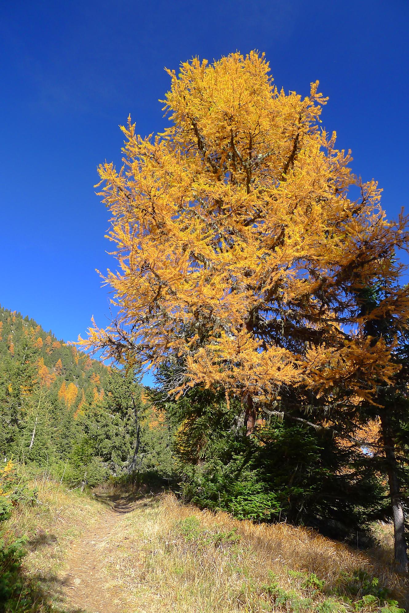 J’ai attendu sur le parking du restaurant de La Forclaz, que le soleil de l’automne arrive enfin. Puis je suis parti, montant dans la face SE par le chemin au-dessus de Sé de Meylan. J’aurai préféré le prendre à la descente, car plus doux, mais étant orienté E, j’ai préféré l’option soleil du matin. Le premier tiers est pentu, jusqu’à la fin de Sé de Meylan, mais les mélèzes en feu rendent les lieux extraordinaires, puis en sortant de la forêt (Le Larzey), l’épicéa et mélèze cèdent leur place aux génévriers et rhododendrons, ainsi qu’à quelques aroles. On passe près des paravalanches, une montée pentue, puis trouvons la crête où on arrive peu après au sommet. La commune de Martigny-Combe et le Tour du Mont-Blanc ont installé une bien jolie table d’orientation émaillée, peinte par une artiste. Le panorama s’ouvre sur la vallée du Rhône, Dent Blanche, Grand Combin et Mont-Blanc entre les arbres. Du côté de Trient la vue est bouchée par ces arbres, dommage.