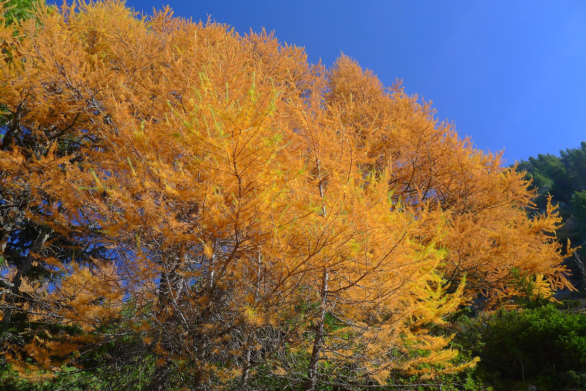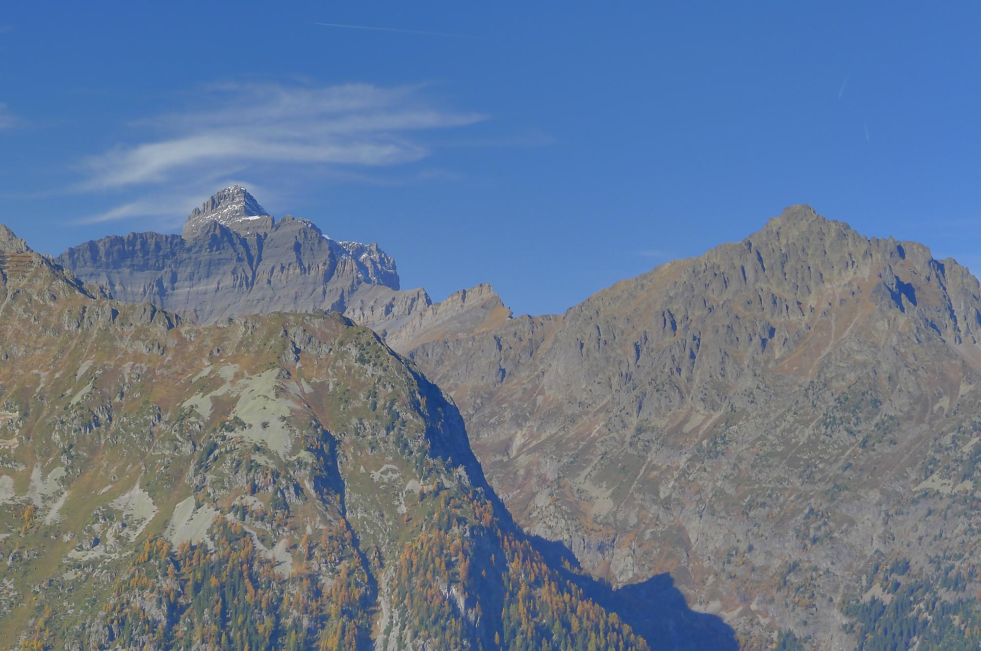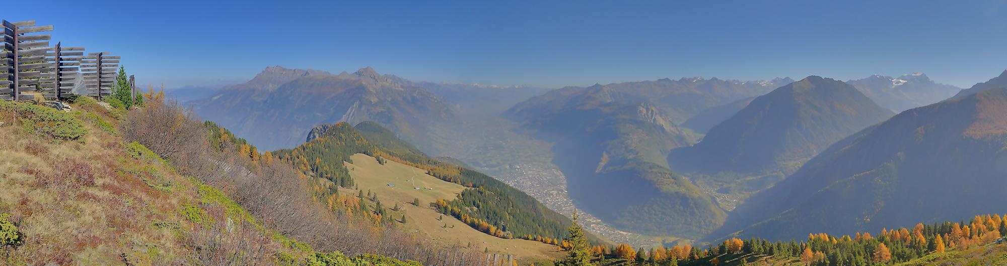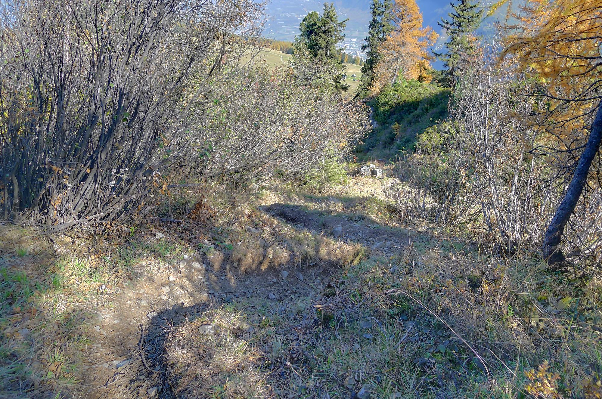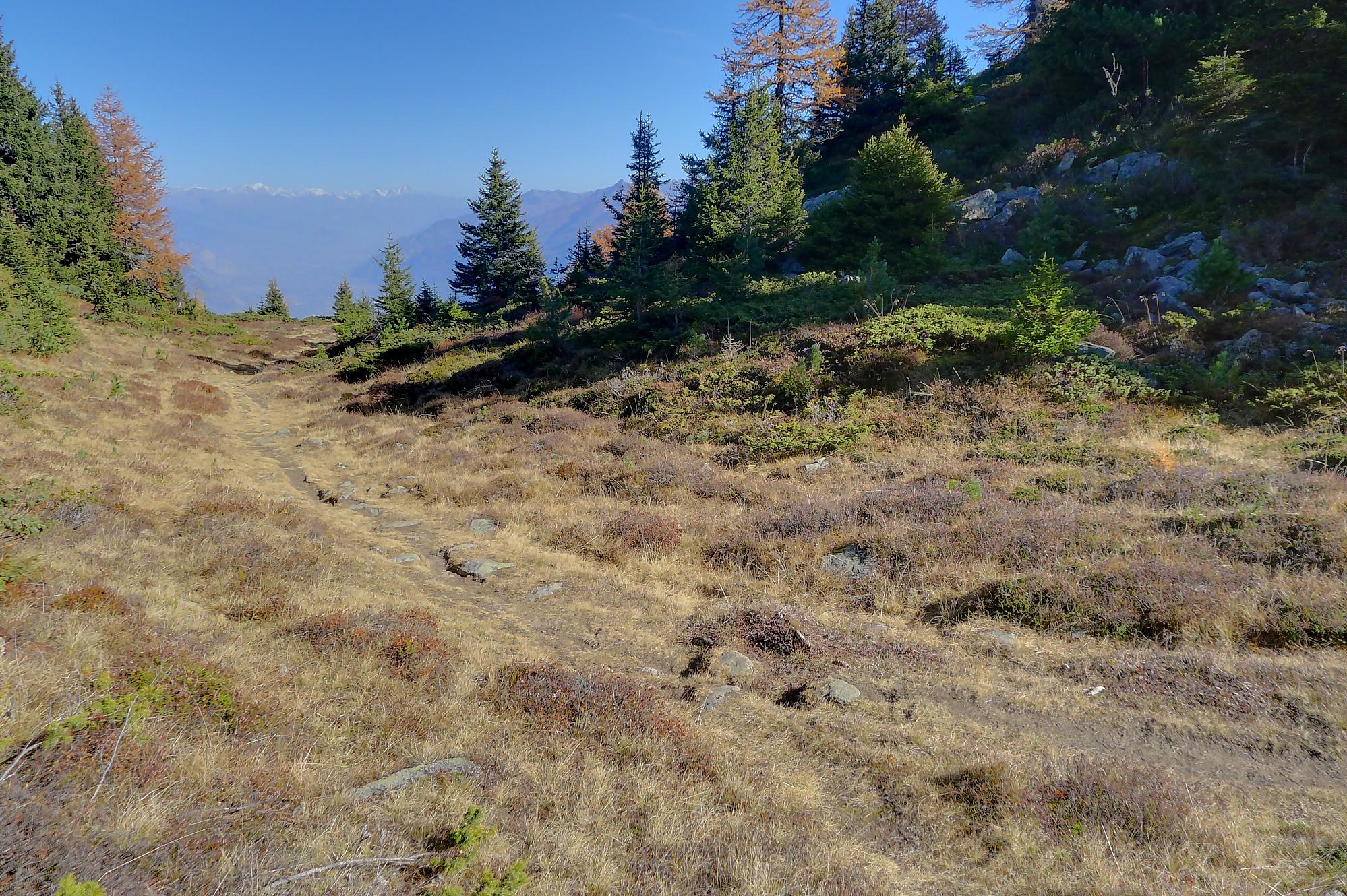 J’ai attendu sur le parking du restaurant de La Forclaz, que le soleil de l’automne arrive enfin. Puis je suis parti, montant dans la face SE par le chemin au-dessus de Sé de Meylan. J’aurai préféré le prendre à la descente, car plus doux, mais étant orienté E, j’ai préféré l’option soleil du matin. Le premier tiers est pentu, jusqu’à la fin de Sé de Meylan, mais les mélèzes en feu rendent les lieux extraordinaires, puis en sortant de la forêt (Le Larzey), l’épicéa et mélèze cèdent leur place aux génévriers et rhododendrons, ainsi qu’à quelques aroles. On passe près des paravalanches, une montée pentue, puis trouvons la crête où on arrive peu après au sommet. La commune de Martigny-Combe et le Tour du Mont-Blanc ont installé une bien jolie table d’orientation émaillée, peinte par une artiste. Le panorama s’ouvre sur la vallée du Rhône, Dent Blanche, Grand Combin et Mont-Blanc entre les arbres. Du côté de Trient la vue est bouchée par ces arbres, dommage.