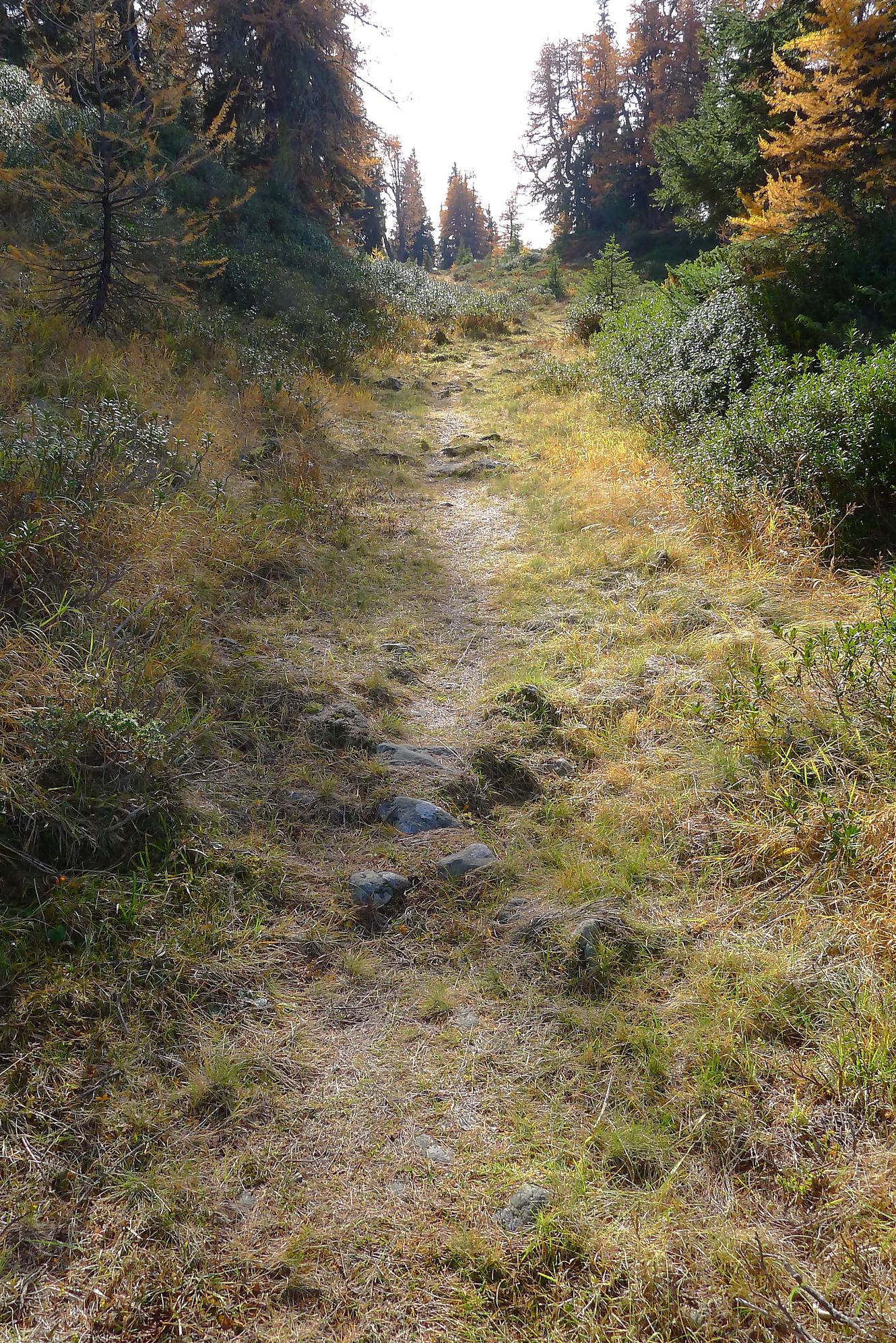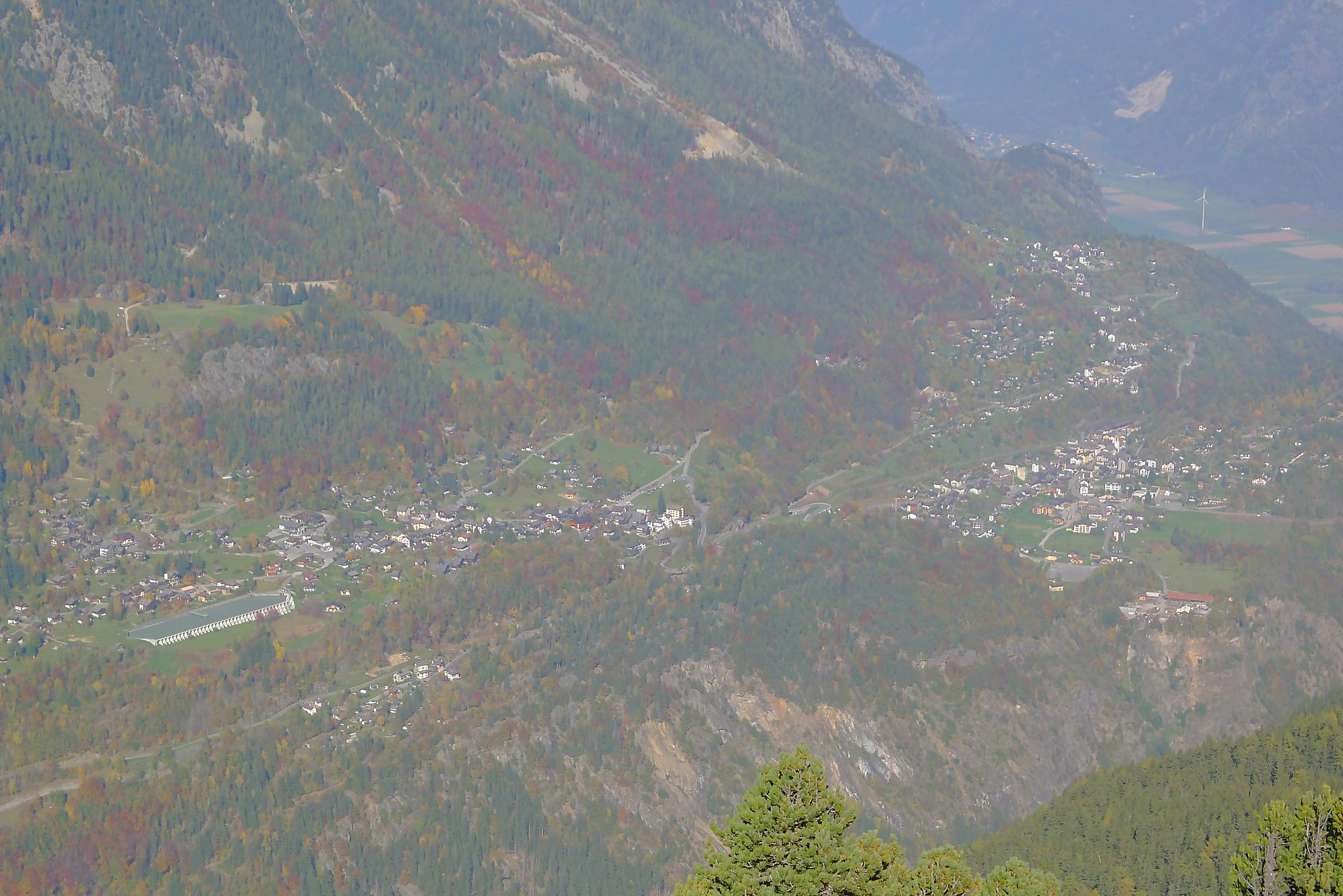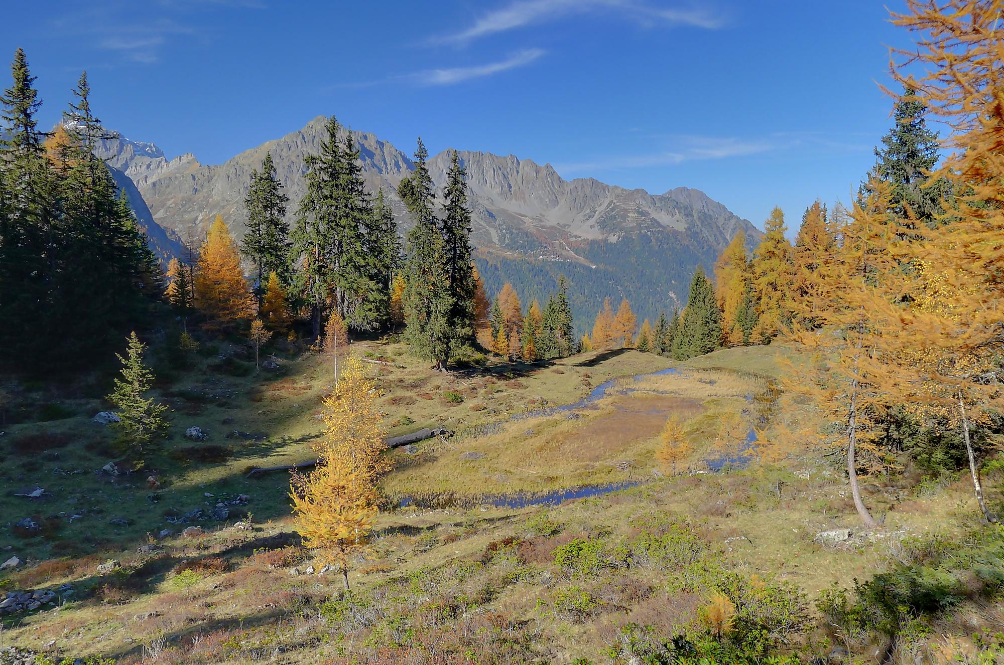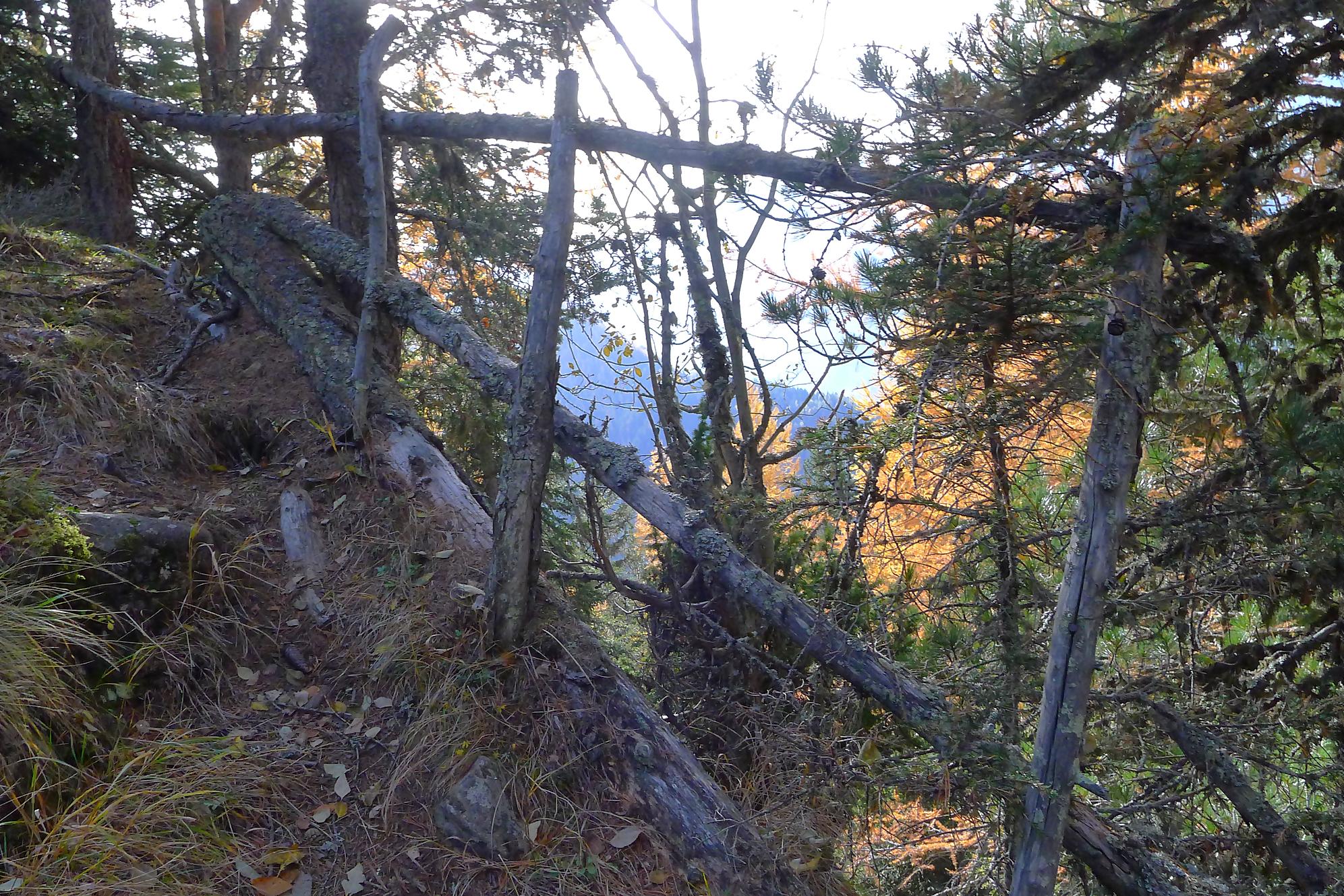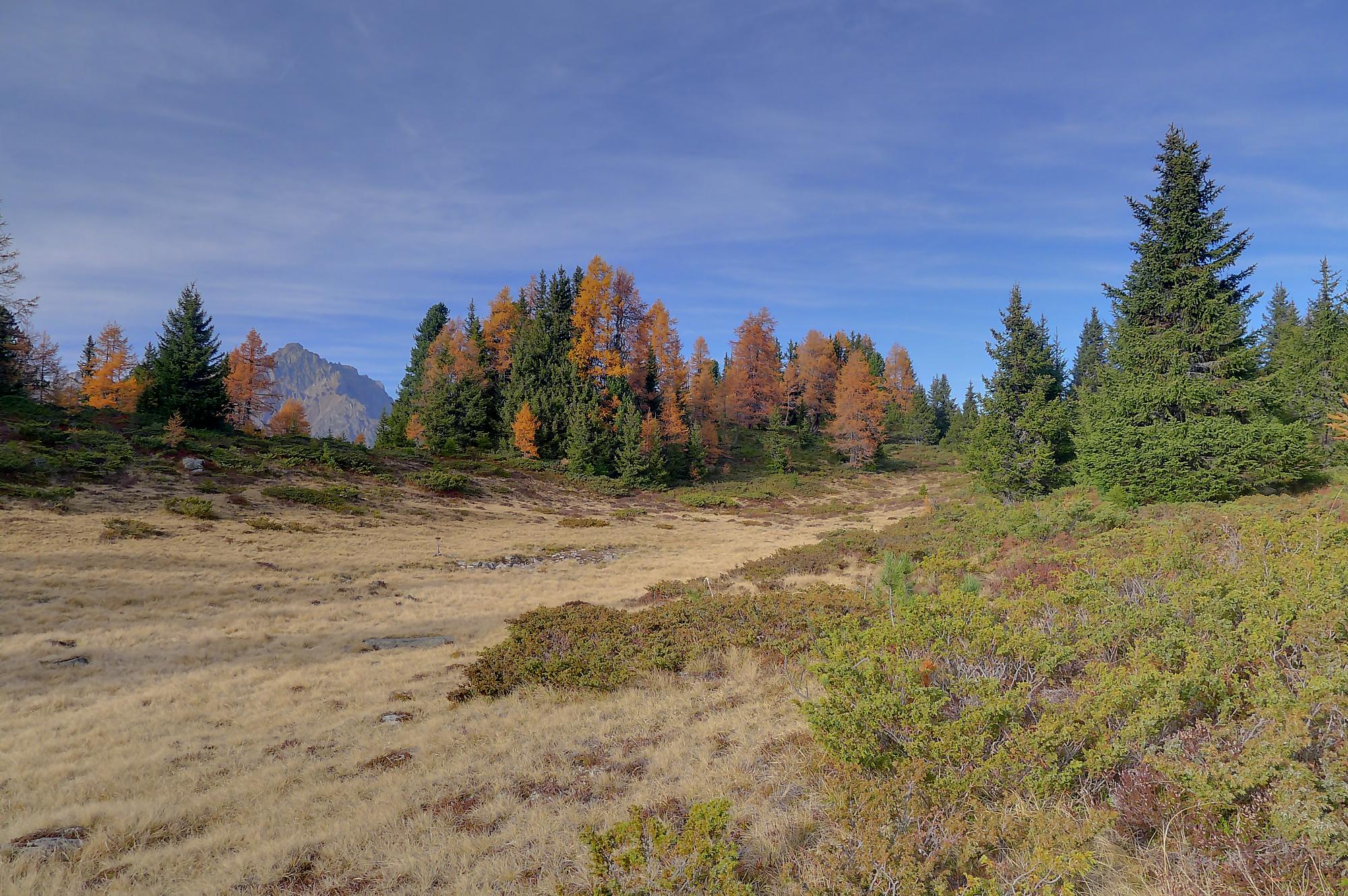 J’ai attendu sur le parking du restaurant de La Forclaz, que le soleil de l’automne arrive enfin. Puis je suis parti, montant dans la face SE par le chemin au-dessus de Sé de Meylan. J’aurai préféré le prendre à la descente, car plus doux, mais étant orienté E, j’ai préféré l’option soleil du matin. Le premier tiers est pentu, jusqu’à la fin de Sé de Meylan, mais les mélèzes en feu rendent les lieux extraordinaires, puis en sortant de la forêt (Le Larzey), l’épicéa et mélèze cèdent leur place aux génévriers et rhododendrons, ainsi qu’à quelques aroles. On passe près des paravalanches, une montée pentue, puis trouvons la crête où on arrive peu après au sommet. La commune de Martigny-Combe et le Tour du Mont-Blanc ont installé une bien jolie table d’orientation émaillée, peinte par une artiste. Le panorama s’ouvre sur la vallée du Rhône, Dent Blanche, Grand Combin et Mont-Blanc entre les arbres. Du côté de Trient la vue est bouchée par ces arbres, dommage.