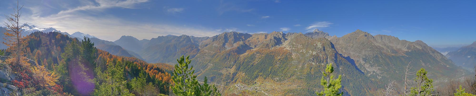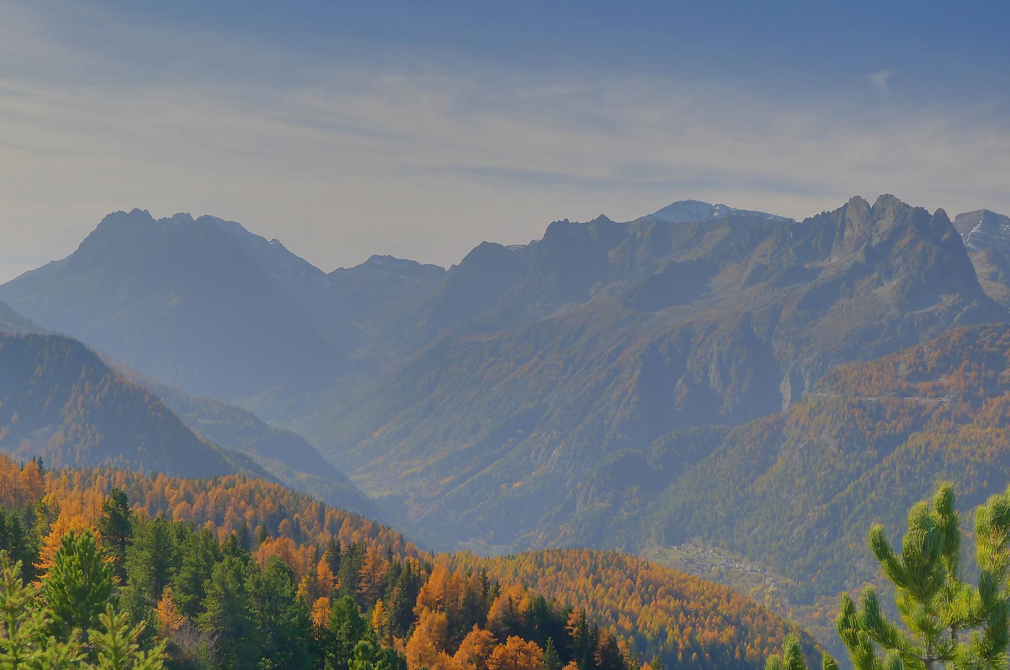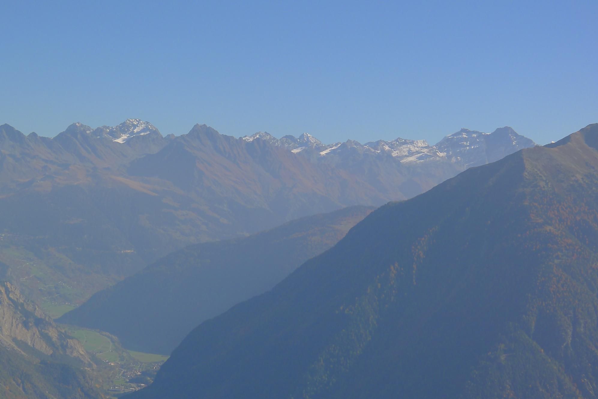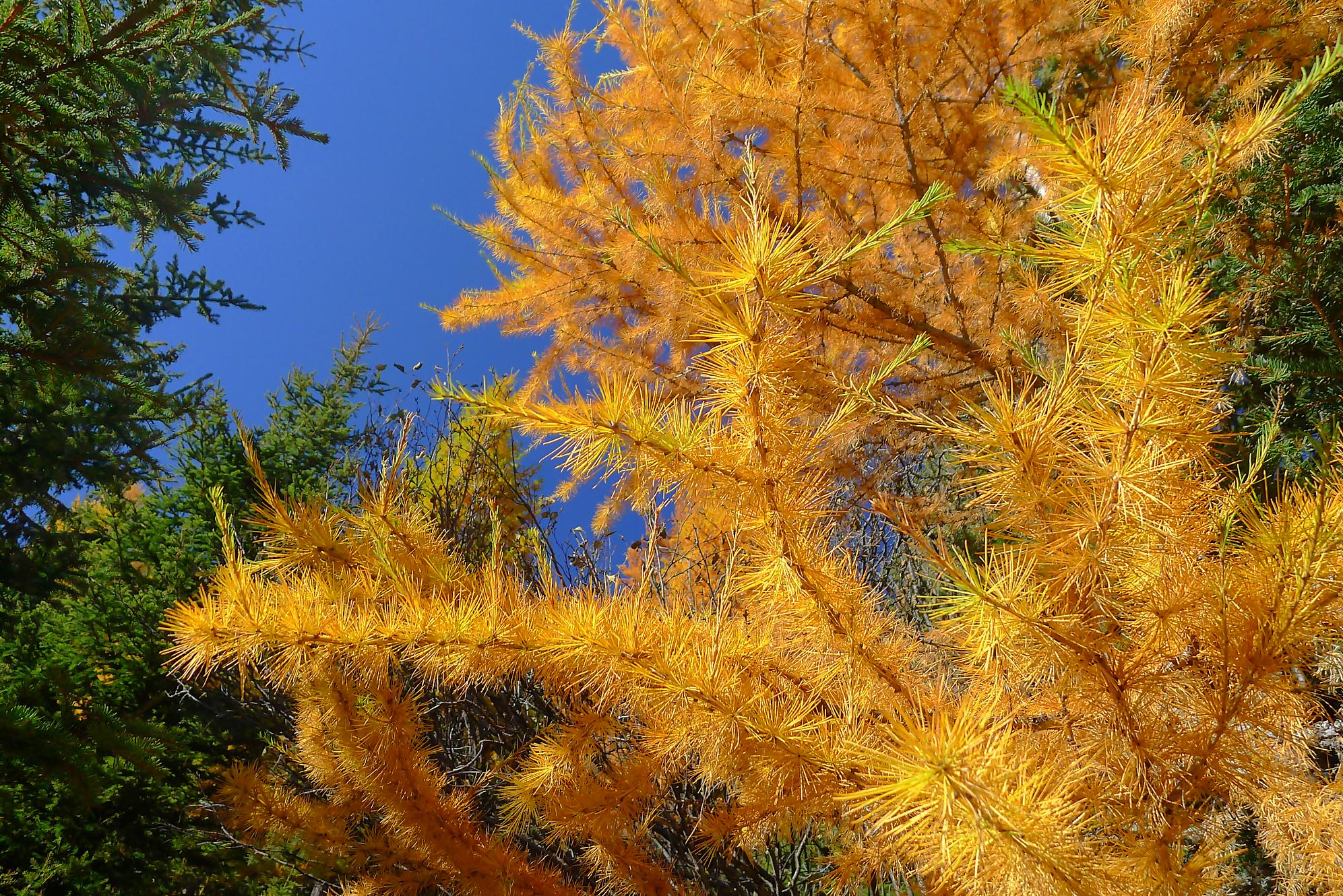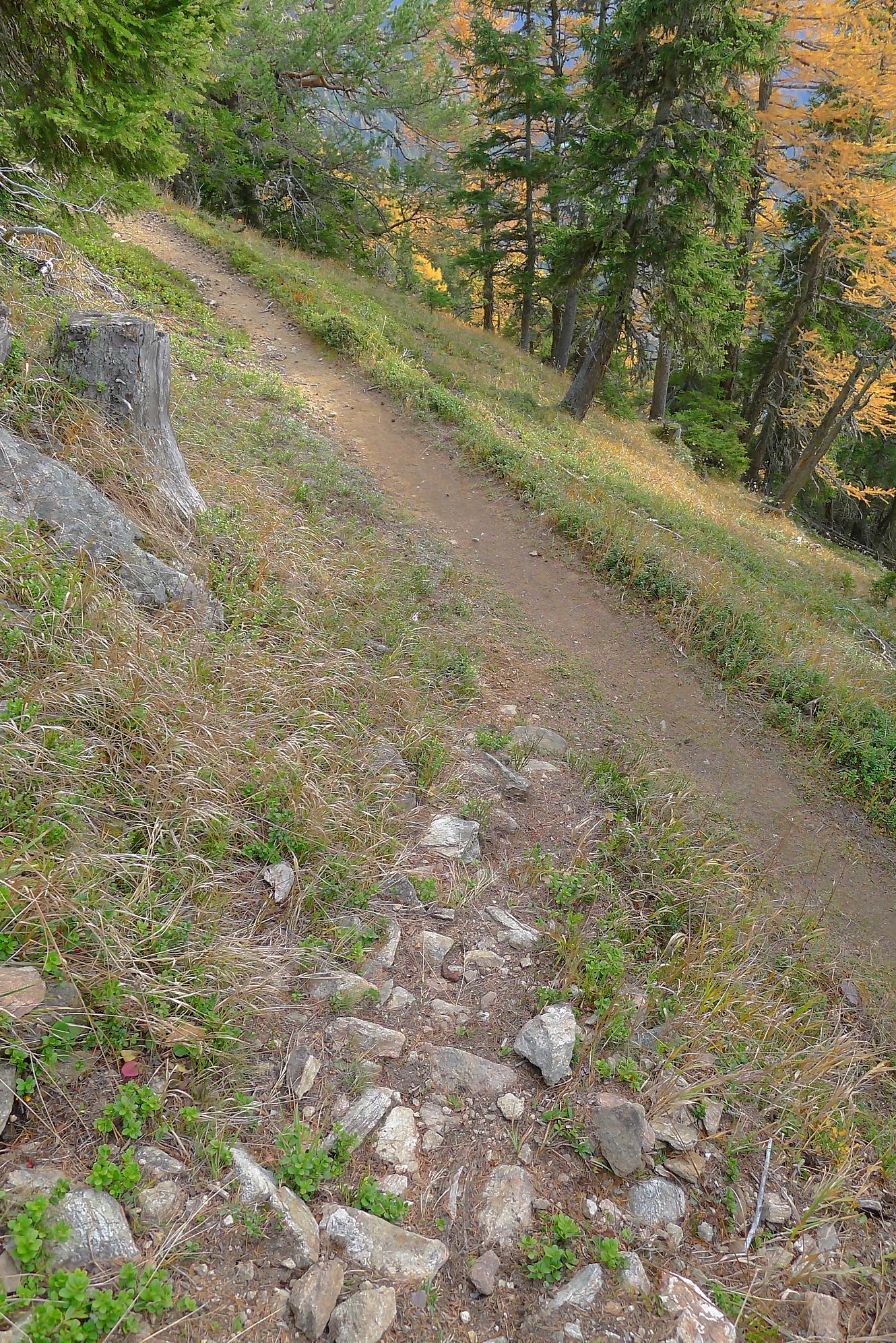 J’ai attendu sur le parking du restaurant de La Forclaz, que le soleil de l’automne arrive enfin. Puis je suis parti, montant dans la face SE par le chemin au-dessus de Sé de Meylan. J’aurai préféré le prendre à la descente, car plus doux, mais étant orienté E, j’ai préféré l’option soleil du matin. Le premier tiers est pentu, jusqu’à la fin de Sé de Meylan, mais les mélèzes en feu rendent les lieux extraordinaires, puis en sortant de la forêt (Le Larzey), l’épicéa et mélèze cèdent leur place aux génévriers et rhododendrons, ainsi qu’à quelques aroles. On passe près des paravalanches, une montée pentue, puis trouvons la crête où on arrive peu après au sommet. La commune de Martigny-Combe et le Tour du Mont-Blanc ont installé une bien jolie table d’orientation émaillée, peinte par une artiste. Le panorama s’ouvre sur la vallée du Rhône, Dent Blanche, Grand Combin et Mont-Blanc entre les arbres. Du côté de Trient la vue est bouchée par ces arbres, dommage.