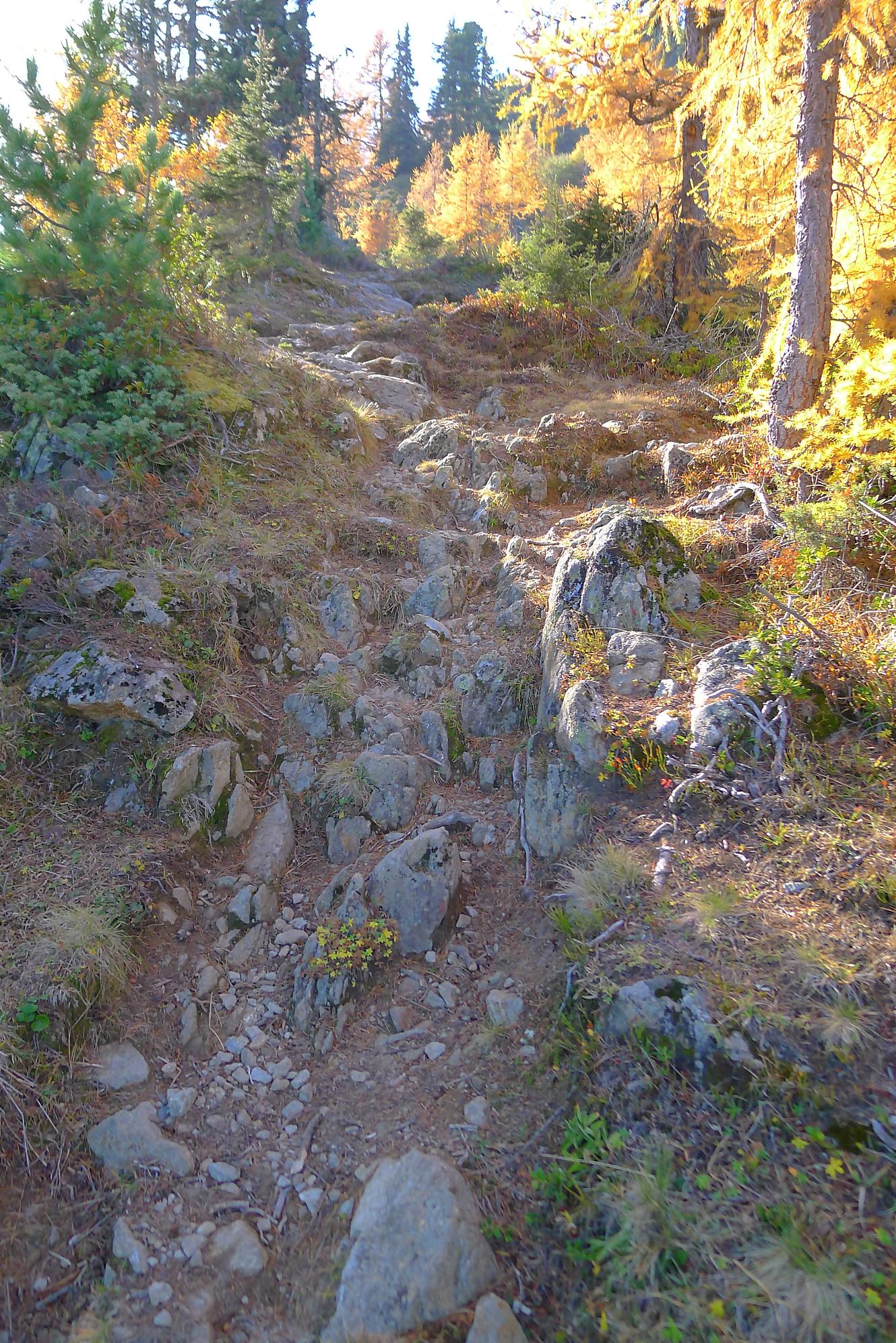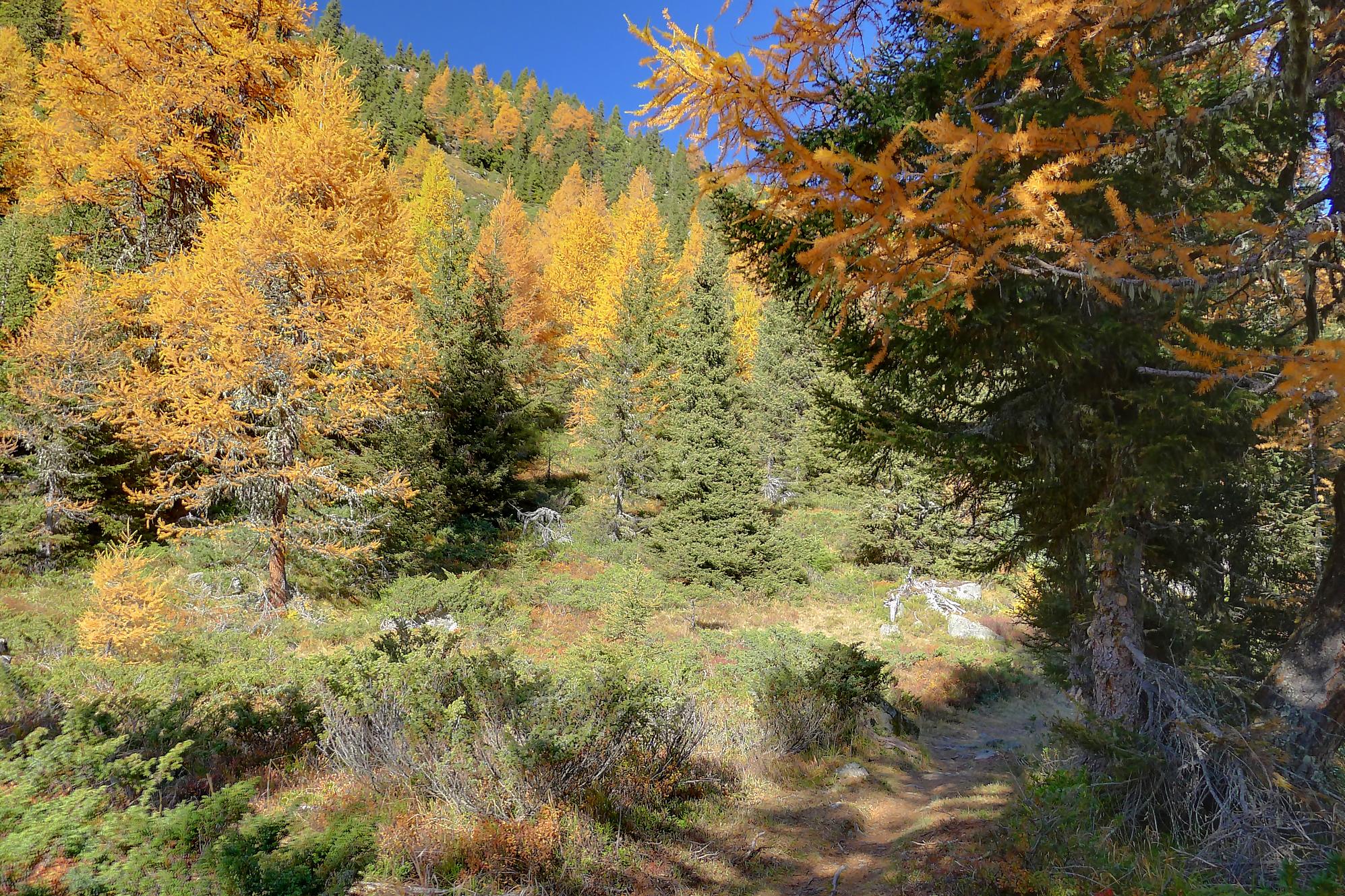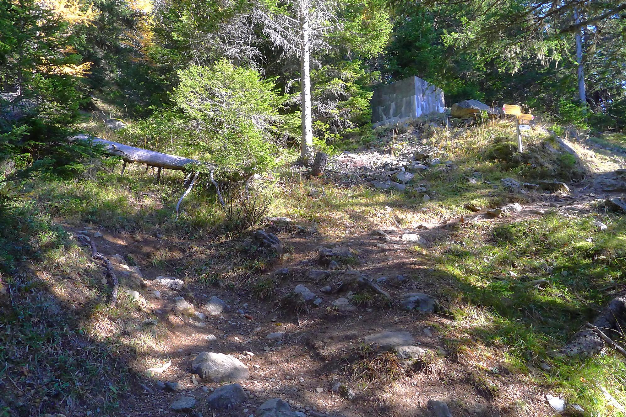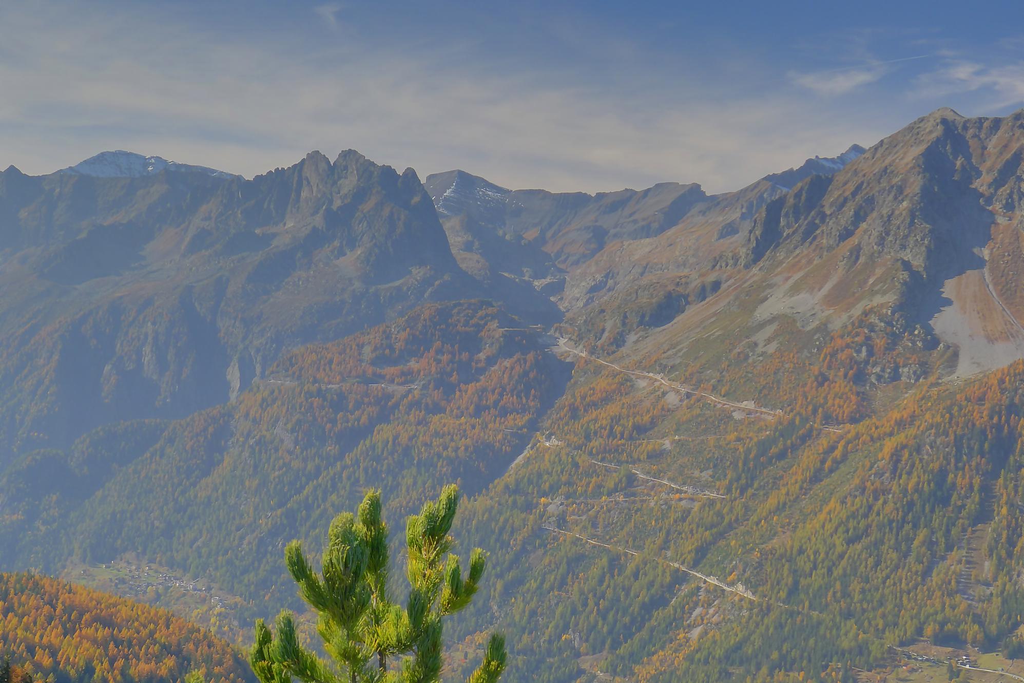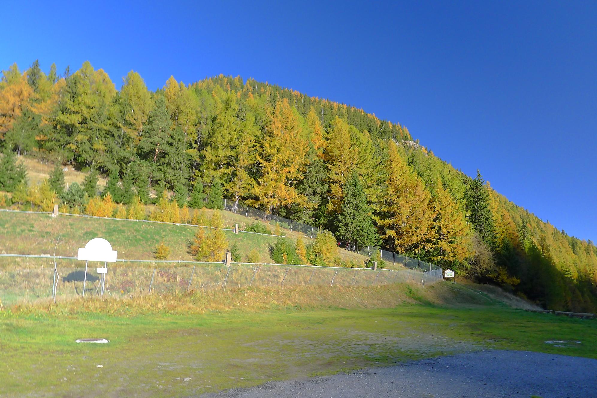 J’ai attendu sur le parking du restaurant de La Forclaz, que le soleil de l’automne arrive enfin. Puis je suis parti, montant dans la face SE par le chemin au-dessus de Sé de Meylan. J’aurai préféré le prendre à la descente, car plus doux, mais étant orienté E, j’ai préféré l’option soleil du matin. Le premier tiers est pentu, jusqu’à la fin de Sé de Meylan, mais les mélèzes en feu rendent les lieux extraordinaires, puis en sortant de la forêt (Le Larzey), l’épicéa et mélèze cèdent leur place aux génévriers et rhododendrons, ainsi qu’à quelques aroles. On passe près des paravalanches, une montée pentue, puis trouvons la crête où on arrive peu après au sommet. La commune de Martigny-Combe et le Tour du Mont-Blanc ont installé une bien jolie table d’orientation émaillée, peinte par une artiste. Le panorama s’ouvre sur la vallée du Rhône, Dent Blanche, Grand Combin et Mont-Blanc entre les arbres. Du côté de Trient la vue est bouchée par ces arbres, dommage.