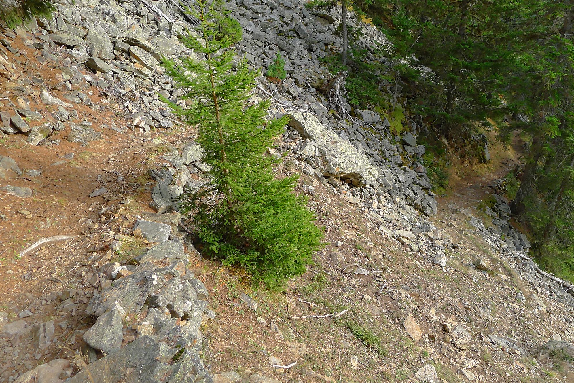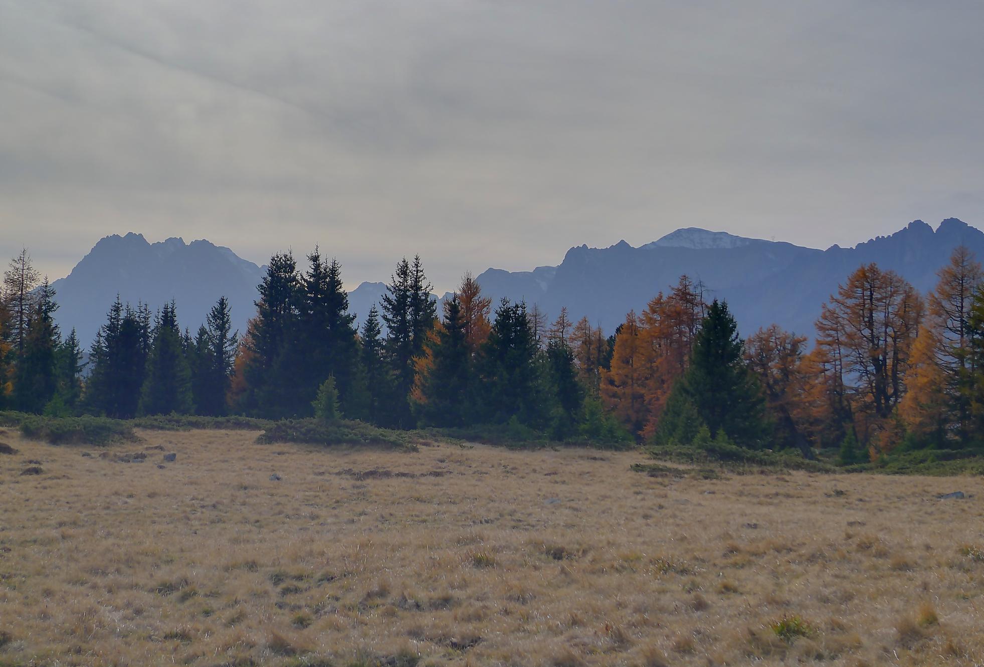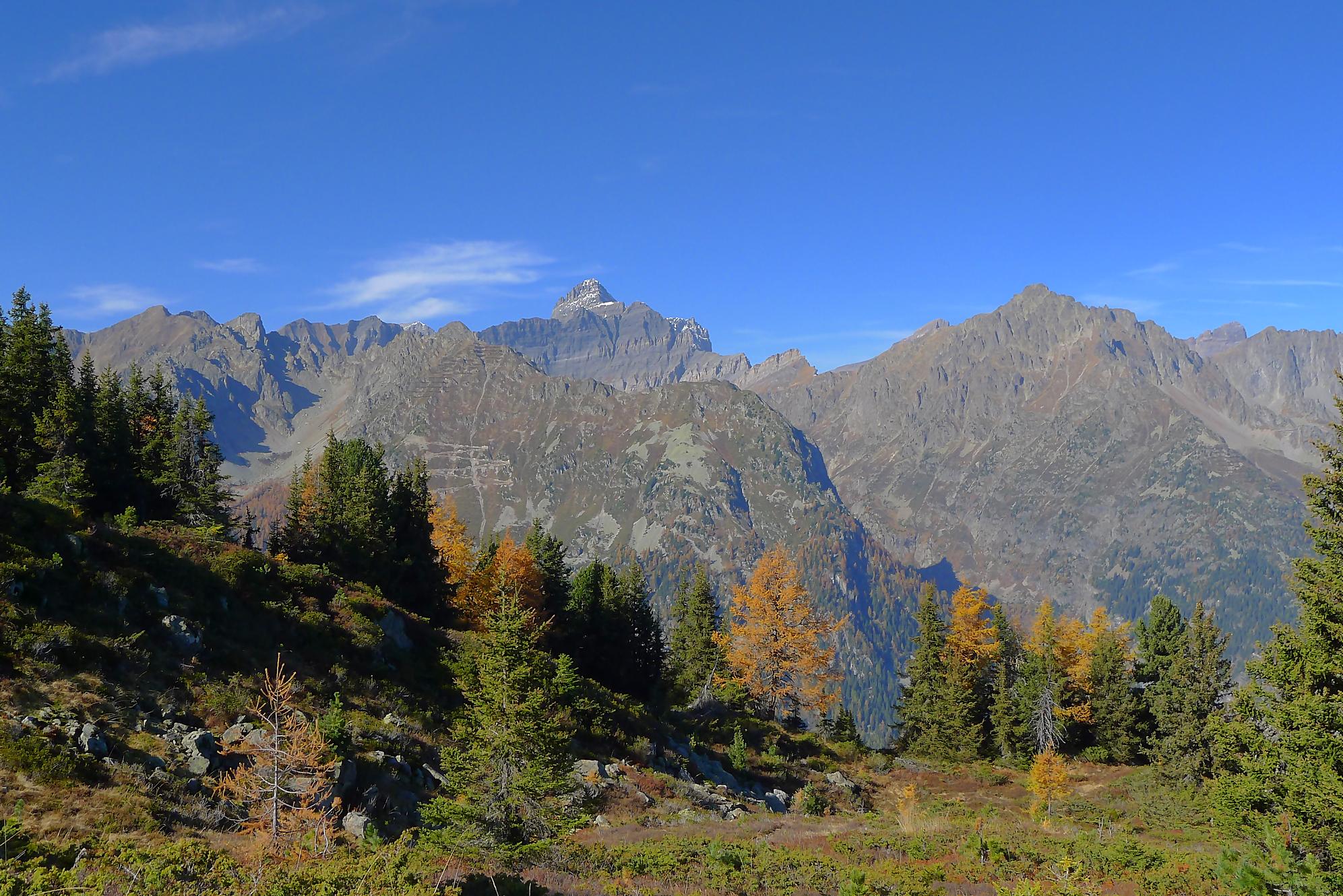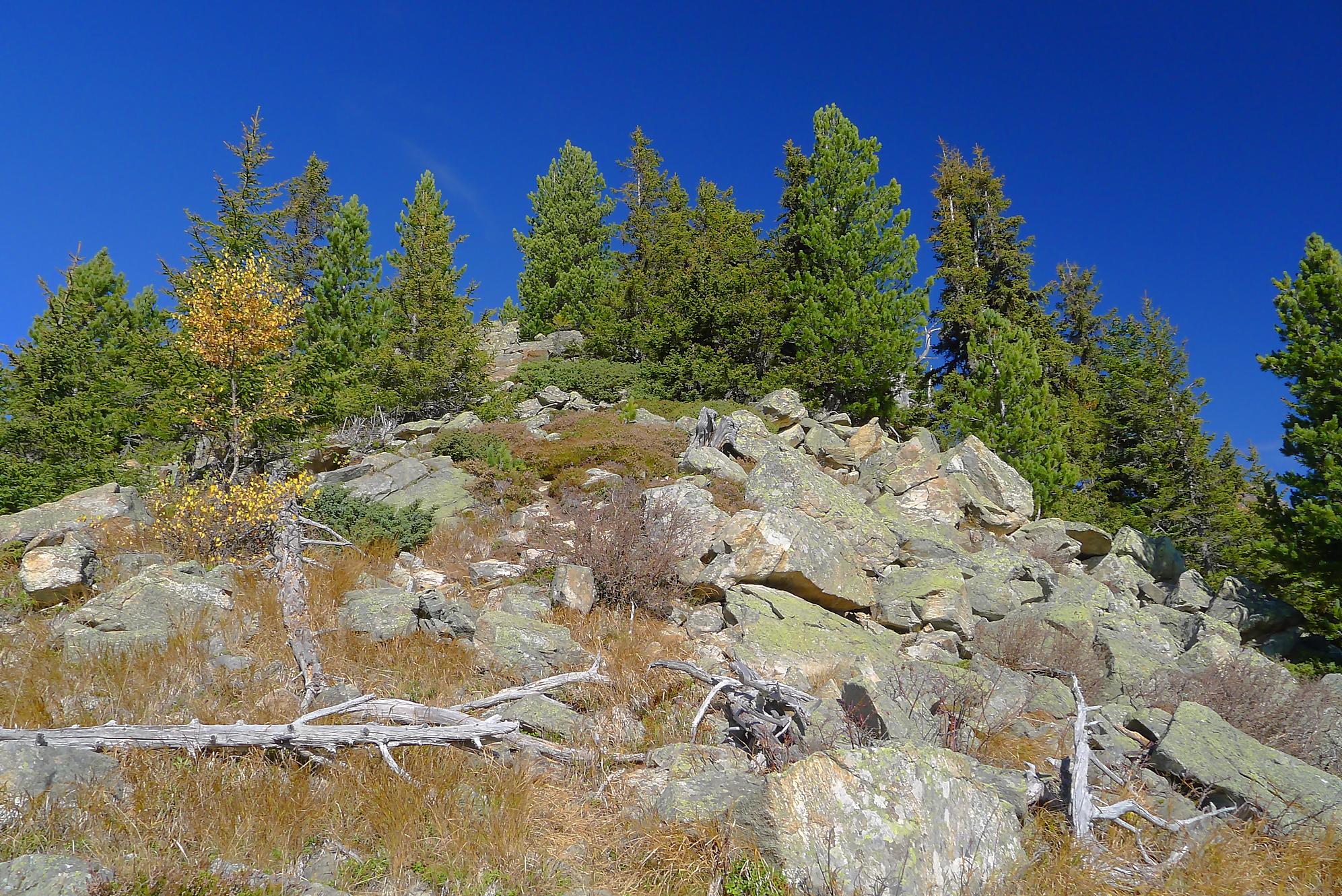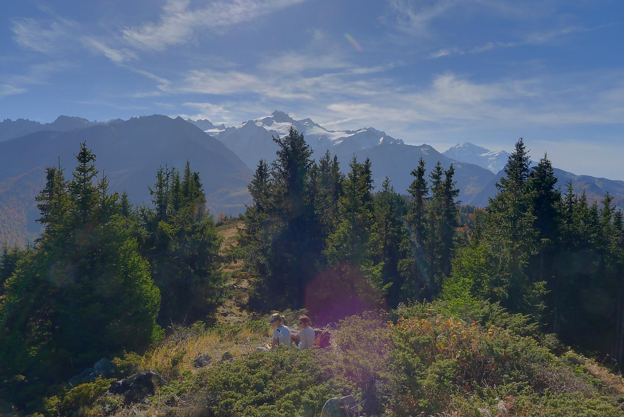 J’ai attendu sur le parking du restaurant de La Forclaz, que le soleil de l’automne arrive enfin. Puis je suis parti, montant dans la face SE par le chemin au-dessus de Sé de Meylan. J’aurai préféré le prendre à la descente, car plus doux, mais étant orienté E, j’ai préféré l’option soleil du matin. Le premier tiers est pentu, jusqu’à la fin de Sé de Meylan, mais les mélèzes en feu rendent les lieux extraordinaires, puis en sortant de la forêt (Le Larzey), l’épicéa et mélèze cèdent leur place aux génévriers et rhododendrons, ainsi qu’à quelques aroles. On passe près des paravalanches, une montée pentue, puis trouvons la crête où on arrive peu après au sommet. La commune de Martigny-Combe et le Tour du Mont-Blanc ont installé une bien jolie table d’orientation émaillée, peinte par une artiste. Le panorama s’ouvre sur la vallée du Rhône, Dent Blanche, Grand Combin et Mont-Blanc entre les arbres. Du côté de Trient la vue est bouchée par ces arbres, dommage.