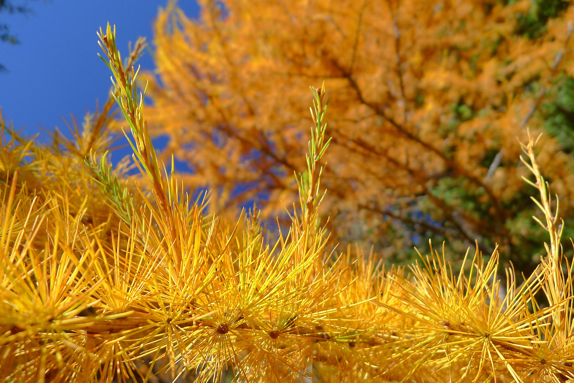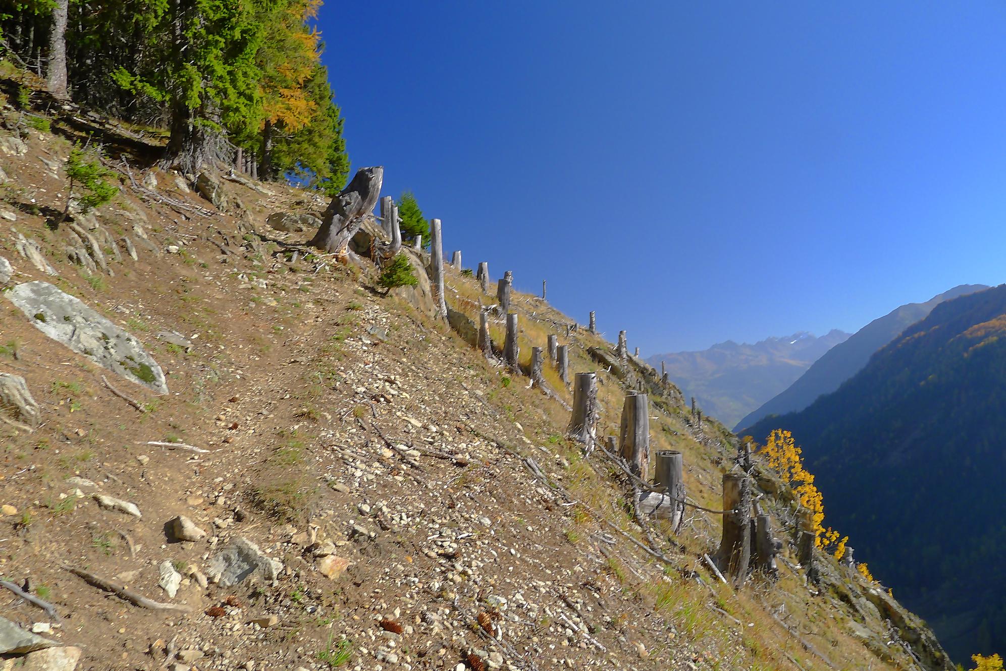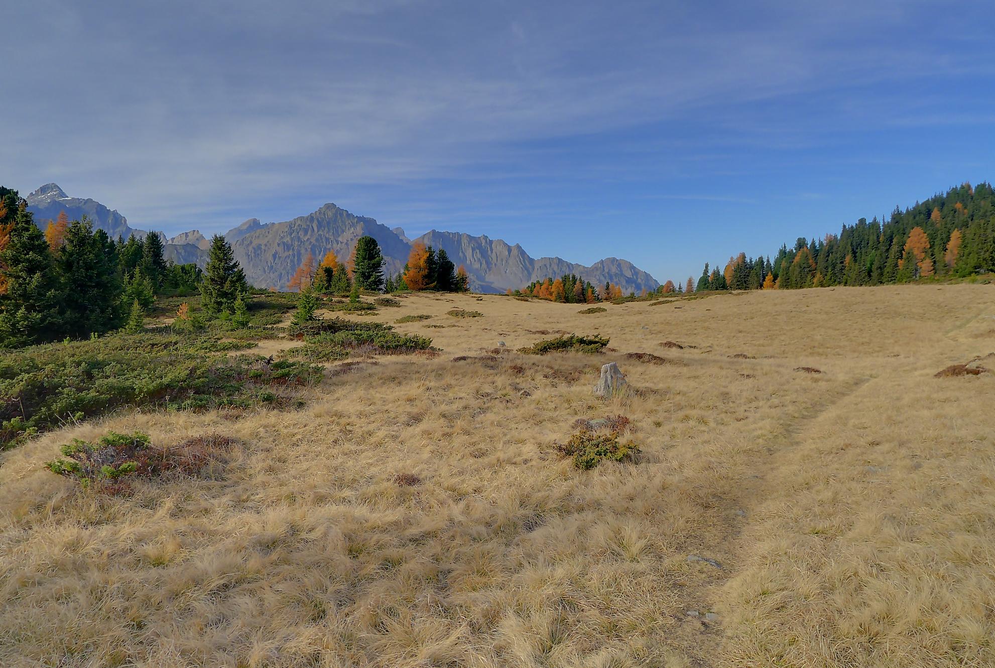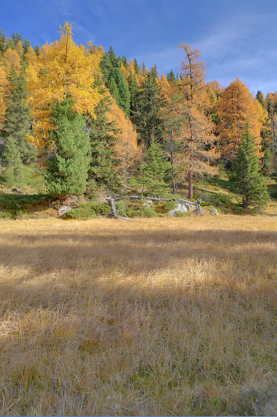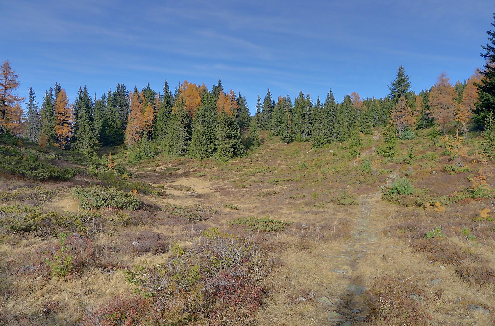J’ai attendu sur le parking du restaurant de La Forclaz, que le soleil de l’automne arrive enfin. Puis je suis parti, montant dans la face SE par le chemin au-dessus de Sé de Meylan. J’aurai préféré le prendre à la descente, car plus doux, mais étant orienté E, j’ai préféré l’option soleil du matin. Le premier tiers est pentu, jusqu’à la fin de Sé de Meylan, mais les mélèzes en feu rendent les lieux extraordinaires, puis en sortant de la forêt (Le Larzey), l’épicéa et mélèze cèdent leur place aux génévriers et rhododendrons, ainsi qu’à quelques aroles. On passe près des paravalanches, une montée pentue, puis trouvons la crête où on arrive peu après au sommet. La commune de Martigny-Combe et le Tour du Mont-Blanc ont installé une bien jolie table d’orientation émaillée, peinte par une artiste. Le panorama s’ouvre sur la vallée du Rhône, Dent Blanche, Grand Combin et Mont-Blanc entre les arbres. Du côté de Trient la vue est bouchée par ces arbres, dommage.