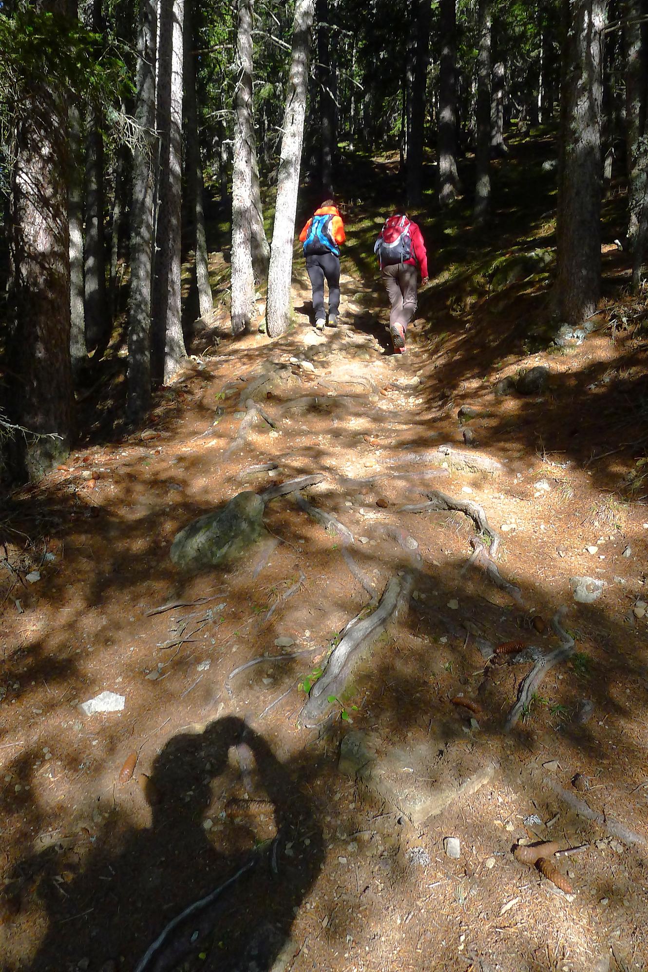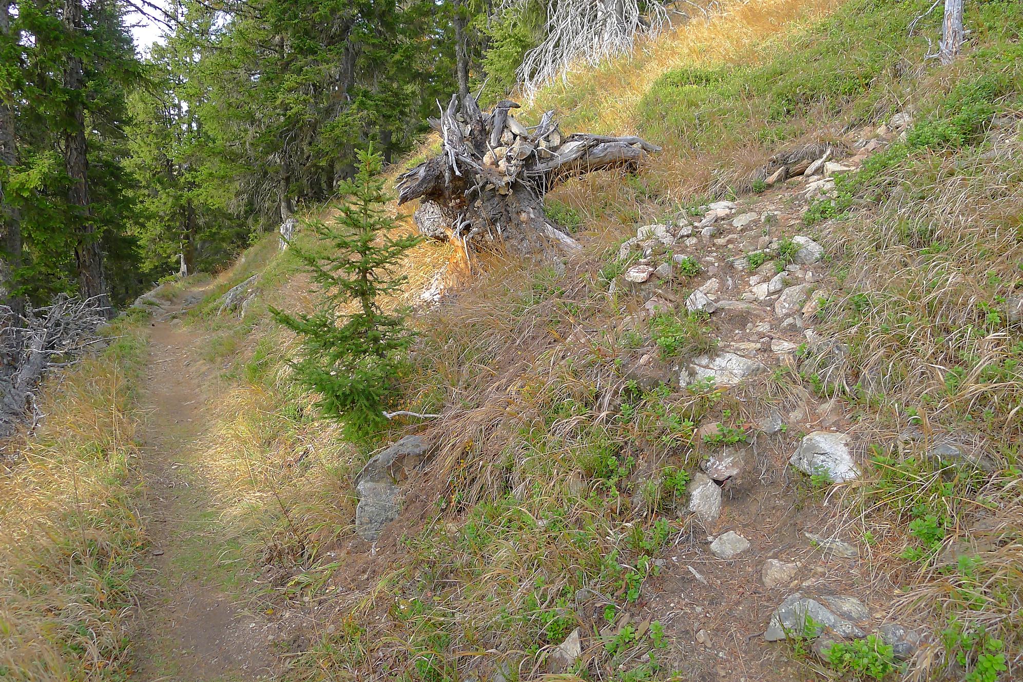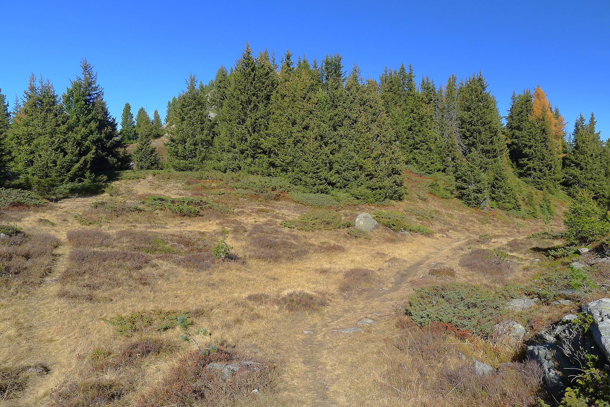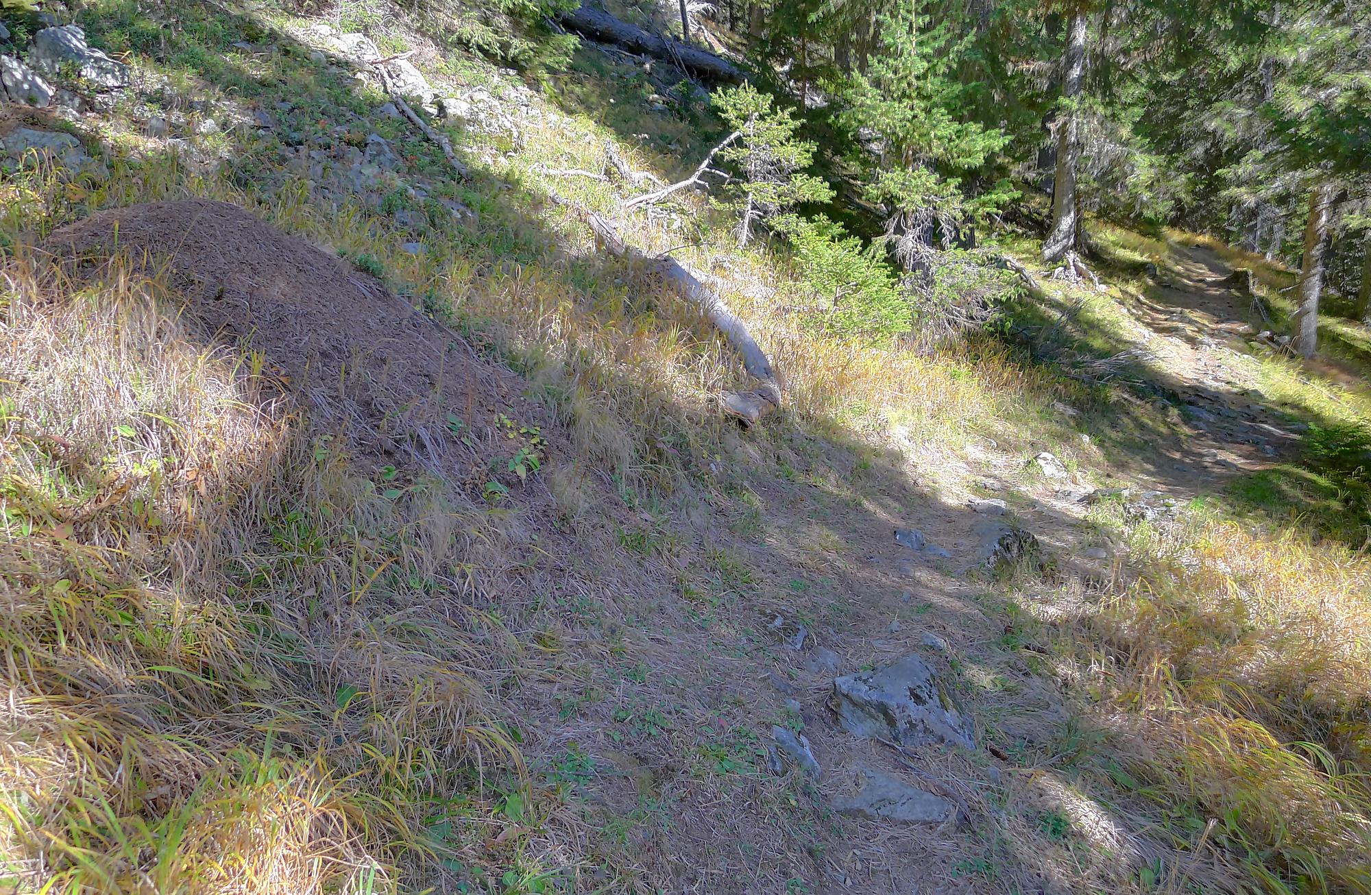 Puis je remonte, par un sentier en forêt, il y a bien des fourmilières dans la région. Au Pt1968, il est possible de descendre directement au Col de la Forclaz, mais il me restait du temps et je suis parti par le sentier de Plan de Gy. En sortant de la forêt, ce fut un de mes secteur préféré de cette balade. Il y a quelques gouilles sur notre passage. Puis je rejoins la crête et peu après je retrouve le Mont de l’Arpille. Le ciel s’est voilé d’altostratus, et il est fait mon chaud. Je poursuis ensuite par la crête, le sentier est doux et joli. J’arrive à un chalet qui est donc le reste (transformé) de l’arrivée du télésiège. Puis le chemin bifurque à l’O. Il y a un raccourci vers 2020m et écoutant mon instinct je l’ai suivi. Certes c’est pentu, mais comme c’est un raccourci, c’est court ! Je retrouve le chemin sous le Pt1968 et le descends. D’abord agréable, puis vers 1900m, il devient pentu et tout en zigzags. Un homme me rattrape et nous finirons ensemble la balade. Il restait à rejoindre le Col de la Forclaz, dont on entend assez vite les voitures filant à vive allure (eh oui le Valais !). Chose surprenant, il n’y a pas de passages piétons.