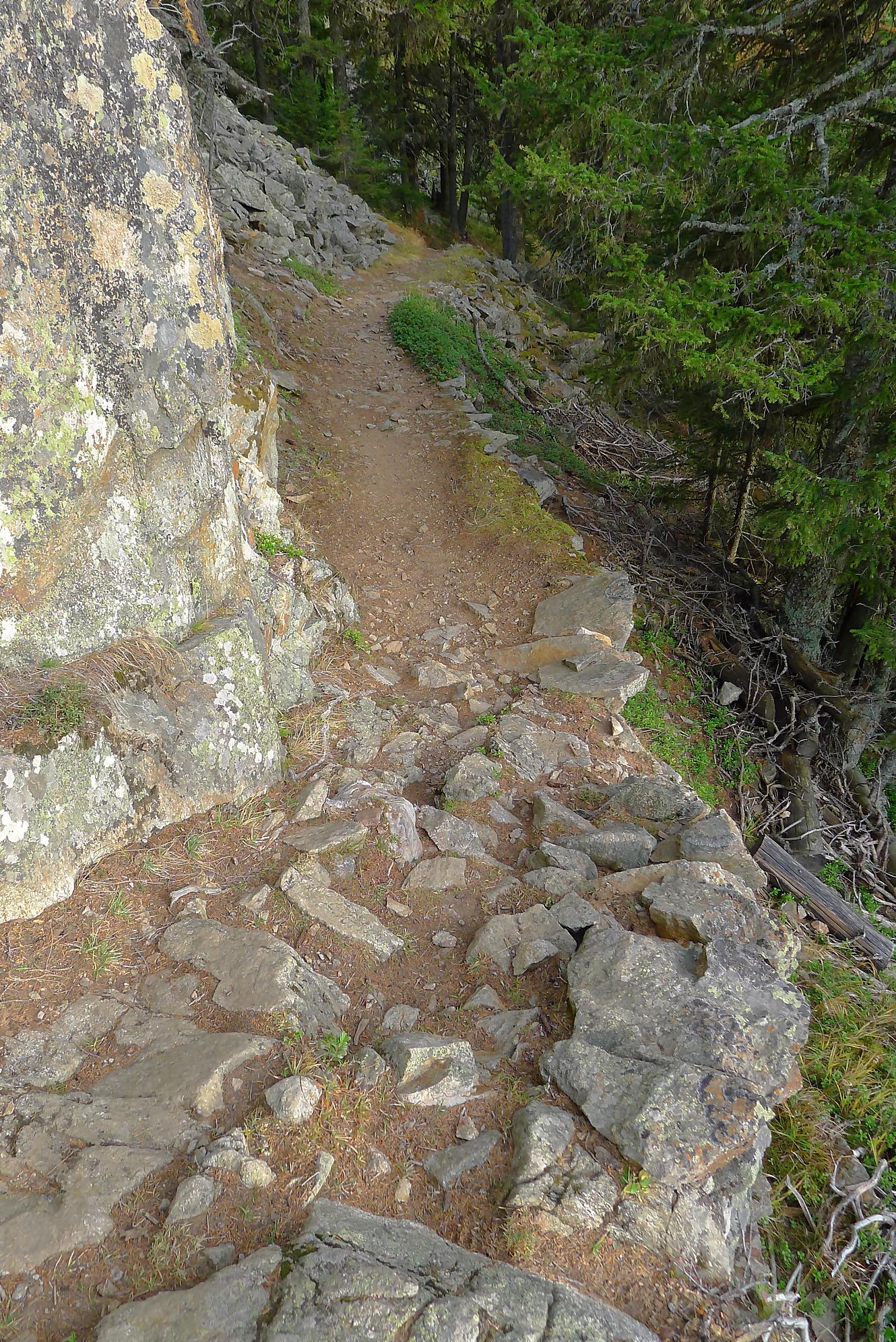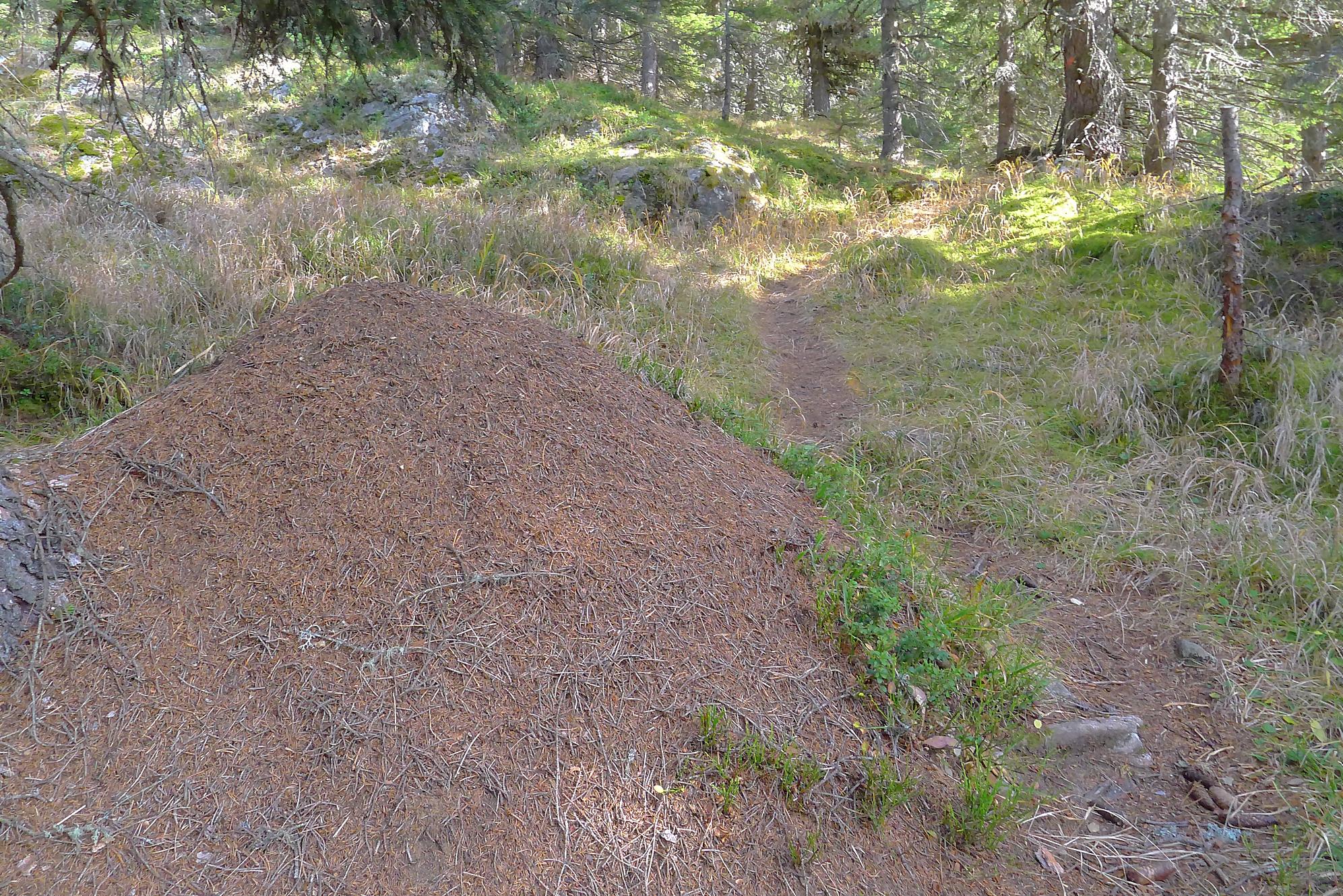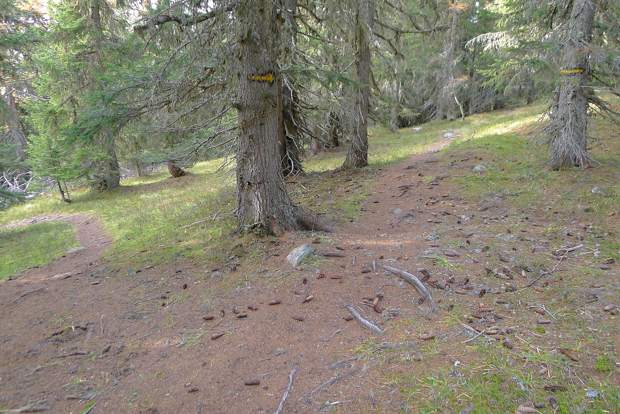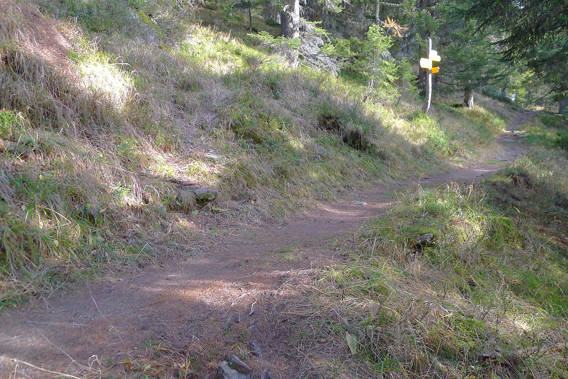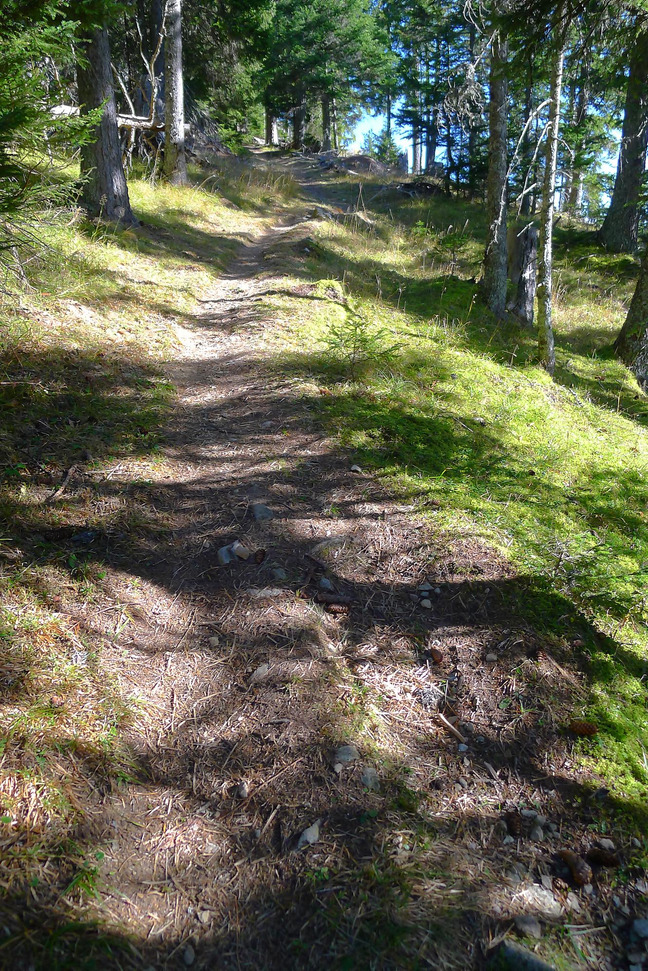 Puis je remonte, par un sentier en forêt, il y a bien des fourmilières dans la région. Au Pt1968, il est possible de descendre directement au Col de la Forclaz, mais il me restait du temps et je suis parti par le sentier de Plan de Gy. En sortant de la forêt, ce fut un de mes secteur préféré de cette balade. Il y a quelques gouilles sur notre passage. Puis je rejoins la crête et peu après je retrouve le Mont de l’Arpille. Le ciel s’est voilé d’altostratus, et il est fait mon chaud. Je poursuis ensuite par la crête, le sentier est doux et joli. J’arrive à un chalet qui est donc le reste (transformé) de l’arrivée du télésiège. Puis le chemin bifurque à l’O. Il y a un raccourci vers 2020m et écoutant mon instinct je l’ai suivi. Certes c’est pentu, mais comme c’est un raccourci, c’est court ! Je retrouve le chemin sous le Pt1968 et le descends. D’abord agréable, puis vers 1900m, il devient pentu et tout en zigzags. Un homme me rattrape et nous finirons ensemble la balade. Il restait à rejoindre le Col de la Forclaz, dont on entend assez vite les voitures filant à vive allure (eh oui le Valais !). Chose surprenant, il n’y a pas de passages piétons.