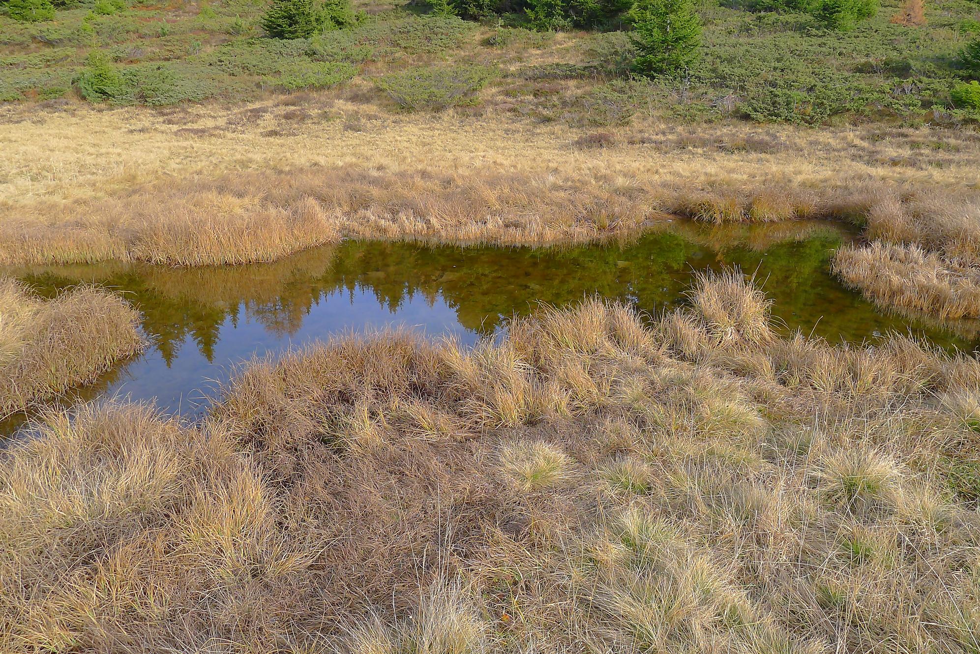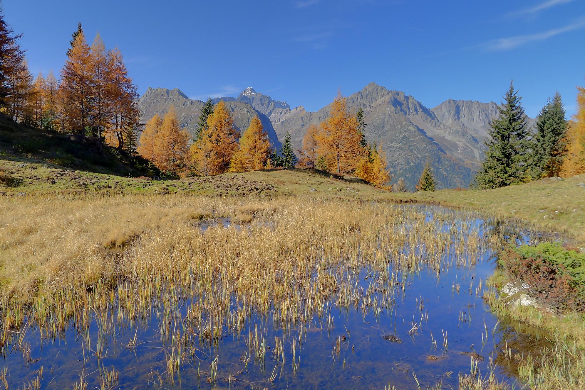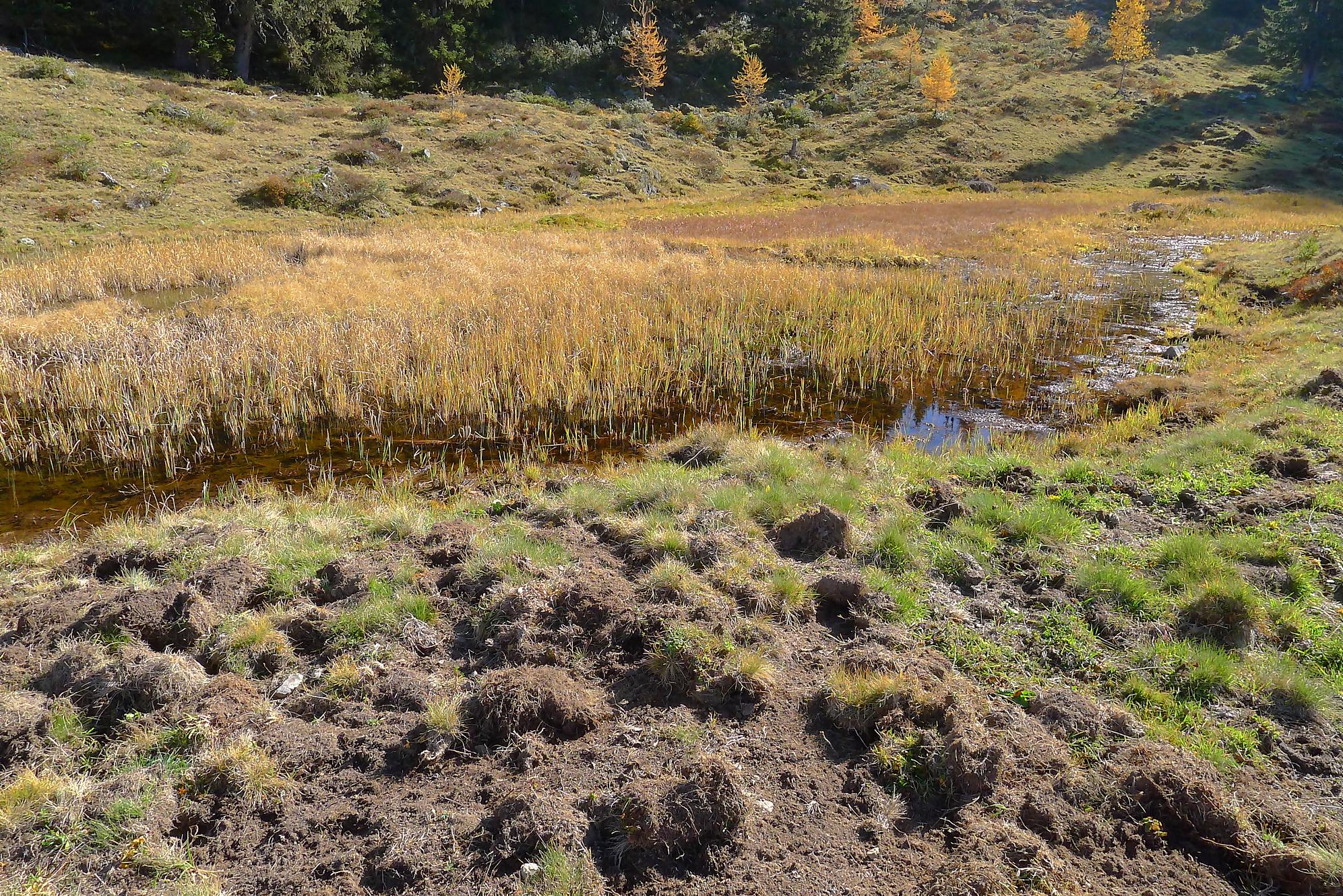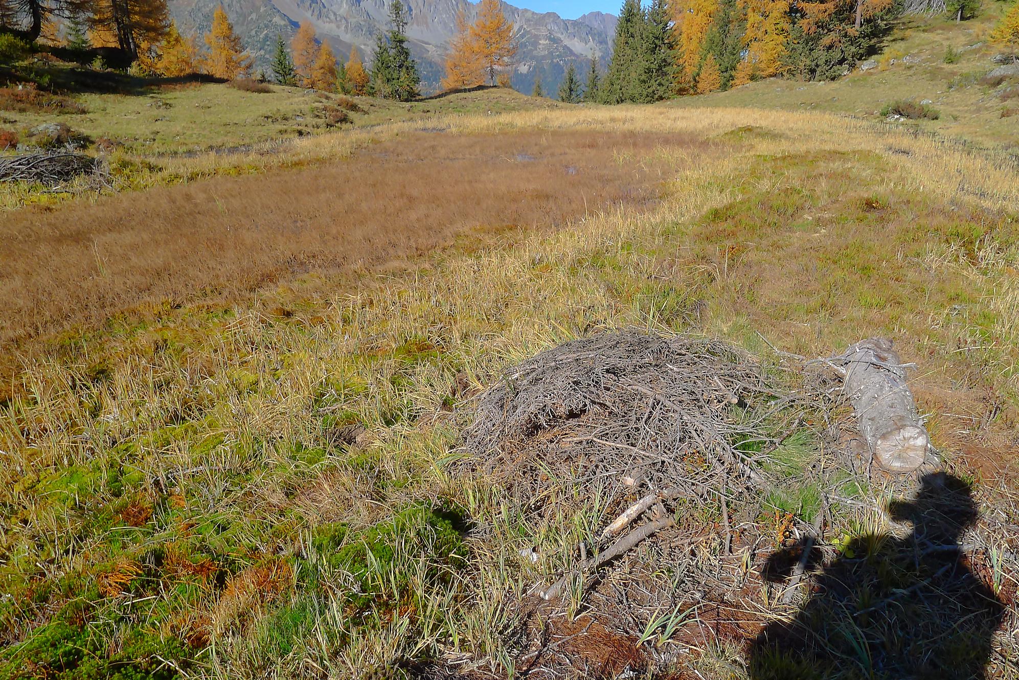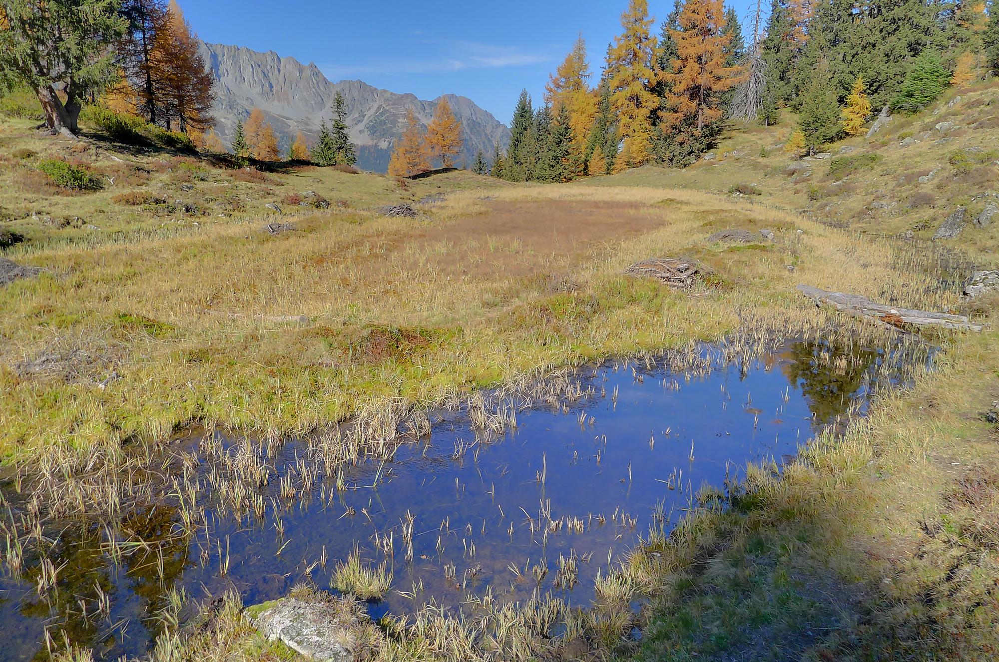 Il y a plusieurs marais entre 1760m et 1905m. Les glaciers ont creusé des dépressions dans le gneiss (roche métamorphique, résultat de la transformation du granit) qui constitue le massif du Mont de l’Arpille. Les glaciers fondus, il reste des petits lacs qui se sont peu à peu comblé par des sédiments et par la tourbe (décomposition incomplète de végétaux). Il y a des bas-marais et haut-marais (plus d’épaisseur de tourbe). Au niveau des animaux, il est possible de voir la grenouille rousse, le triton alpeste, le lézard vivipare et sept espèces de libellules. Je n’ai rien vu de ce petit monde, trop tard en saison. Un chemin descend jusqu’à La Preise, pour la dernière zone marécageuse, je n’y suis pas allé, cela me forcera à revenir à la belle saison voir ces belles zones marécageuses.