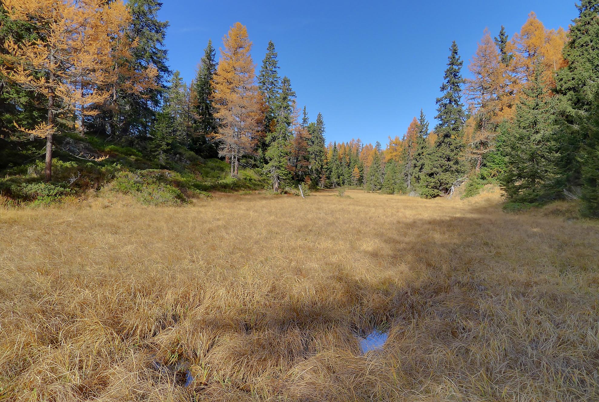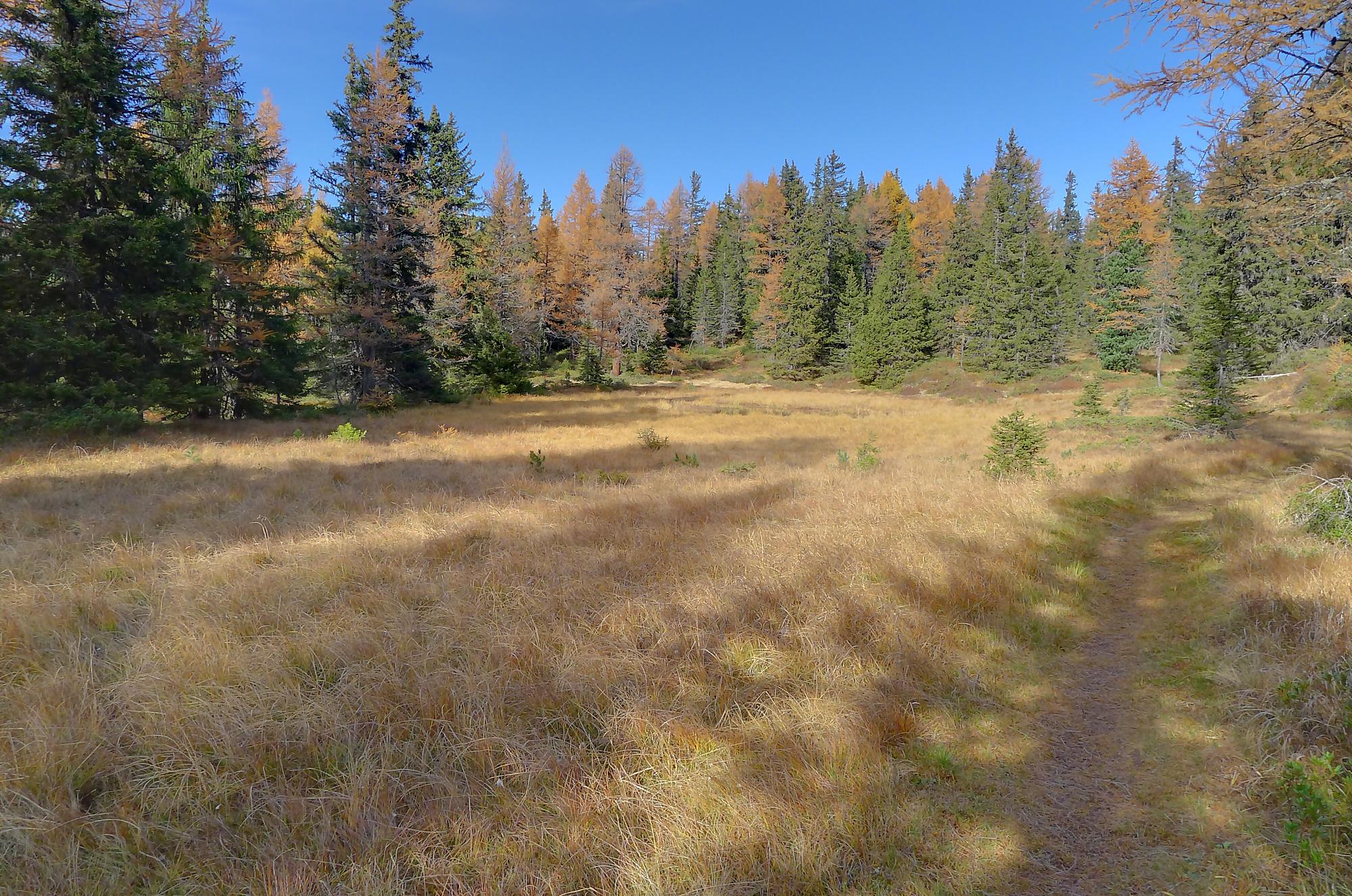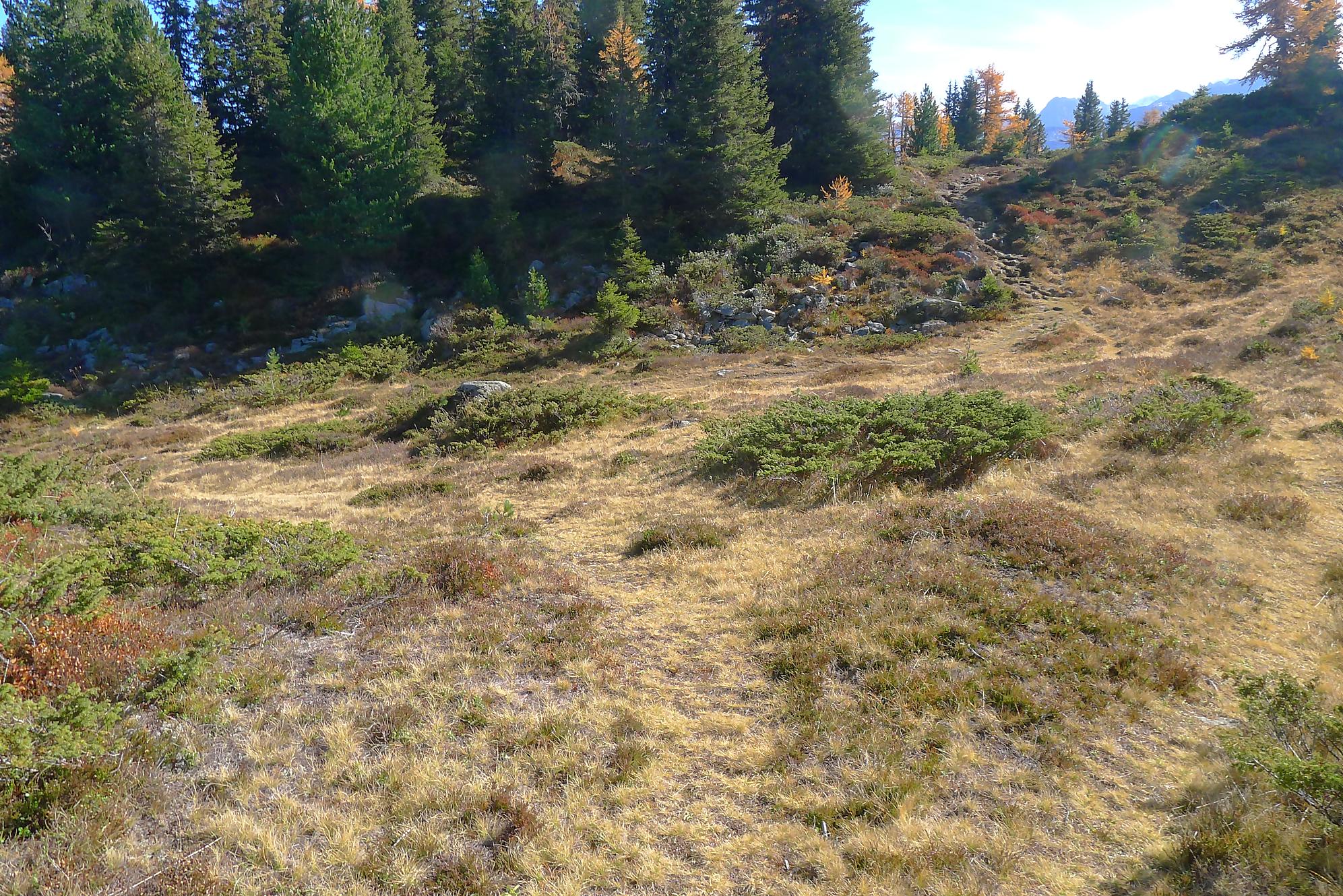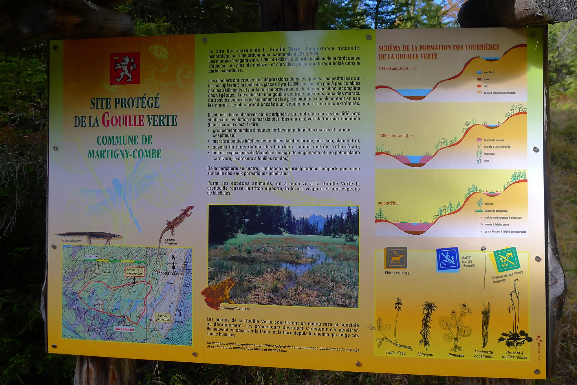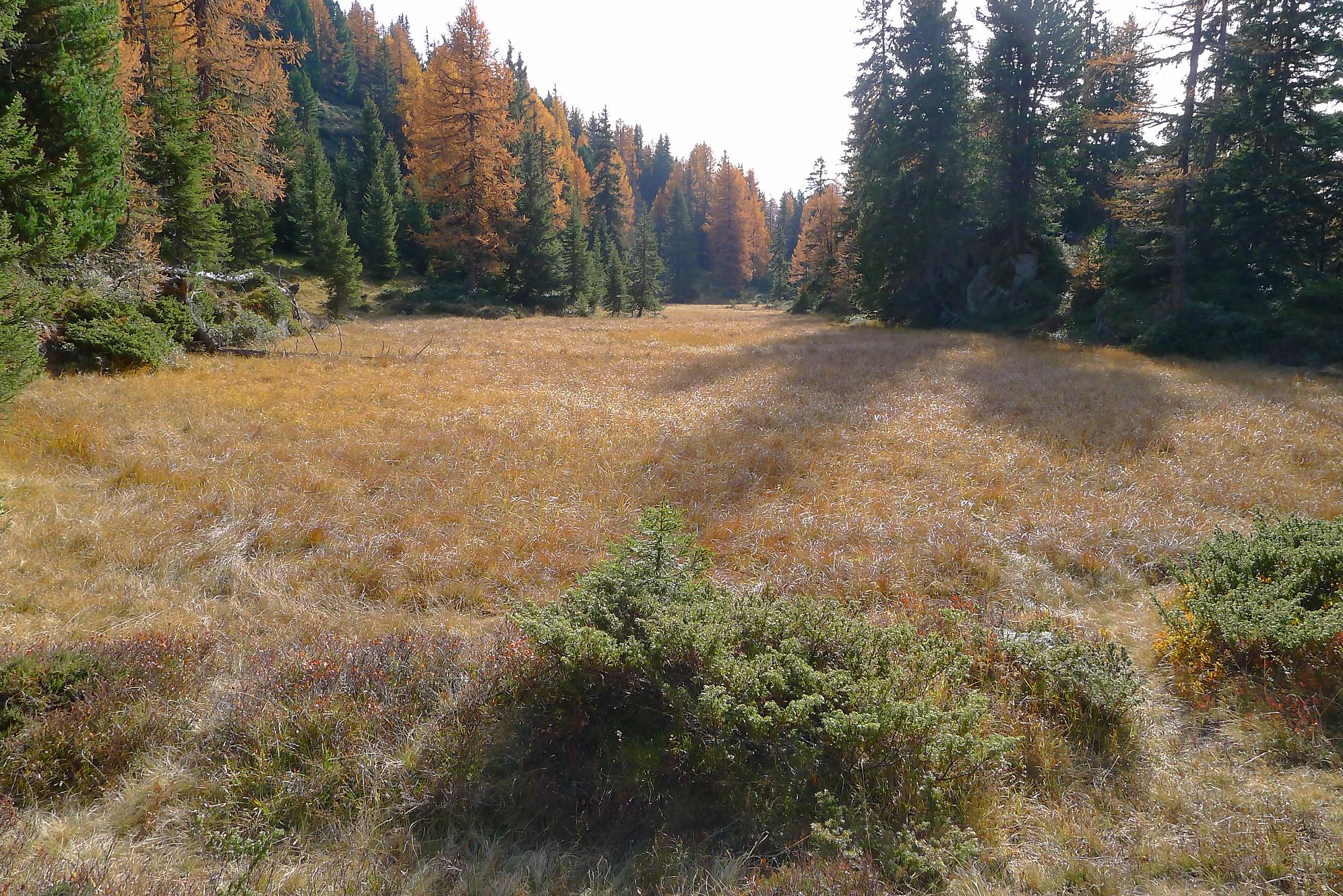 Il y a plusieurs marais entre 1760m et 1905m. Les glaciers ont creusé des dépressions dans le gneiss (roche métamorphique, résultat de la transformation du granit) qui constitue le massif du Mont de l’Arpille. Les glaciers fondus, il reste des petits lacs qui se sont peu à peu comblé par des sédiments et par la tourbe (décomposition incomplète de végétaux). Il y a des bas-marais et haut-marais (plus d’épaisseur de tourbe). Au niveau des animaux, il est possible de voir la grenouille rousse, le triton alpeste, le lézard vivipare et sept espèces de libellules. Je n’ai rien vu de ce petit monde, trop tard en saison. Un chemin descend jusqu’à La Preise, pour la dernière zone marécageuse, je n’y suis pas allé, cela me forcera à revenir à la belle saison voir ces belles zones marécageuses.