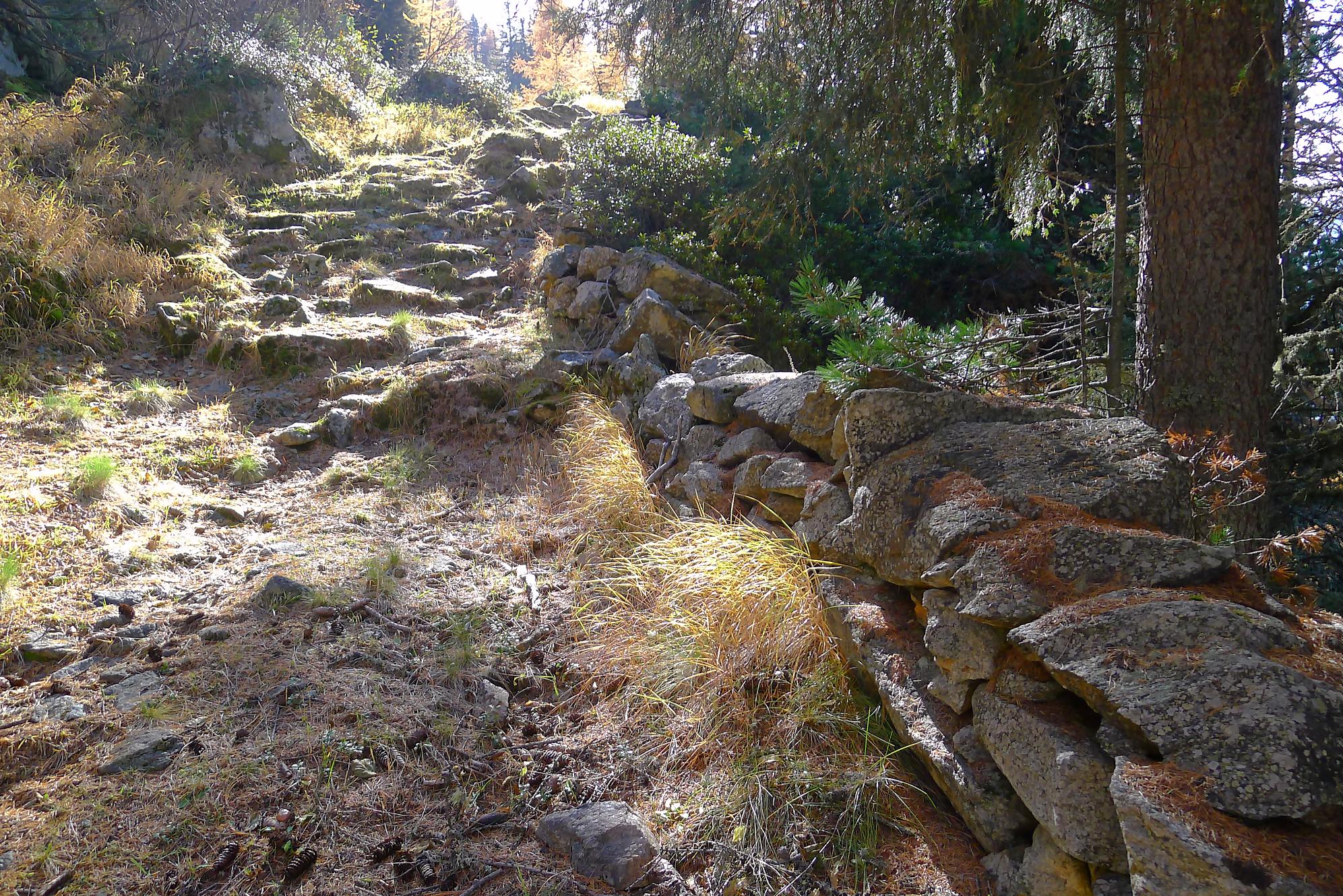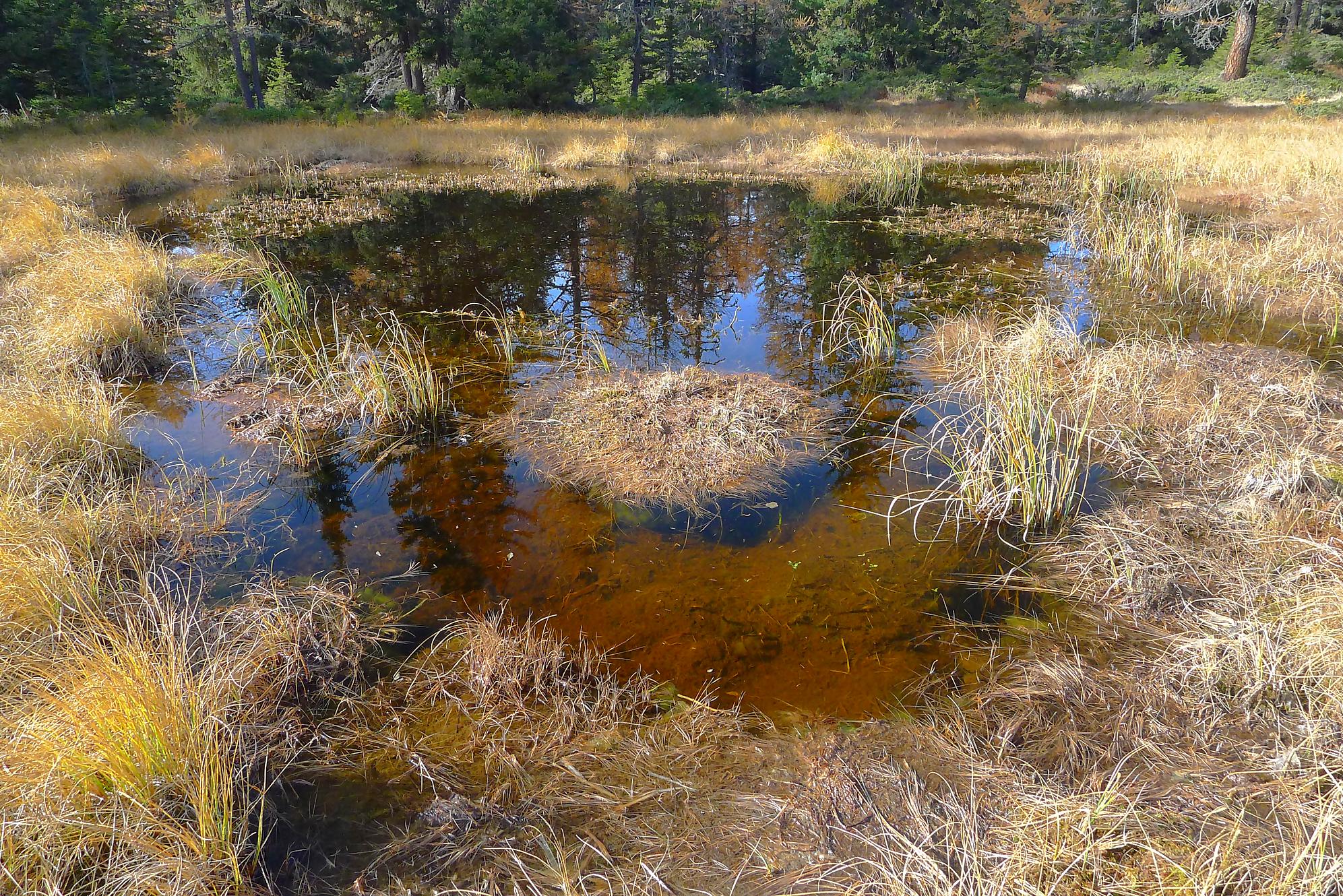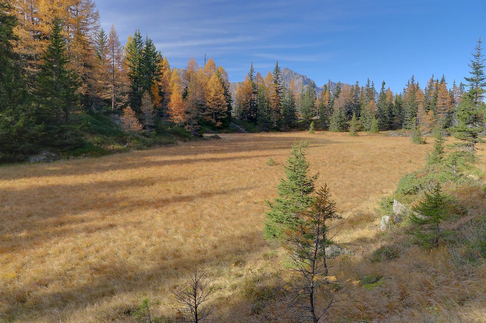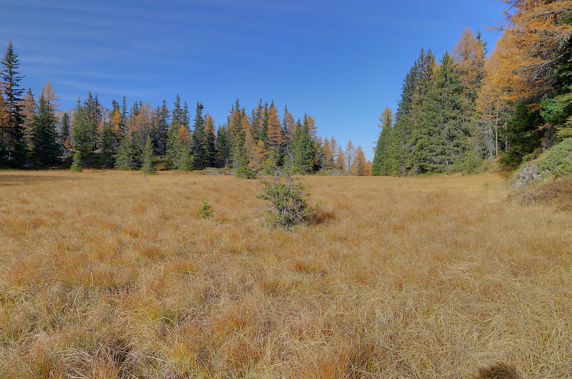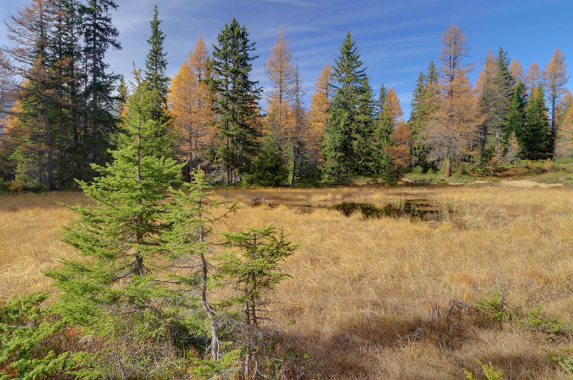 Il y a plusieurs marais entre 1760m et 1905m. Les glaciers ont creusé des dépressions dans le gneiss (roche métamorphique, résultat de la transformation du granit) qui constitue le massif du Mont de l’Arpille. Les glaciers fondus, il reste des petits lacs qui se sont peu à peu comblé par des sédiments et par la tourbe (décomposition incomplète de végétaux). Il y a des bas-marais et haut-marais (plus d’épaisseur de tourbe). Au niveau des animaux, il est possible de voir la grenouille rousse, le triton alpeste, le lézard vivipare et sept espèces de libellules. Je n’ai rien vu de ce petit monde, trop tard en saison. Un chemin descend jusqu’à La Preise, pour la dernière zone marécageuse, je n’y suis pas allé, cela me forcera à revenir à la belle saison voir ces belles zones marécageuses.