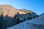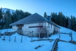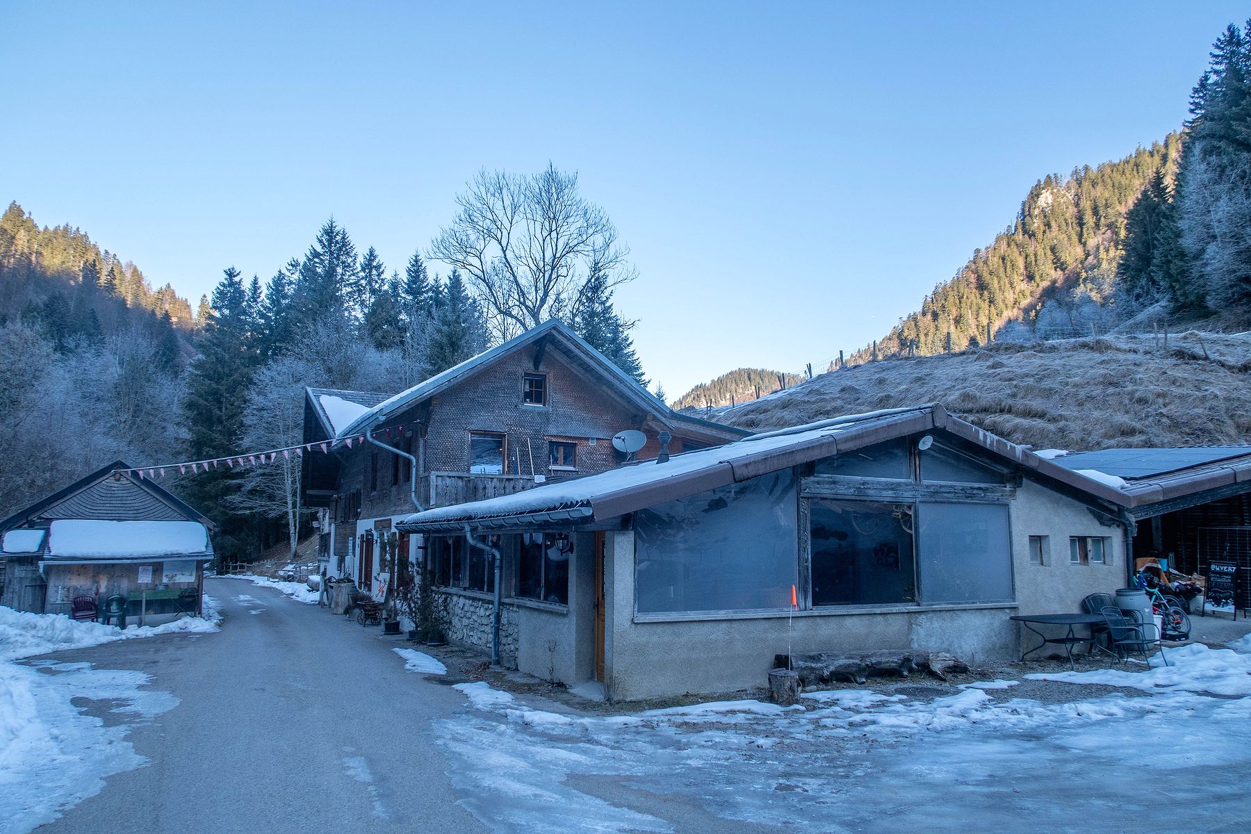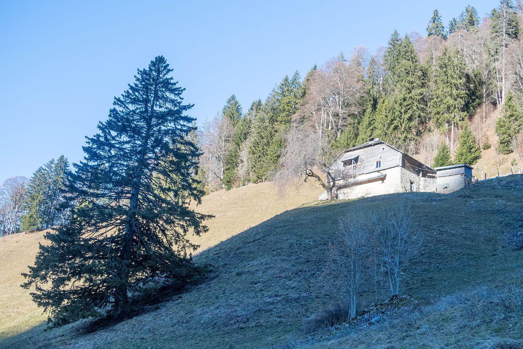De là, il faut emprunter un sentier en devers. Il y a de la neige et des traces de cerf. Puis le sentier remonte en forêt avec une section pentue. J’en sors et me retrouve en bas du pâturage enneigé de Petit Haut Crêt. Je passe cette ferme.