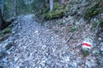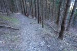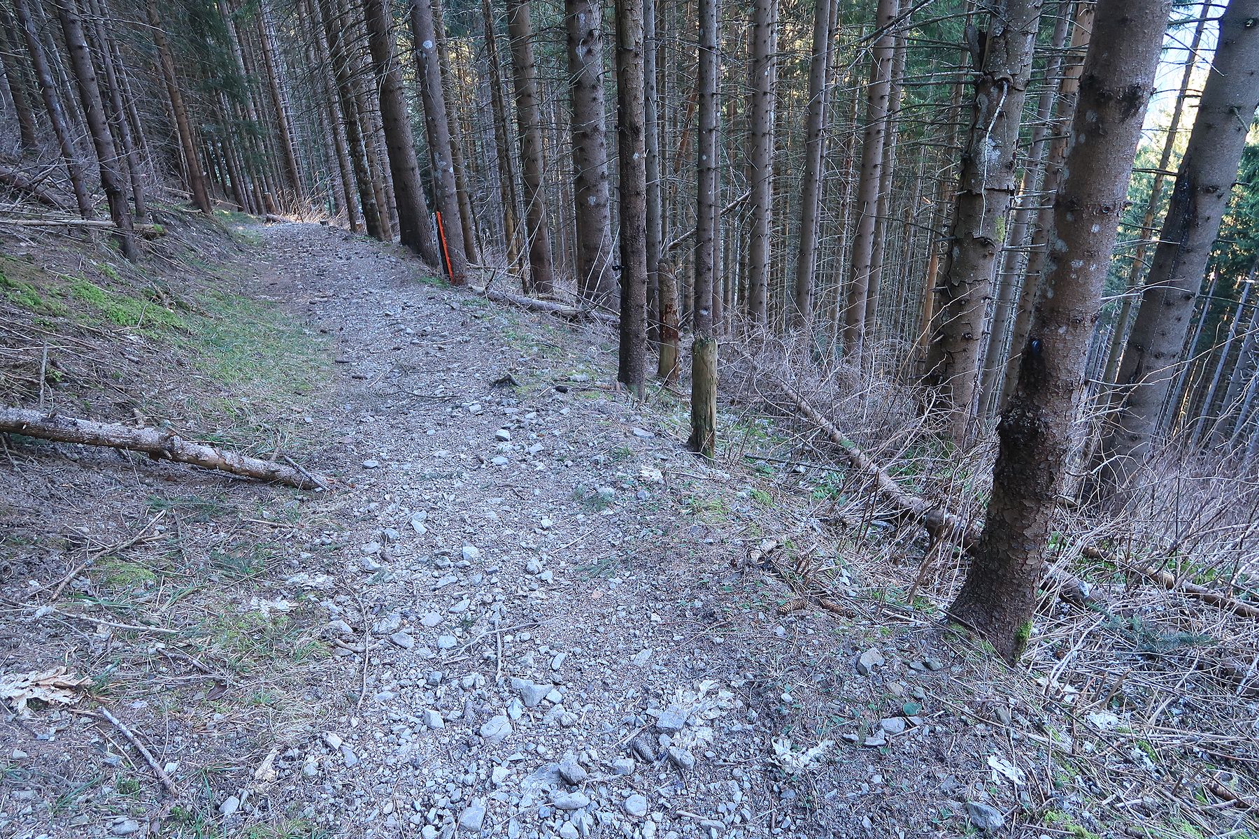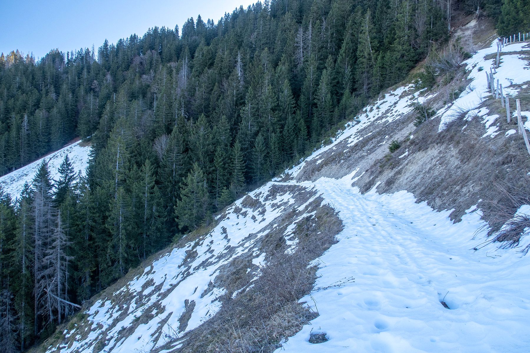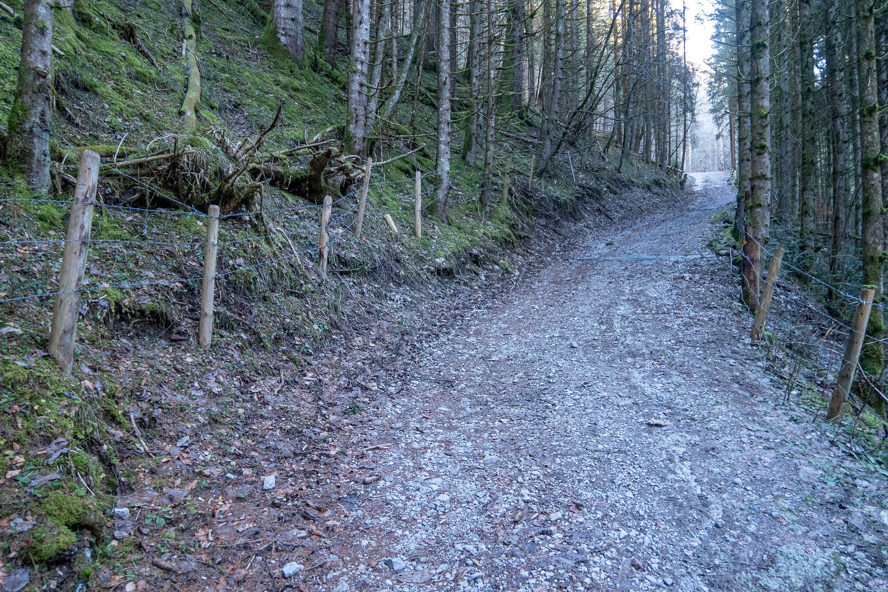 Je remonte le pâturage qui devient plus étroit vers le haut. La vue est en partie bouchée par les épicéas. Une petite descente, un portail et je rentre en forêt. Là, je décide de couper court et monter sur la gauche. C’est raide. J’arrive devant des barbelés et passe dessous.