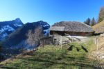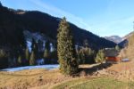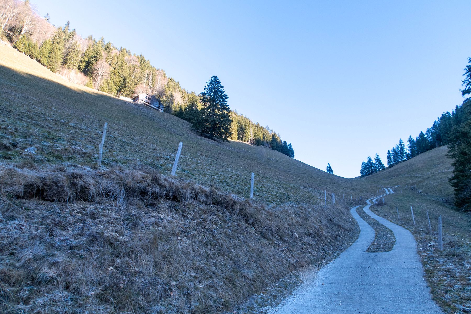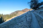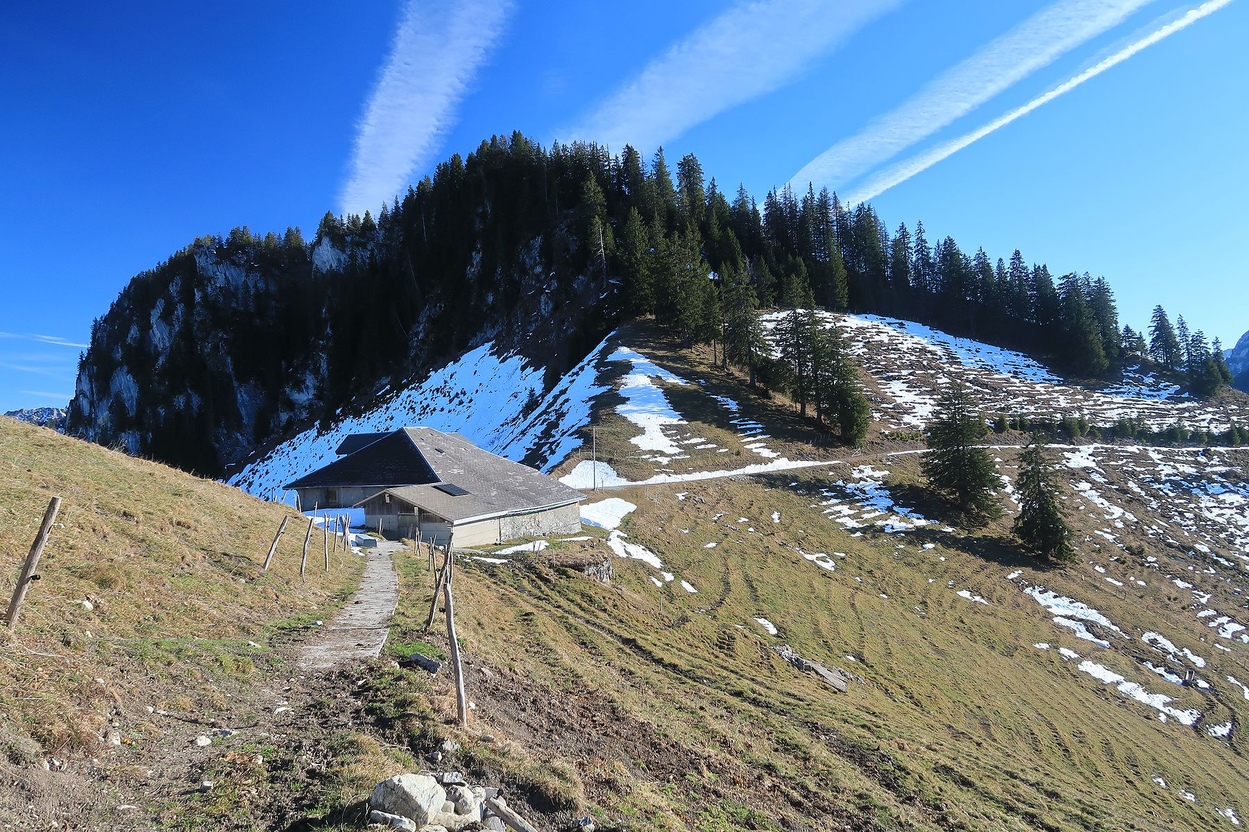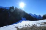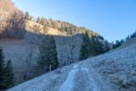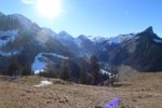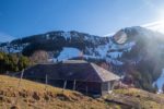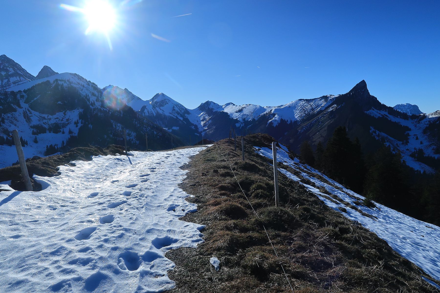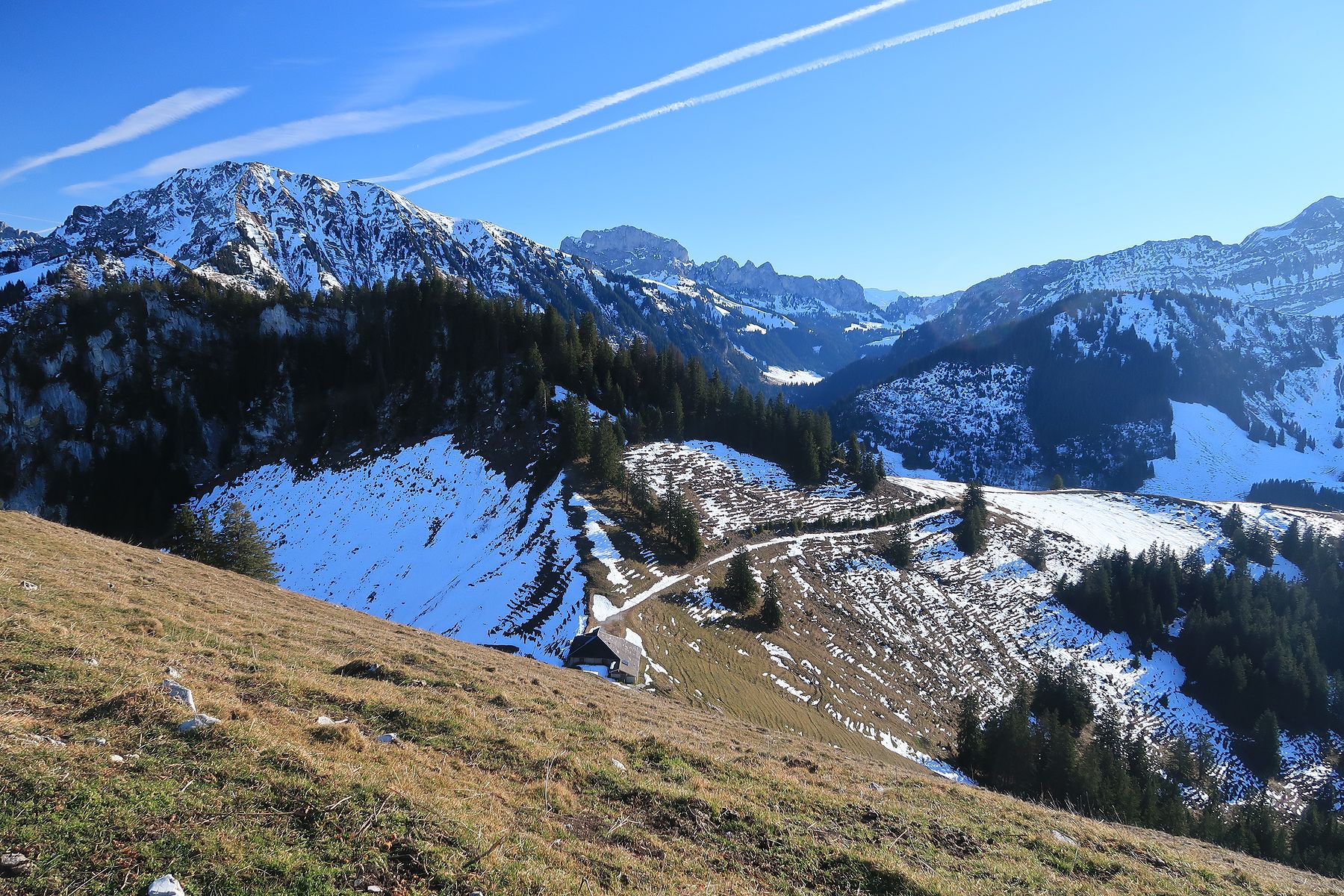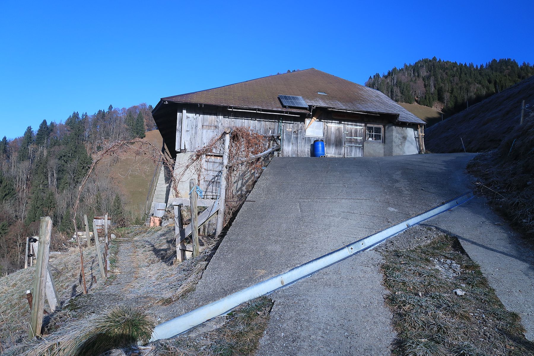 La vue s’ouvre sur le secteur de Charmey. Joli. À présent, il y a de la neige. Je monte au mieux et arrive devant la ferme de Paquier à Chollet.