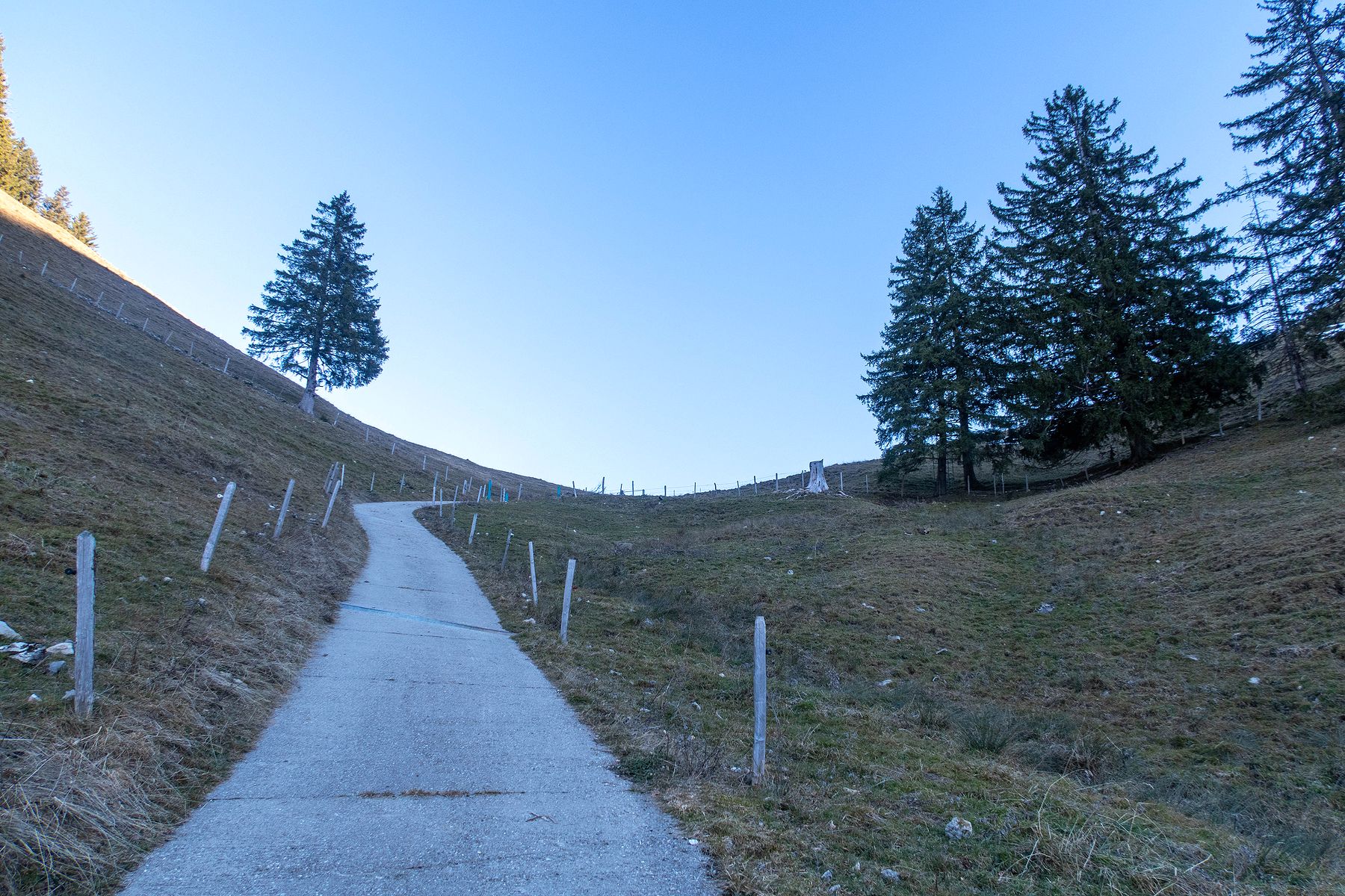 Je poursuis dans le pâturage, toujours à vue et je finis par rejoindre une route d’alpage. Je la remonte pour accéder à un col.