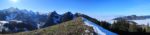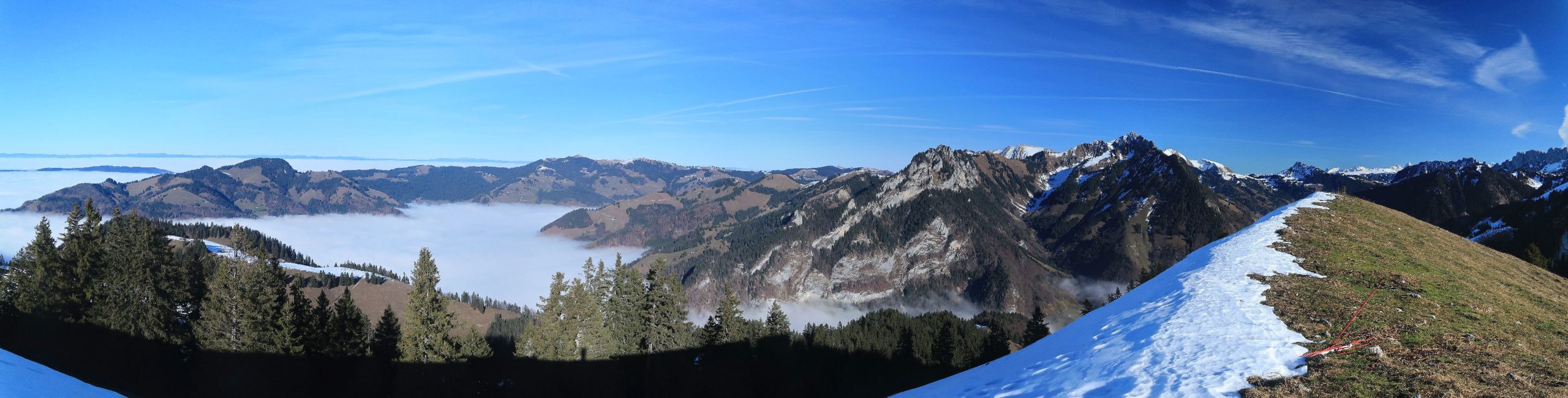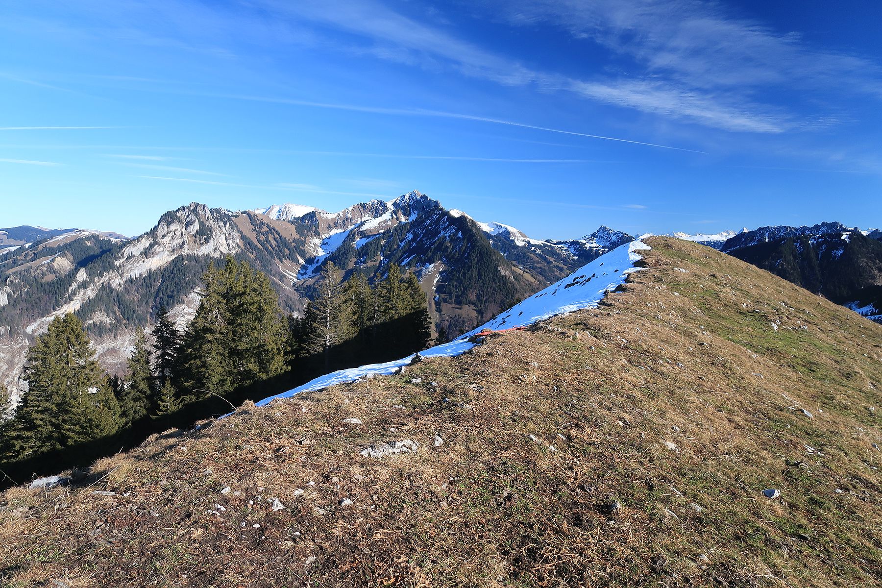 Je débouche dans le pâturage de Haut Crêt. Je monte au mieux, rejoins une croupe puis la crête (confortable) finale. La vue s’ouvre tout grand sur les Préalpes et au loin les Alpes bernoises. C’est superbe. Je fais ma pause picnic ici.