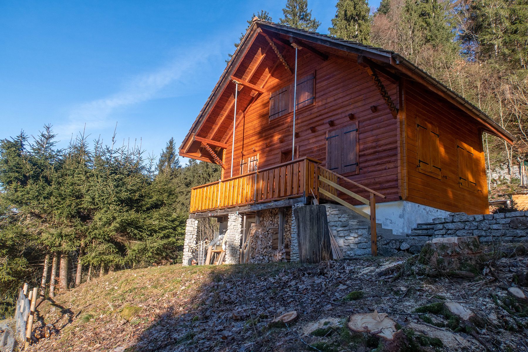 Retour en forêt, le sentier est pentu au début. Je sors de la forêt et passe devant un joli chalet en bois.