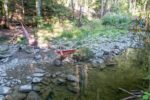 Puis, nous quittons la rivière pour suivre le sentier (qui est tout le long de la rivière, sur ce parcours) pour rejoindre le lieu du campement désiré au Fond des Corbes. Un détour vers le parking du jour permet de récupérer tout le matériel et de changer de chaussures.