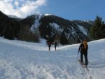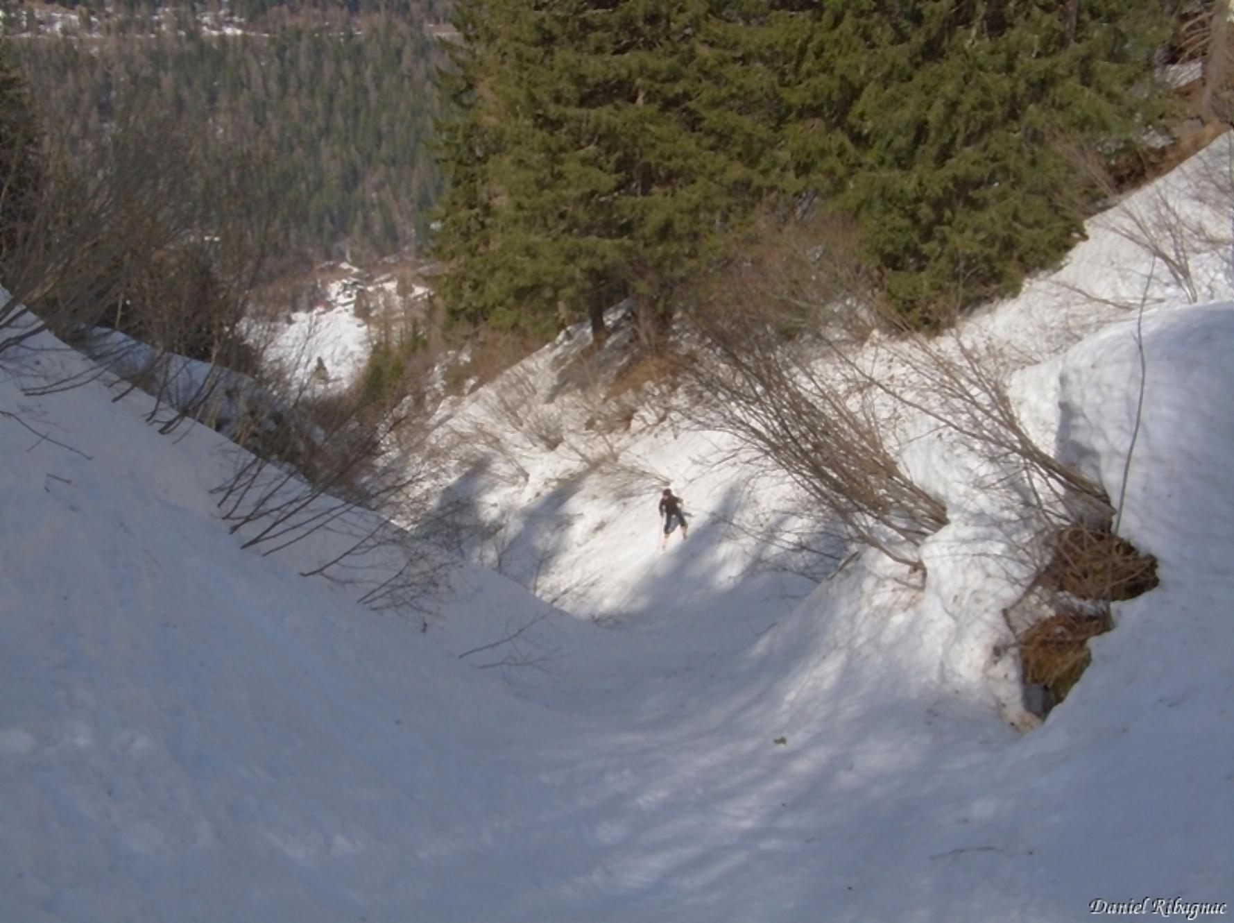 Pour éviter le retour sur nos traces et son long passage en forêt, on peut passer dans le couloir en S4 vers La Veudalle. Une fois la première pente passée, c’est en pente plus tranquille que nous rejoignons les hauts de La Combe des Faces qui est plutôt un couloir. Il faut d’abord tricoter entre les aulnes pour descendre tant bien que mal ce couloir. Le bobsleigh serait plus approprié mais nous sommes en skis ! Après ce couloir, on retrouve la clairière du départ. Un arrêt au bistrot de La Caffe (dans le Valais, on apprécie les bistrots qui sont ouverts même en hiver), pour babiller avec trois skieurs rencontrés en début de course. On profite de la belle fin de journée. Un habitué me propose de me descendre jusqu’à Martigny mais je préfère attendre ici au soleil qu’à Martigny !