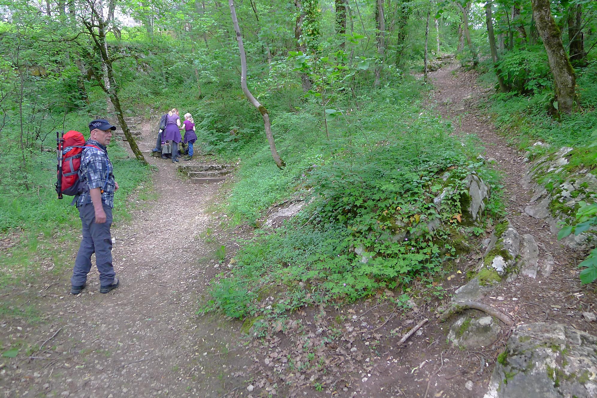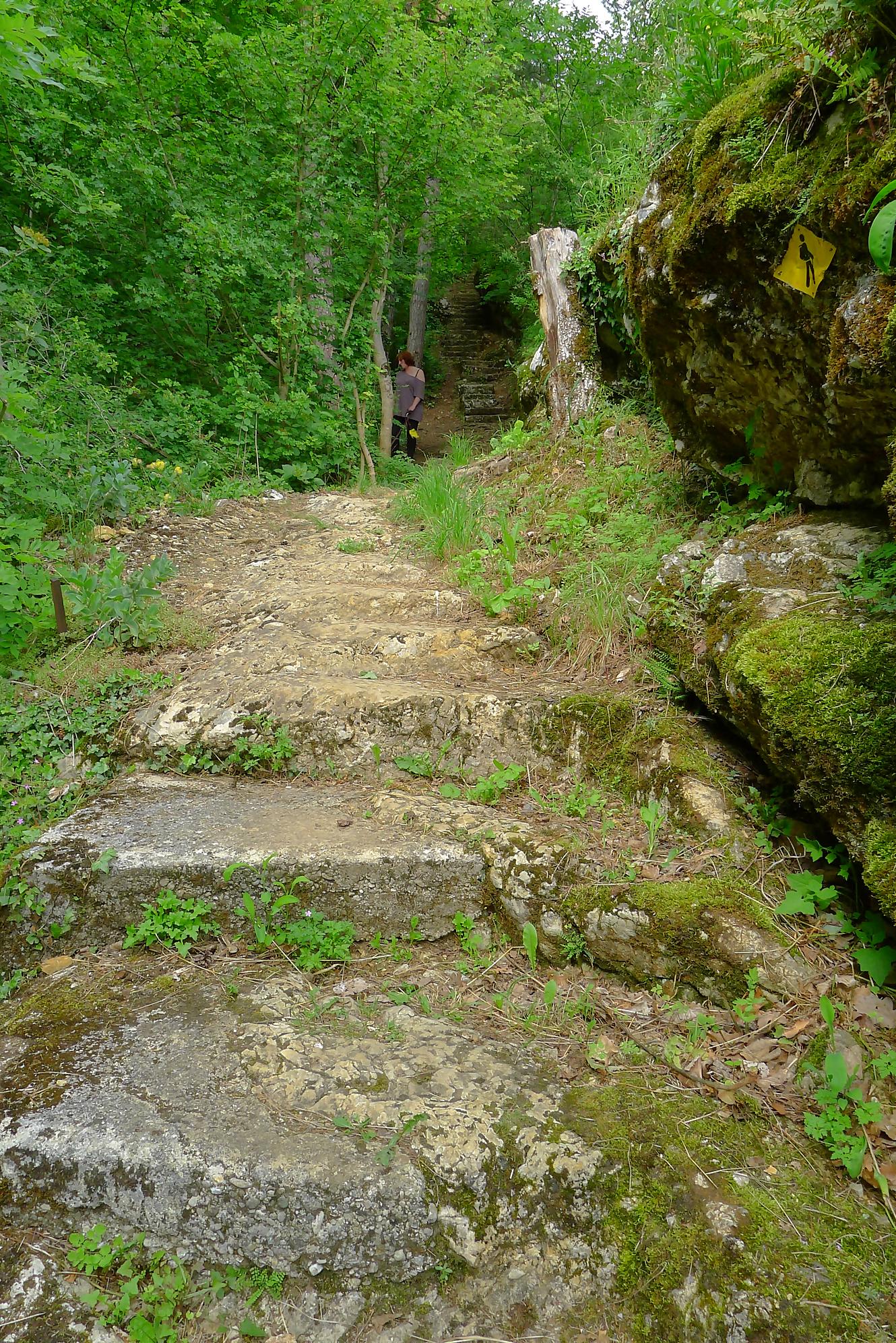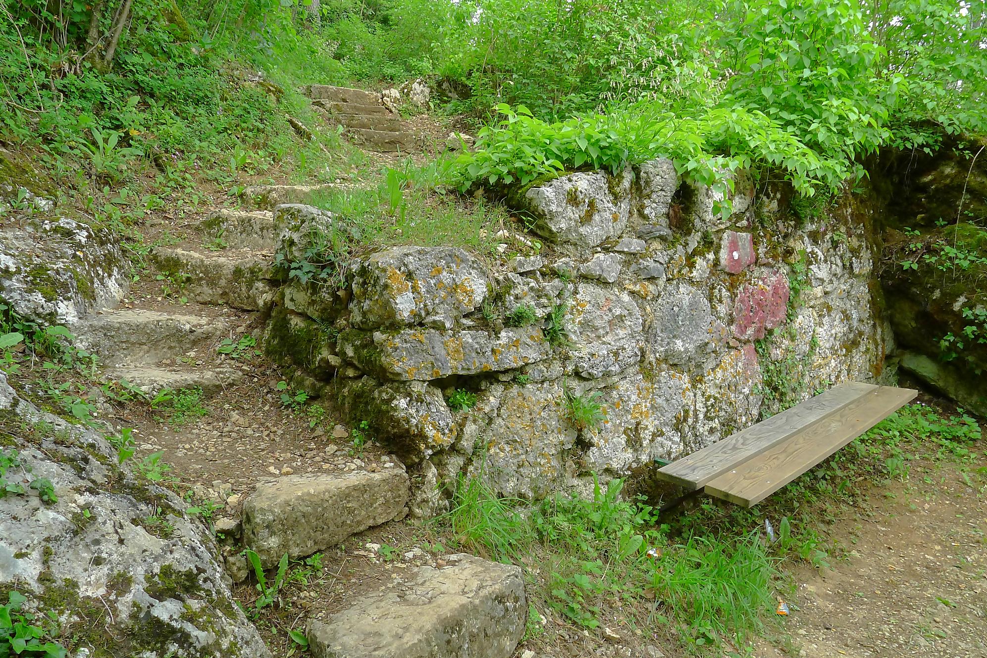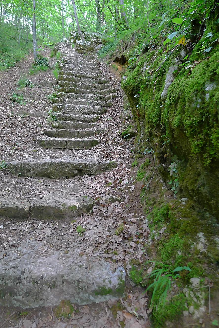 Pour nous, nous continuons. Après avoir suivi la tangente de la route, nous montons par un chemin doux à travers la forêt, dans la Combe du Pilouvi. Là le ruisseau est à sec. Vers la fin de la combe, la pente se redresse un peu et nous venons longer une falaise qui se franchit par un escalier tout neuf.