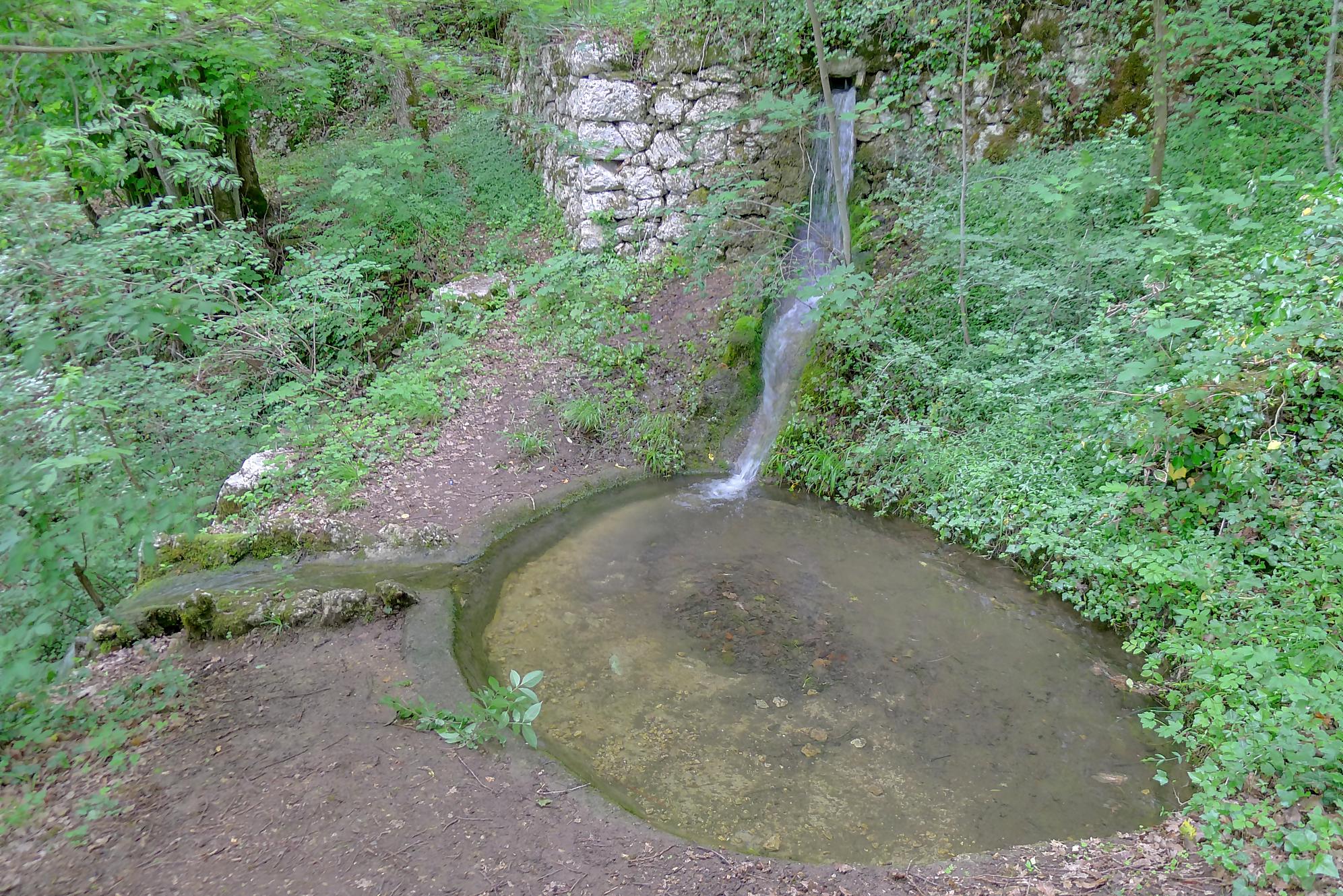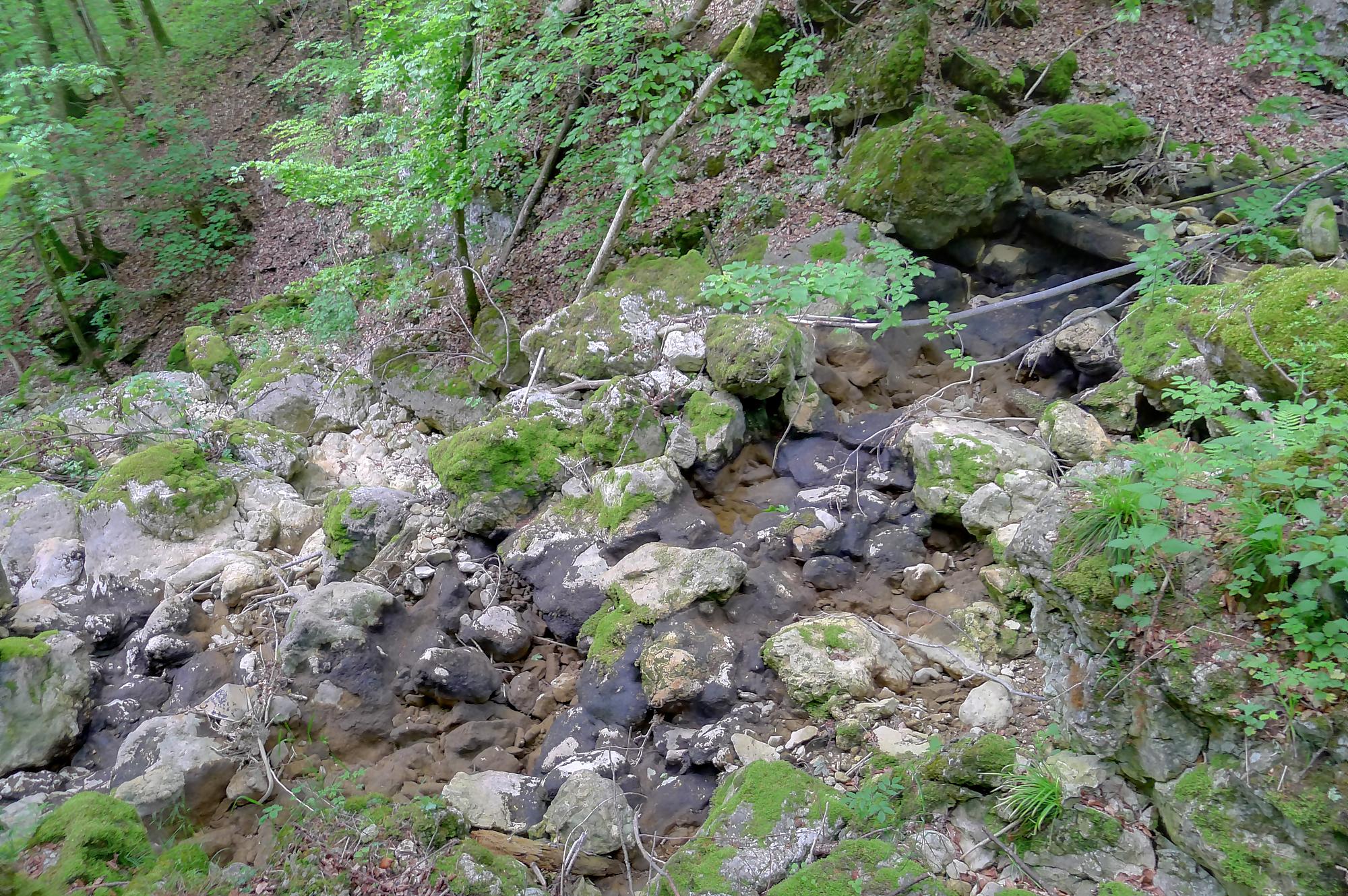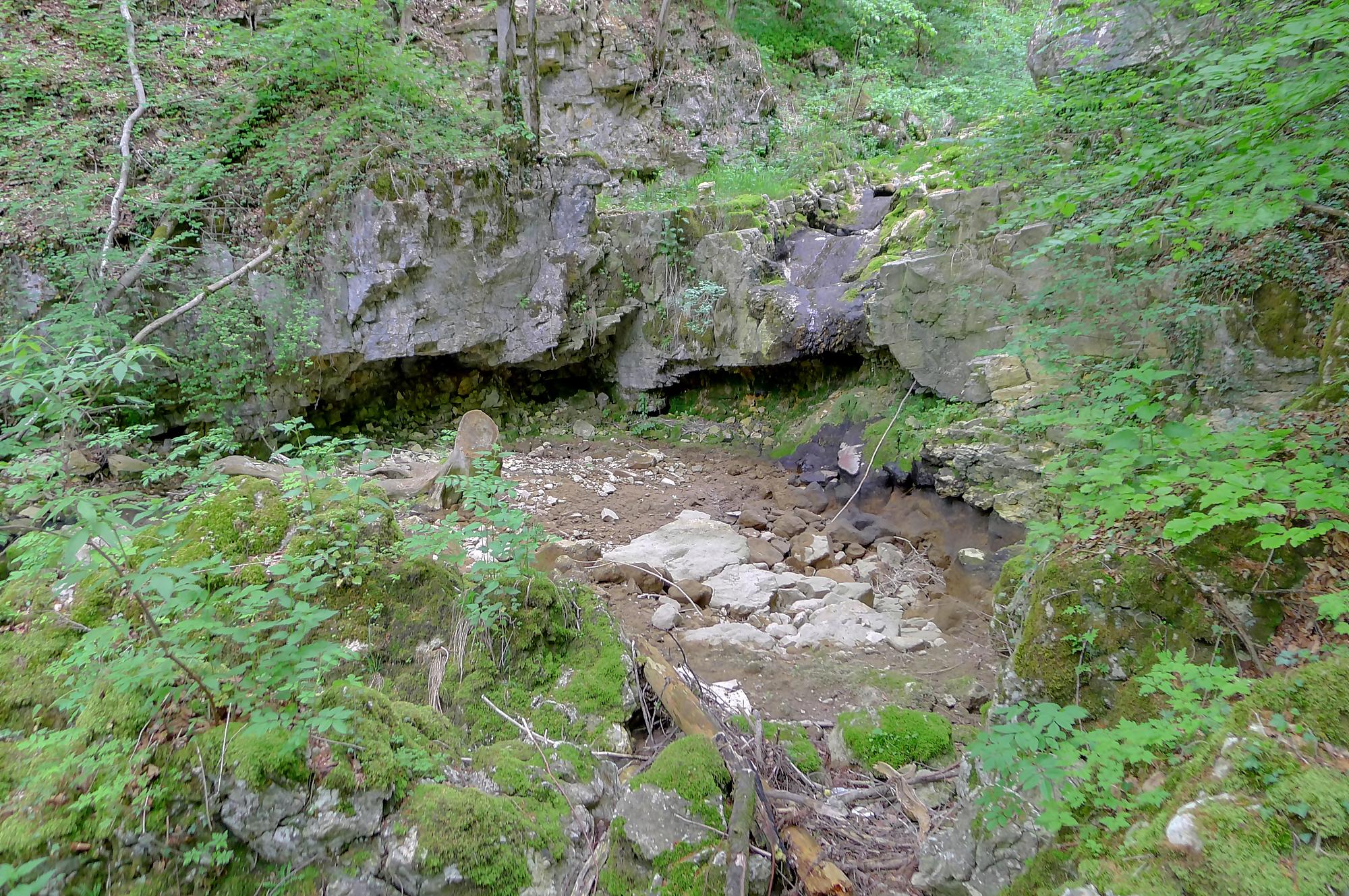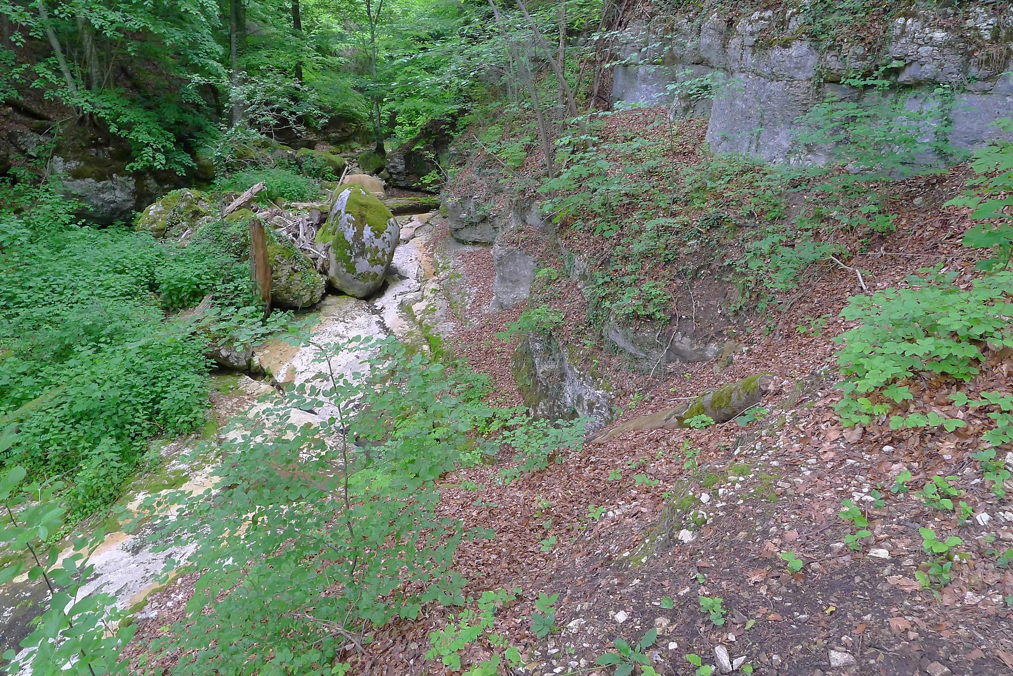 Pour nous, nous continuons. Après avoir suivi la tangente de la route, nous montons par un chemin doux à travers la forêt, dans la Combe du Pilouvi. Là le ruisseau est à sec. Vers la fin de la combe, la pente se redresse un peu et nous venons longer une falaise qui se franchit par un escalier tout neuf.