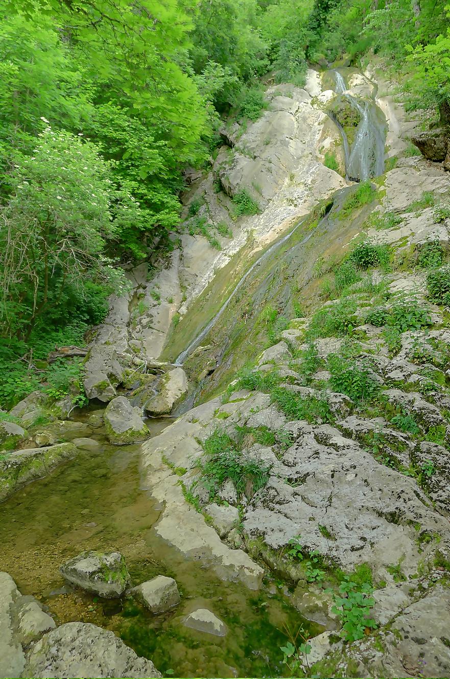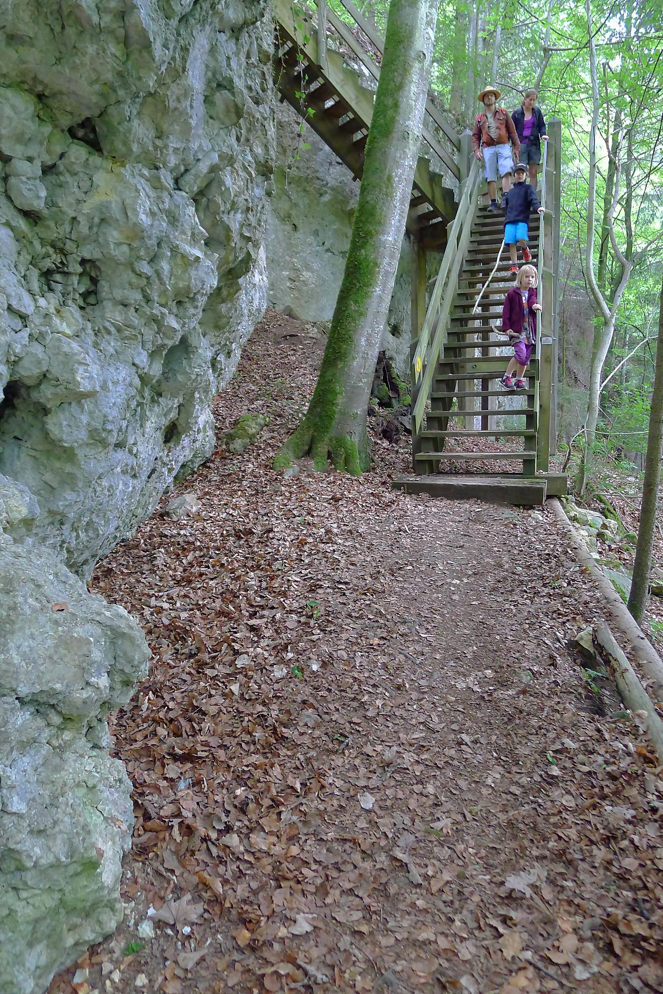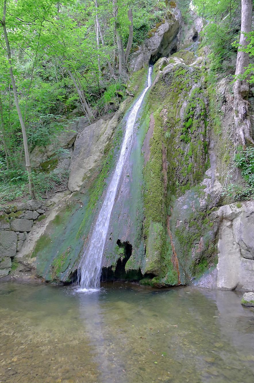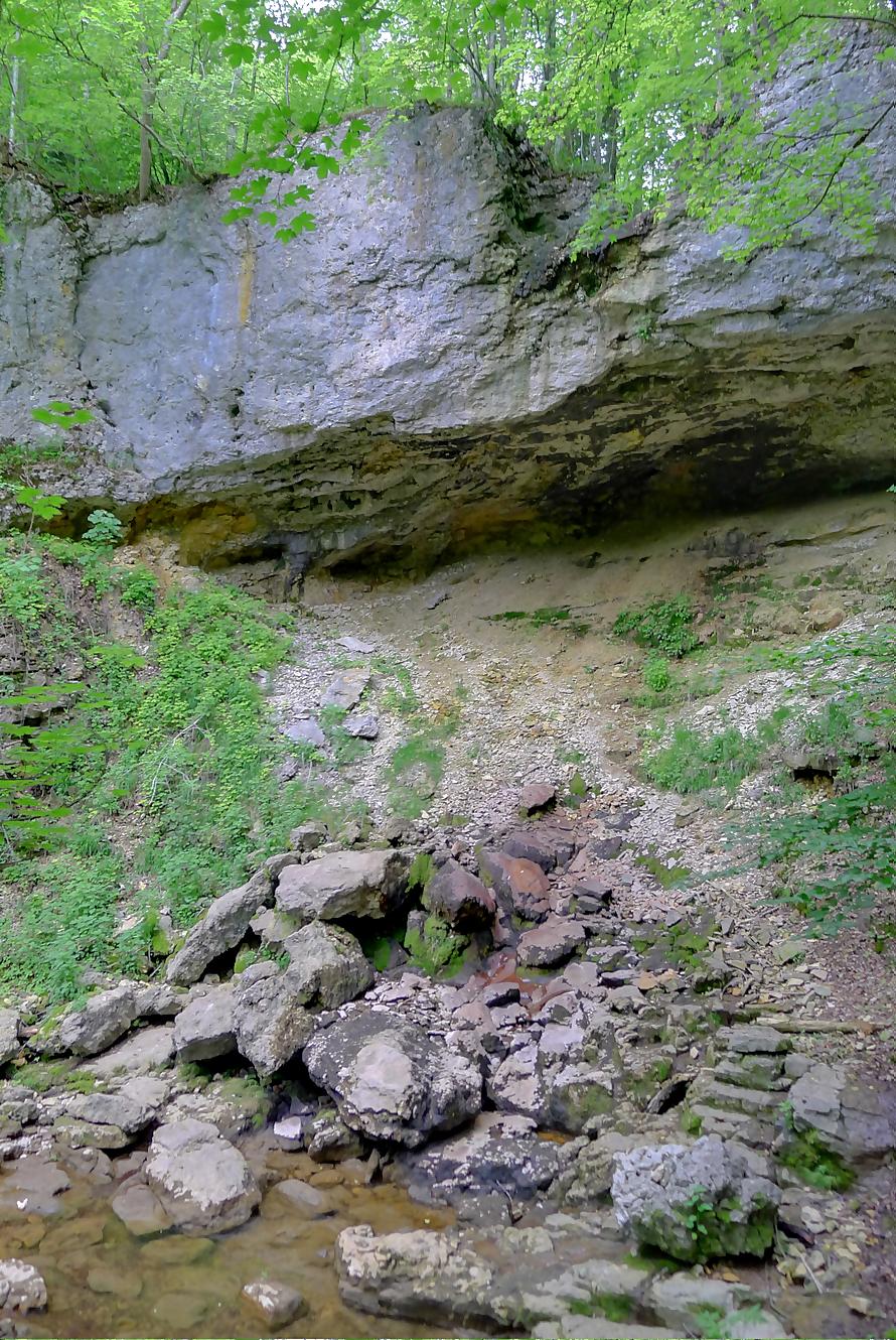 Pour nous, nous continuons. Après avoir suivi la tangente de la route, nous montons par un chemin doux à travers la forêt, dans la Combe du Pilouvi. Là le ruisseau est à sec. Vers la fin de la combe, la pente se redresse un peu et nous venons longer une falaise qui se franchit par un escalier tout neuf.