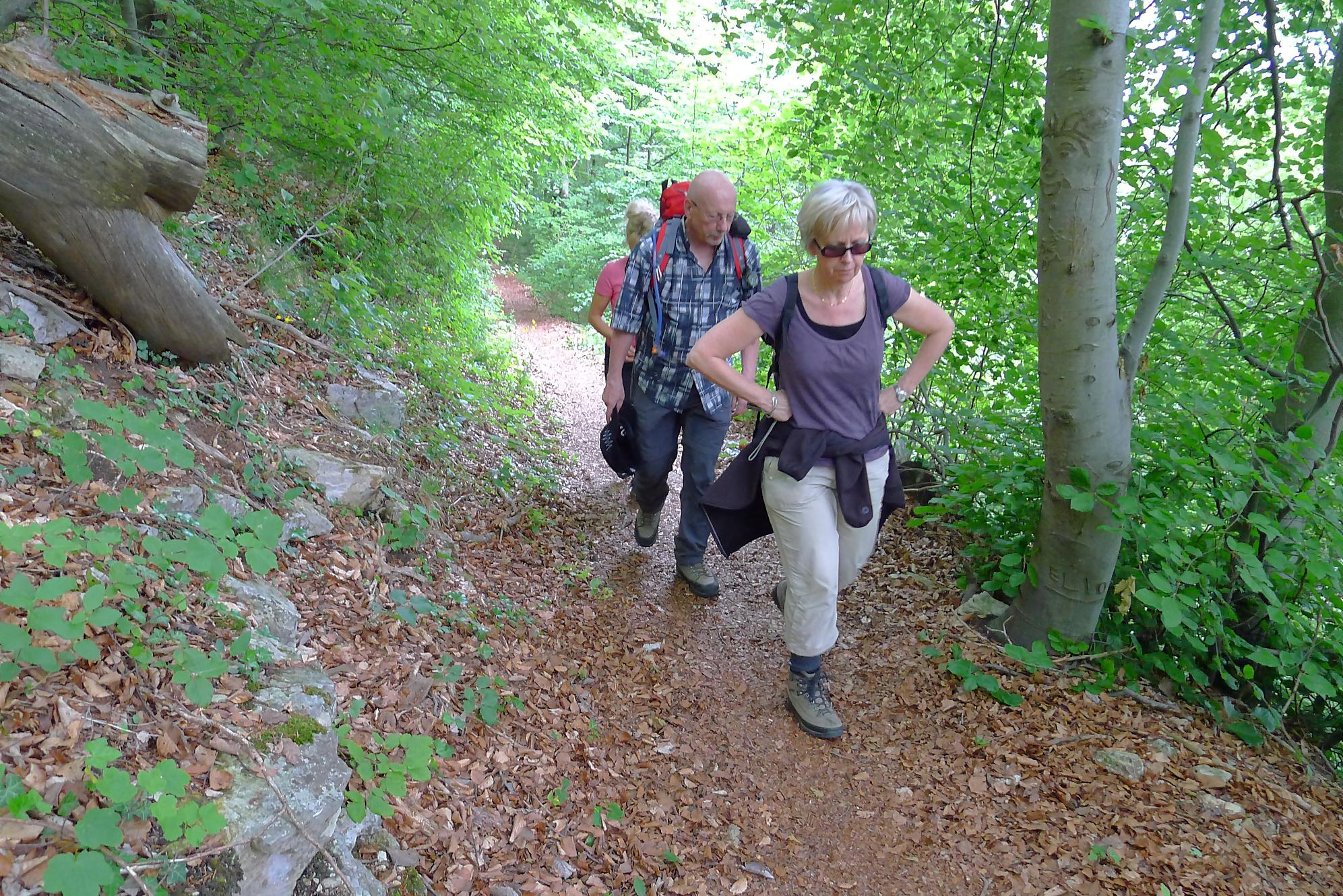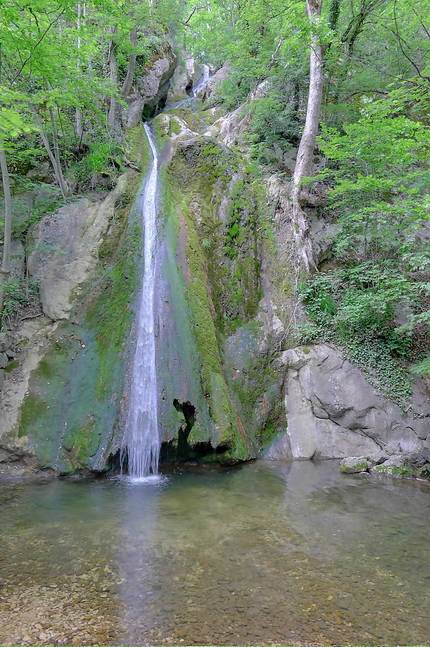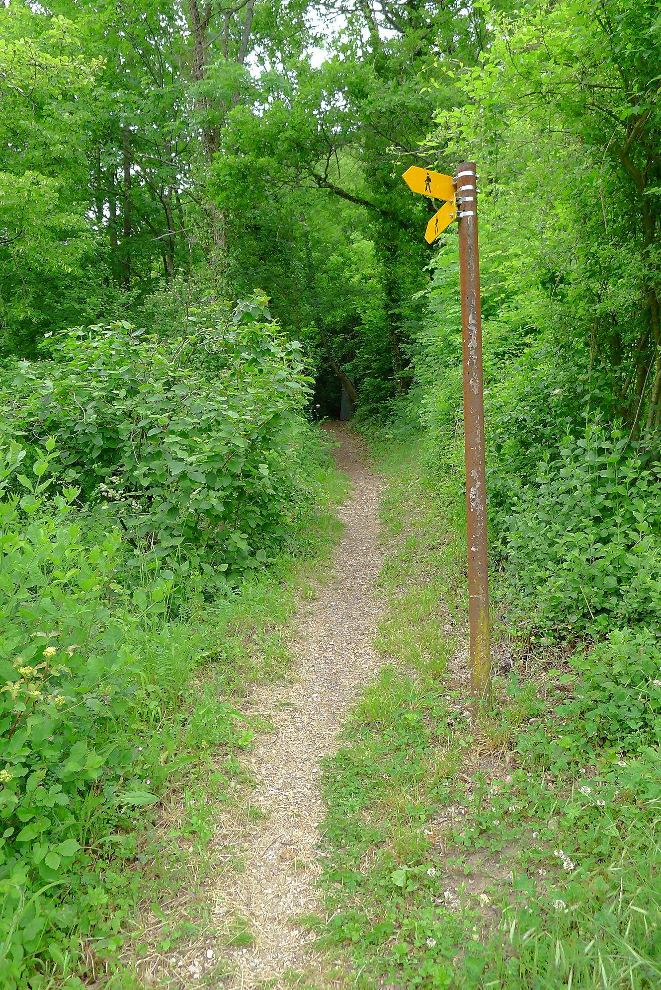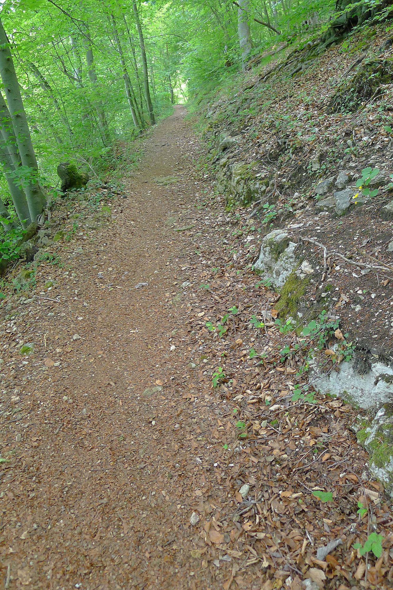 Pour nous, nous continuons. Après avoir suivi la tangente de la route, nous montons par un chemin doux à travers la forêt, dans la Combe du Pilouvi. Là le ruisseau est à sec. Vers la fin de la combe, la pente se redresse un peu et nous venons longer une falaise qui se franchit par un escalier tout neuf.