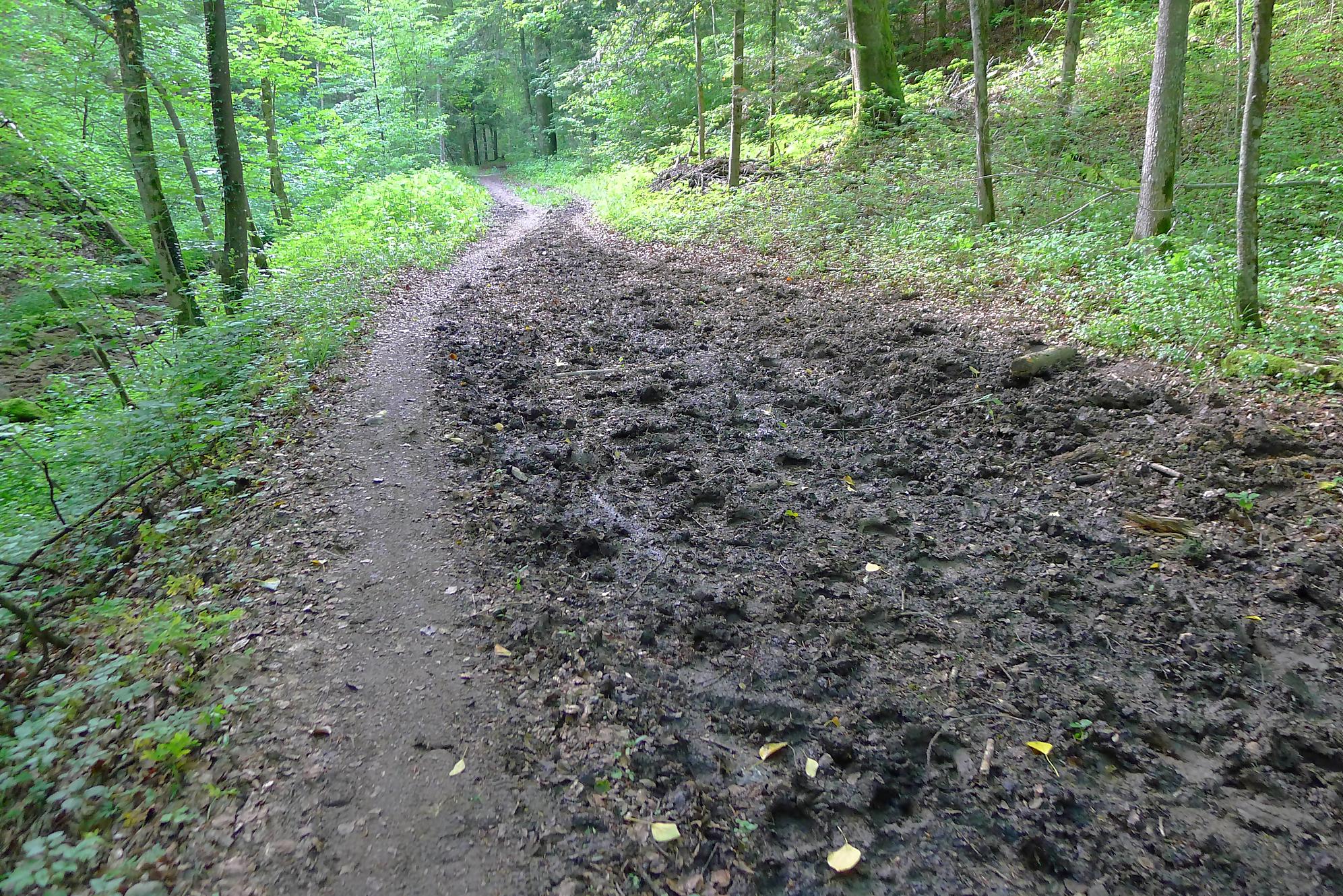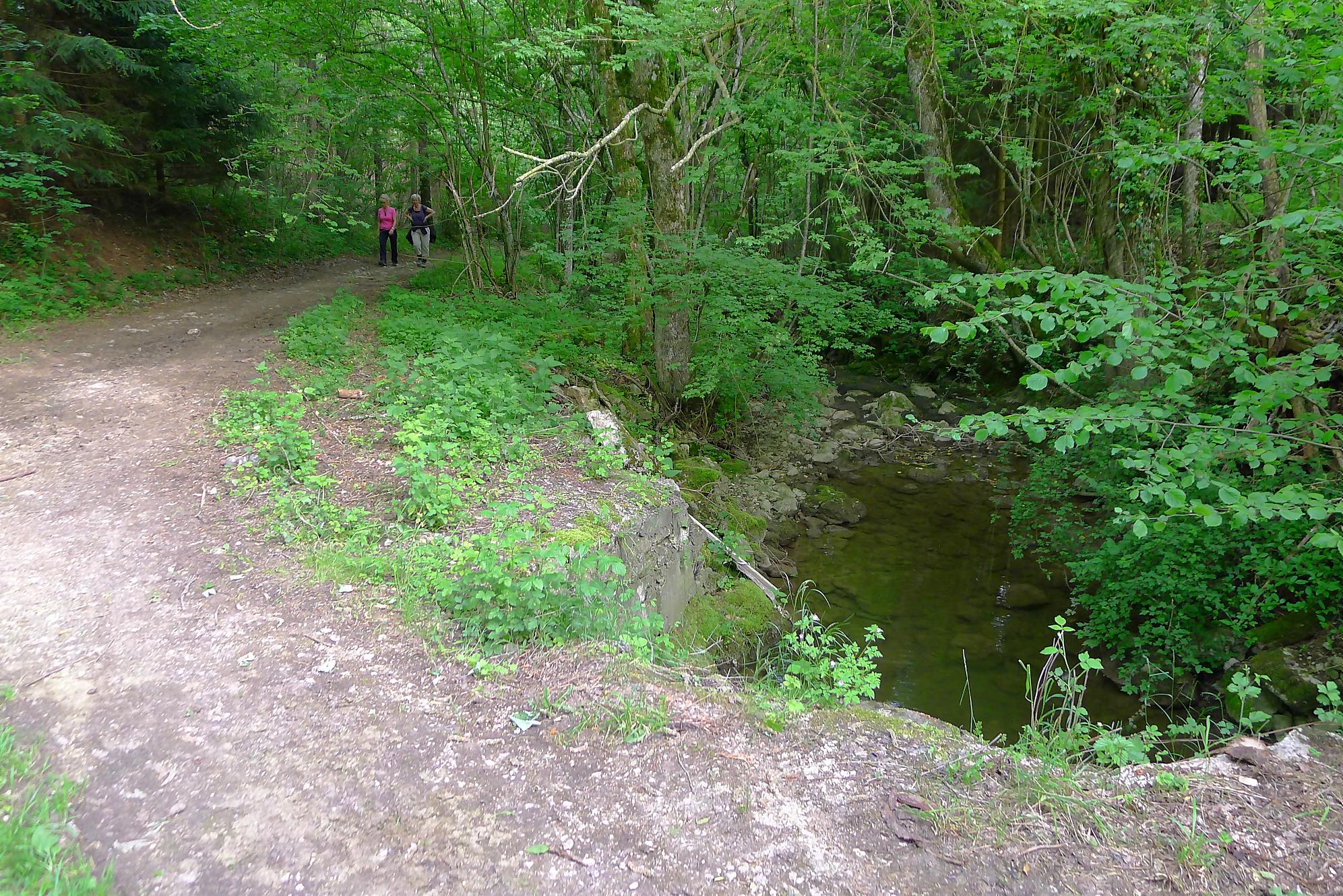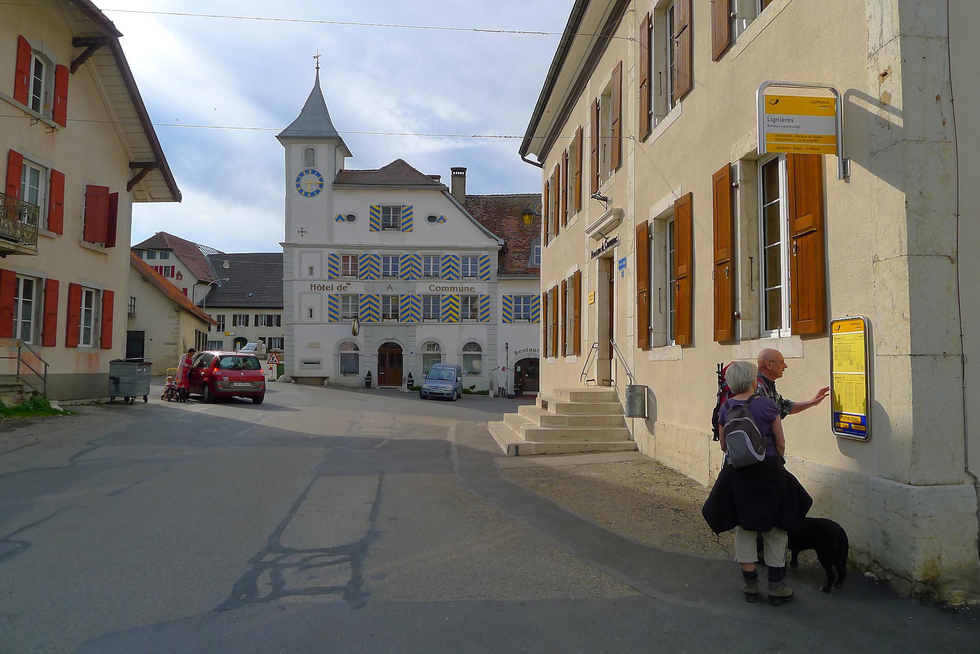 Ensuite direction Lignières par un chemin en forêt tout doux. Là le ruisseau est à nouveau en eau (il semble que l’eau soit canalisée entre les deux) et nous passons la frontière Berne->Neuchâtel pour arriver à Lignières.