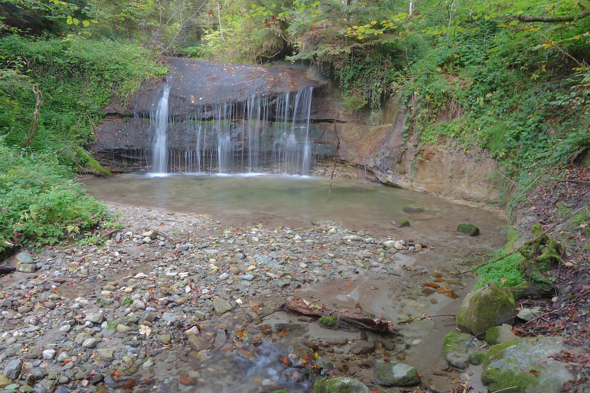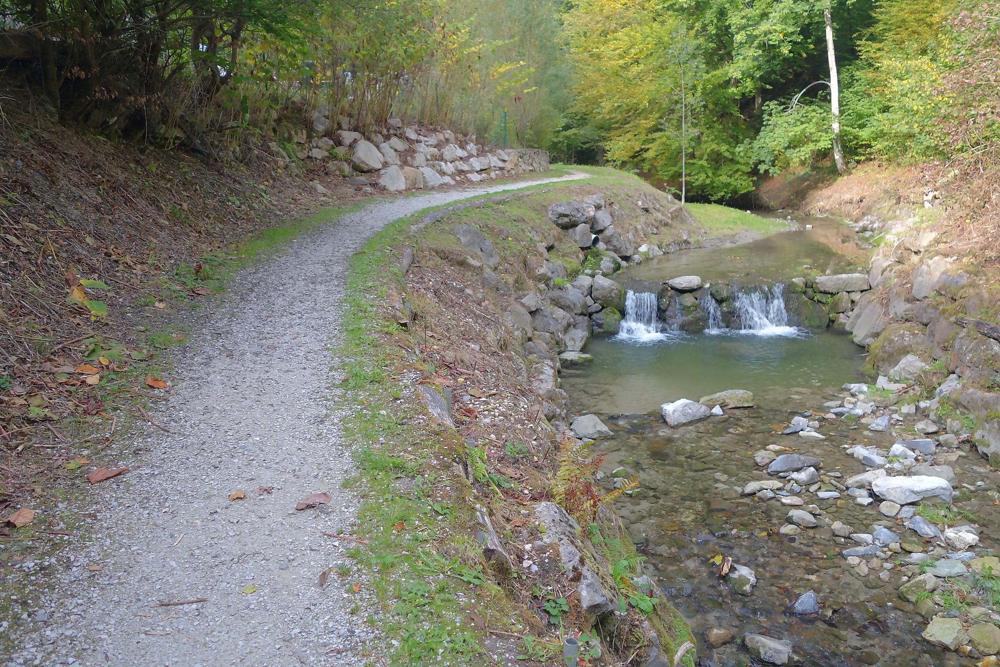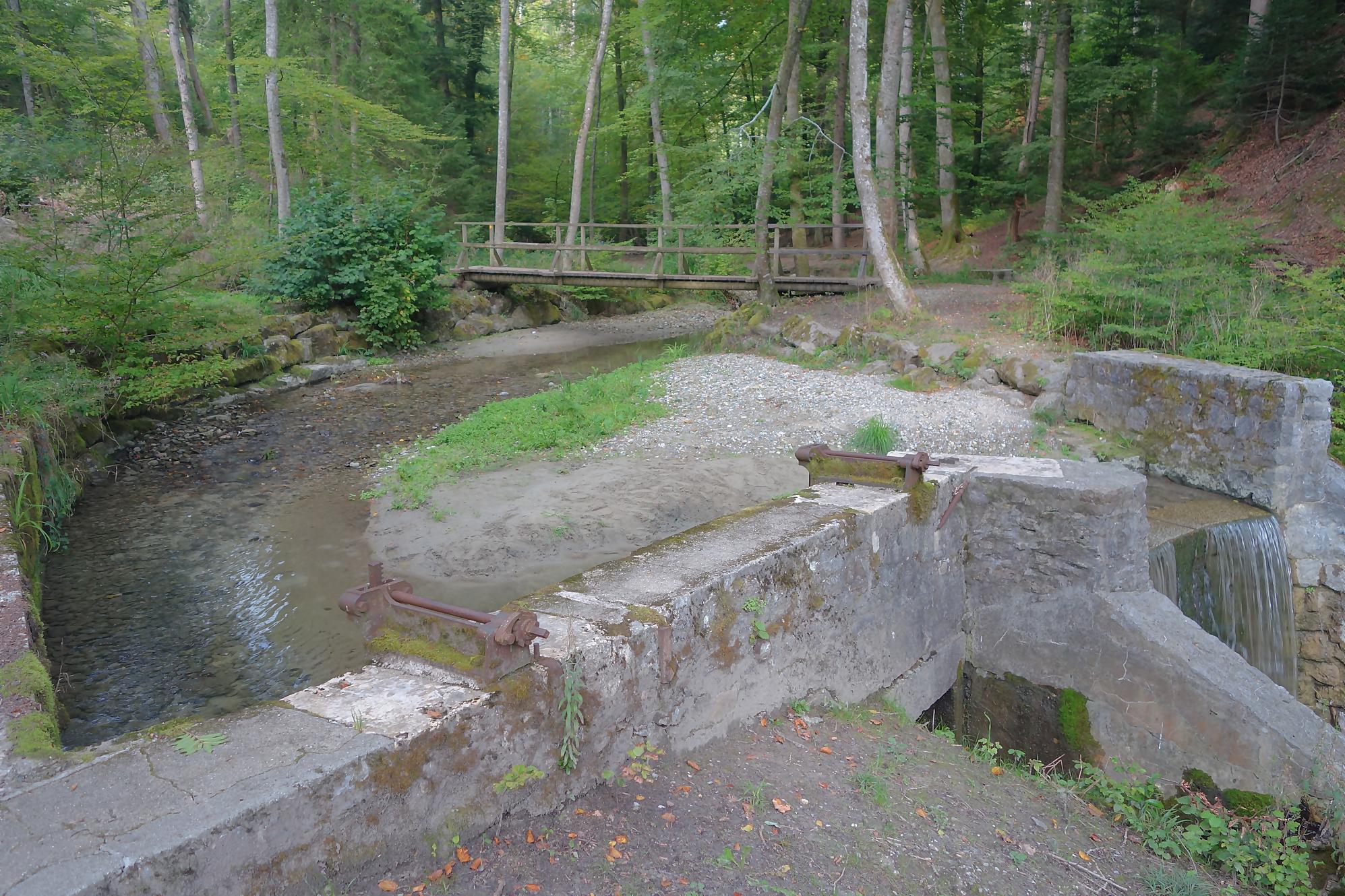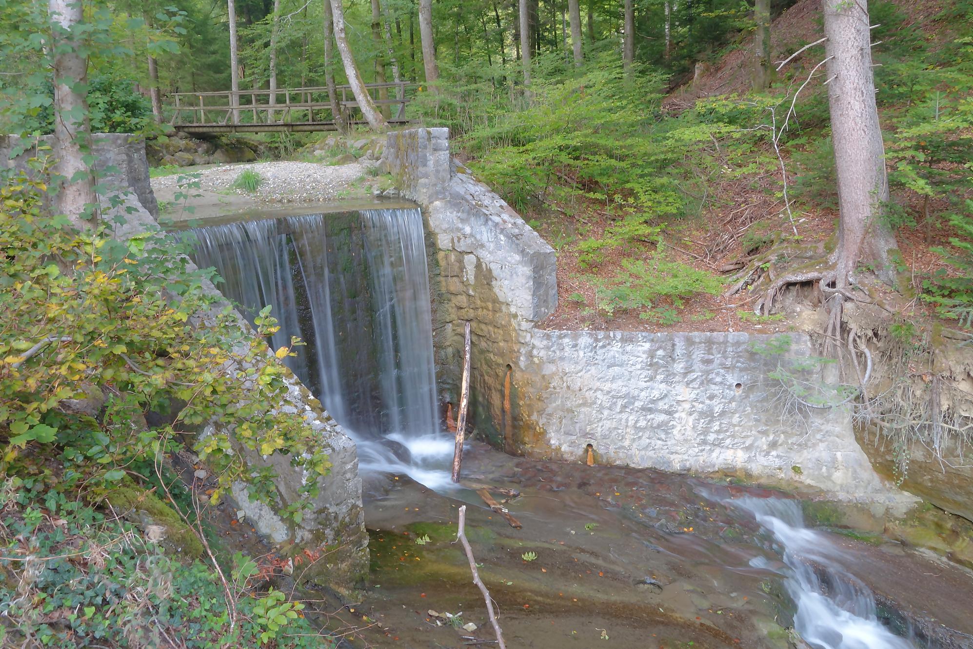 Je poursuis, le chemin devient un peu érodé, mais la molasse affleurante rend les lieux mignons. On revient à la civilisation pour passer devant le vivarium de Lausanne et sous l’autopont. L’émotion m’étreint devant tant de beauté au goût soviétique ! Je continue en forêt et découvre le reste d’une retenue d’eau pour un barrage d’un moulin. Cherchez dans l’eau, il y a des traces. Le chemin serpente en forêt dans un chemin bien aménagé. Une nouvelle fois, une petite cascade bien jolie. C’est le Sentier du Flon avec ses 21 passerelles en bois. J’ai vu quelques poissons (pas réussi à les reconnaitre !) de petite taille dans une partie plus profonde du ruisseau. Sous La Picholette, un passage sous la route pour passer devant les restes d’une pisciculture (bisse, bassin). La balade se poursuit sur un sentier style Piste Vita. On suit toujours Le Flon, avec les bouches (style bouches d’égout) de la canalisation, pas des plus charmant.