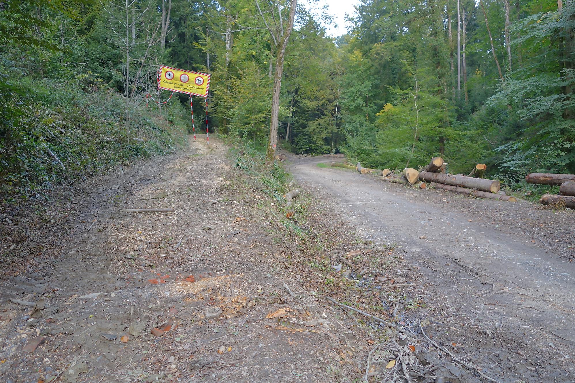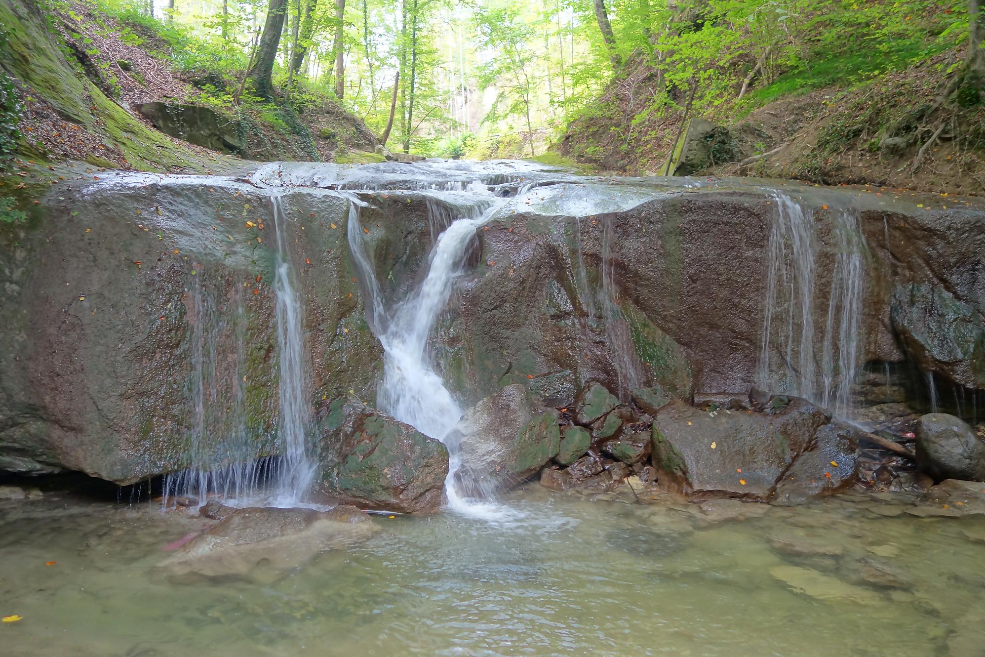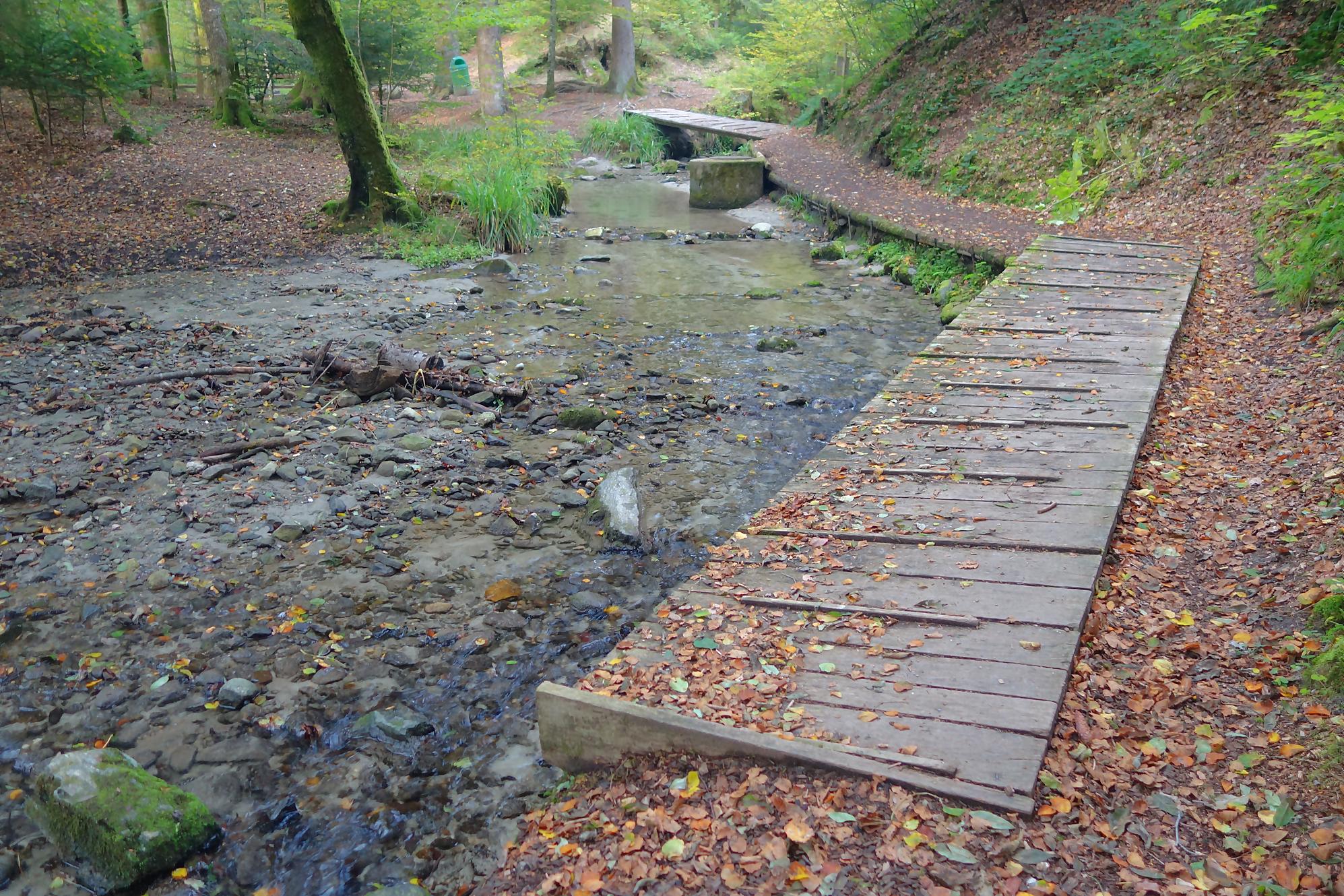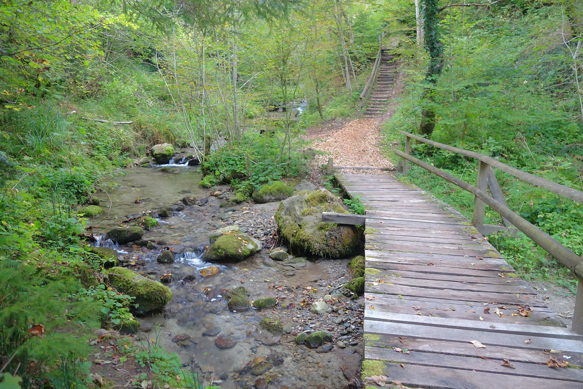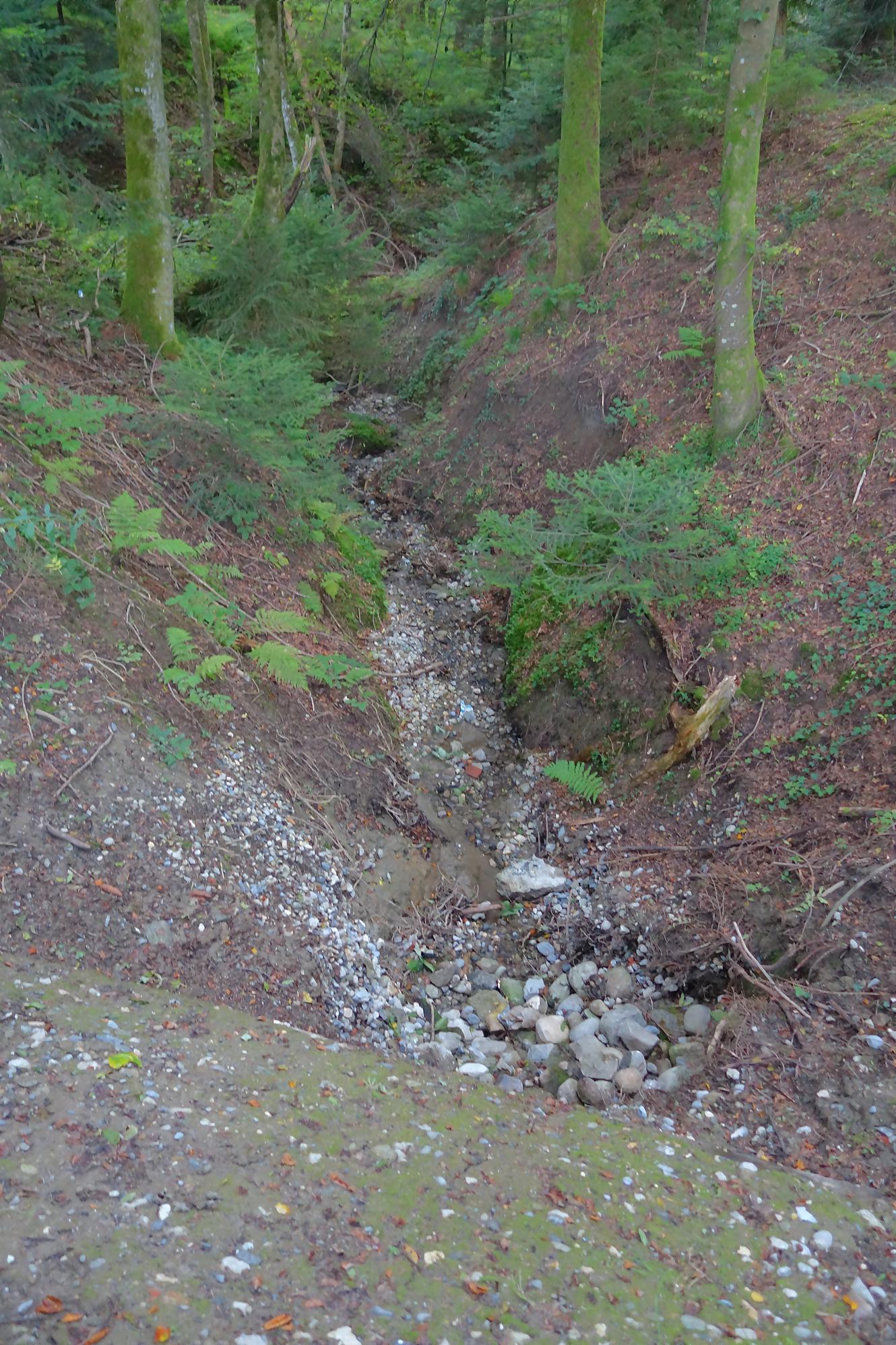 Je poursuis, le chemin devient un peu érodé, mais la molasse affleurante rend les lieux mignons. On revient à la civilisation pour passer devant le vivarium de Lausanne et sous l’autopont. L’émotion m’étreint devant tant de beauté au goût soviétique ! Je continue en forêt et découvre le reste d’une retenue d’eau pour un barrage d’un moulin. Cherchez dans l’eau, il y a des traces. Le chemin serpente en forêt dans un chemin bien aménagé. Une nouvelle fois, une petite cascade bien jolie. C’est le Sentier du Flon avec ses 21 passerelles en bois. J’ai vu quelques poissons (pas réussi à les reconnaitre !) de petite taille dans une partie plus profonde du ruisseau. Sous La Picholette, un passage sous la route pour passer devant les restes d’une pisciculture (bisse, bassin). La balade se poursuit sur un sentier style Piste Vita. On suit toujours Le Flon, avec les bouches (style bouches d’égout) de la canalisation, pas des plus charmant.