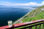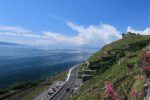 Les vignes se font plus escarpées et la route monte légèrement. Il y a un point de vue avec des bancs et une petite buvette qui vend des apéritifs et vins à déguster. Va pour une dégustation. L’occasion de la pause casse-croûte. Les moineaux sont de la partie. Quelle vue sur le Léman.