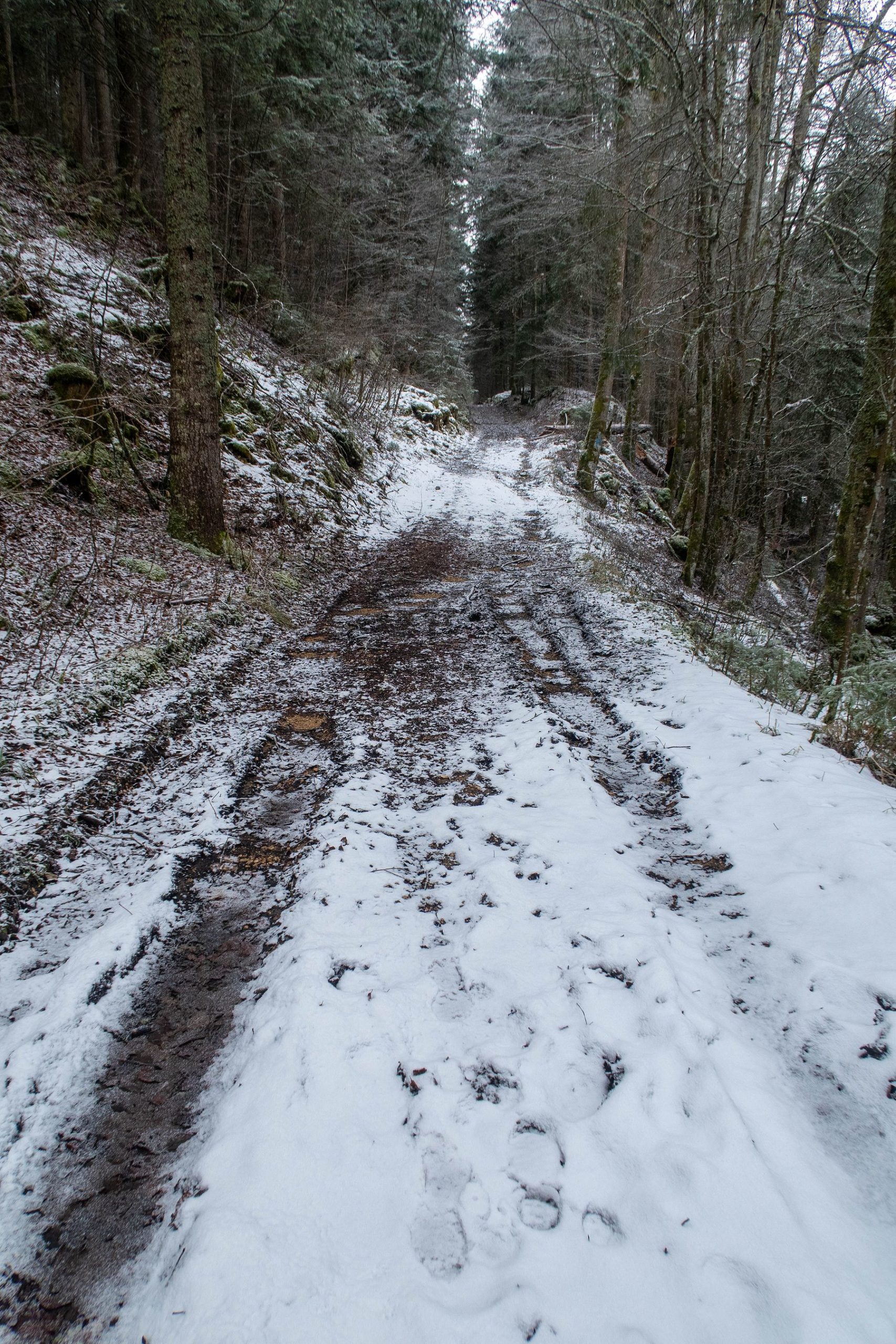 Pentu ce départ, avec le chargement, on apprend à gérer le rythme. Une bifurcation et nous poursuivons tout droit. La neige fait timidement son apparition. Le secteur a du charme, entre le vert des arbres et un peu de blanc de la neige. Le sentier fait un arc de cercle, la neige est de plus en plus présente. Il y a bien des traces d’animaux ici (lièvre, cervidé).