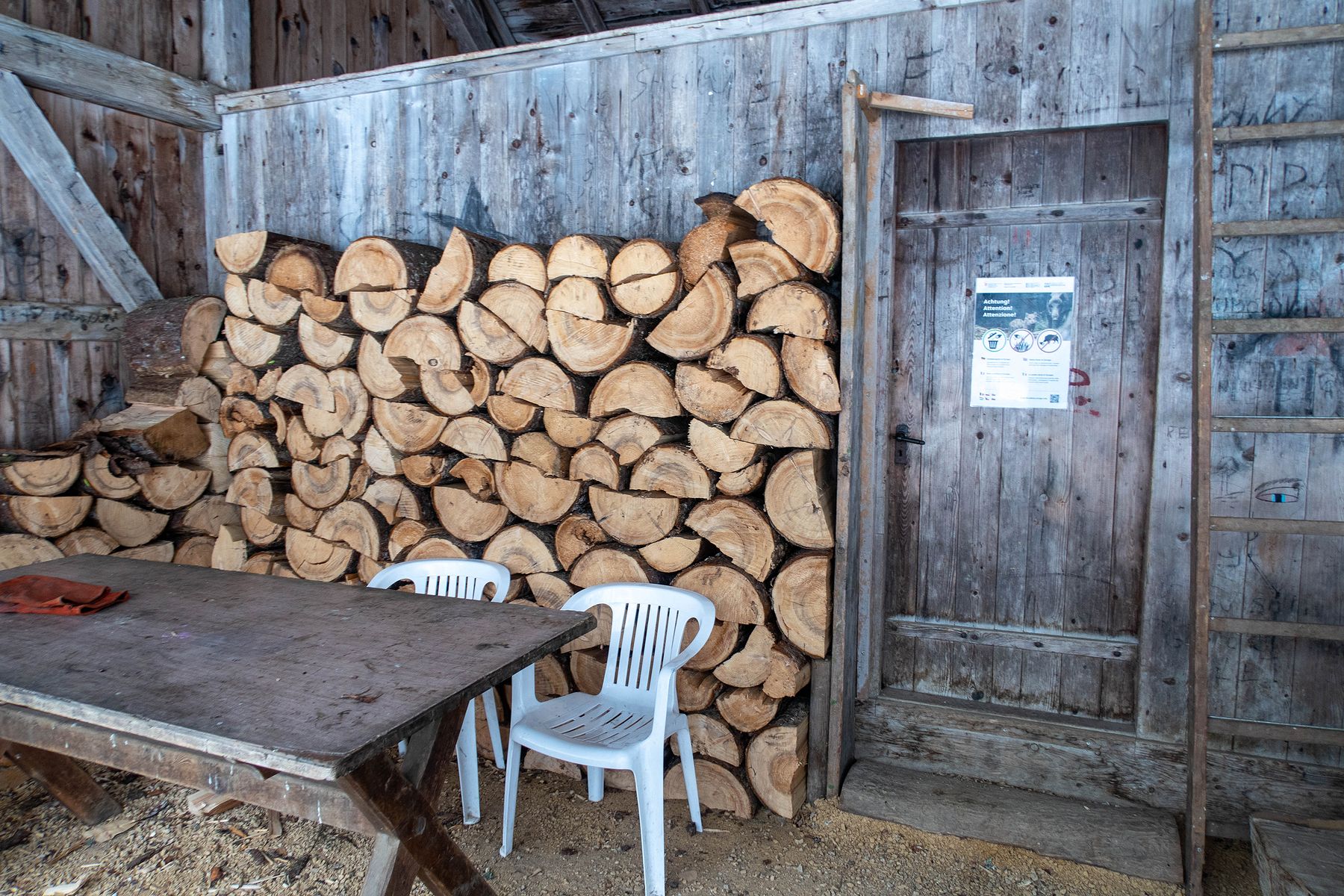 Après cette ferme, il faut partir sur la droite, toujours sur la route. On s’enfonce en forêt, joli. La traversée de la forêt est courte et nous en sortons assez rapidement. Nous voilà dans une vaste clairière. Un dernier petit effort et nous voilà au Couvert des Creux. Modeste abri, mais le bois (à couper avec la hache à disposition) est présent. Pour l’eau, la neige est présente. Il y a un petit fourneau, poussif.